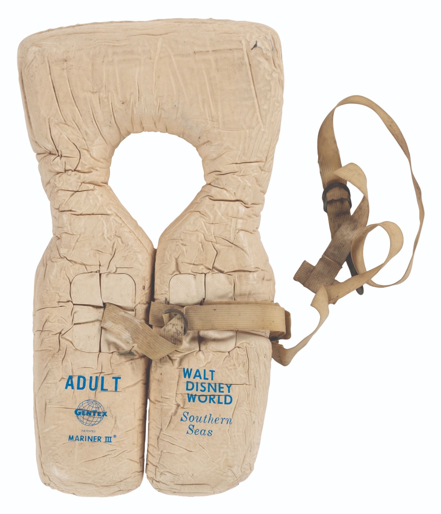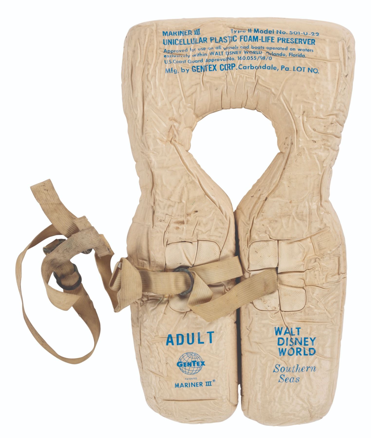 (Walt Disney World, 1970s-1980s) A Gentex Mariner III Walt Disney World Southern Seas adult life vest. The Southern Seas was one of the original ferry boats that brought Guests across the Seven Seas Lagoon to the Park entrance. Measuring 11.5” x 21”, the life vest is in fair condition with heavy wear, stains, and discoloration from use.
