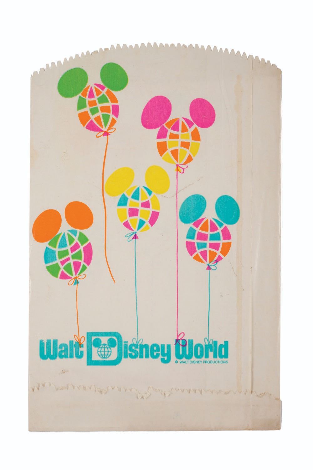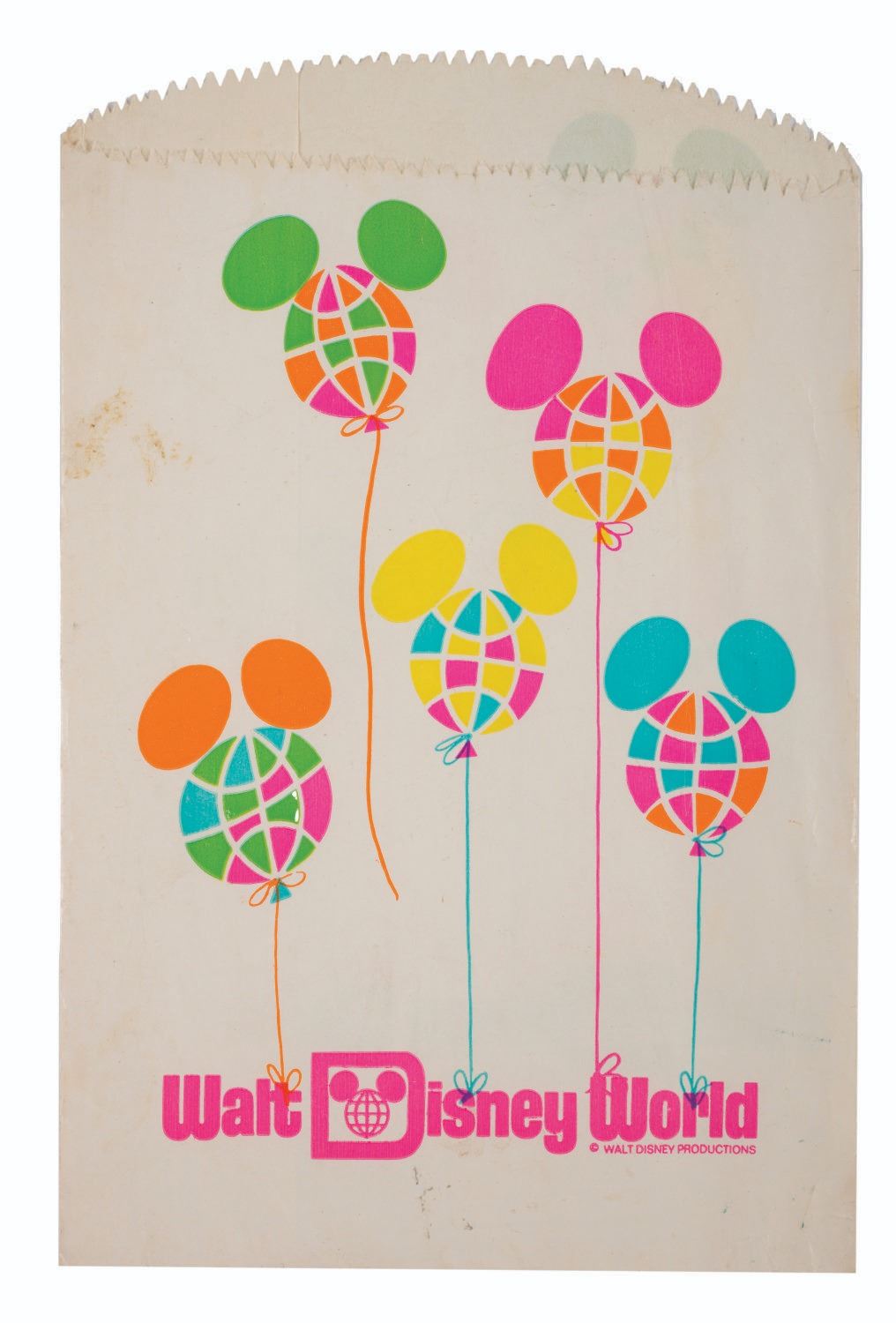 (Walt Disney World, 1970s-80s) A small paper gift bag from Walt Disney World featuring the Park’s logo as balloons. Measuring 5.5" x 8.5", the bag displays in good condition with light edge wear and creasing, stains, and scuffs.