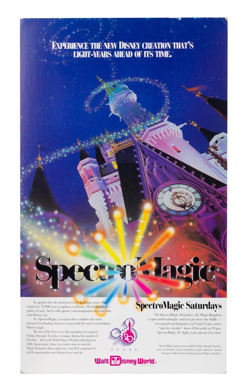 (Walt Disney World, 1991) A Walt Disney World SpectroMagic Display. This countertop standee display advertised the 20th anniversary nighttime spectacular of The Magic Kingdom at Walt Disney World. Measuring 11”x18.75”, this cardstock piece is in very good condition with unpunched backing and minor wear to its edges and corners.