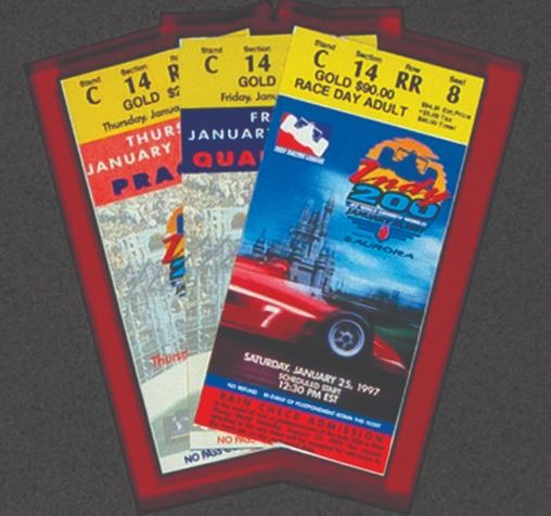 (Walt Disney World, 1997) A collection of 17 items from the Indy 200 racing league event at the Walt Disney World Speedway. This framed set includes tickets, pins, buttons, flattened pennies, and many rare artifacts from the early years of this former Walt Disney World attraction. The items, ranging in size from the 0.5” x 1.5” pennies to the 8.25” x 10” starting line-up page, are displayed in a glassless 34.75" x 40.75" custom frame. The collection is in fine condition with light scuffs to the frame. Due to size and weight, this item requires special shipping arrangements. Please inquire before bidding.
