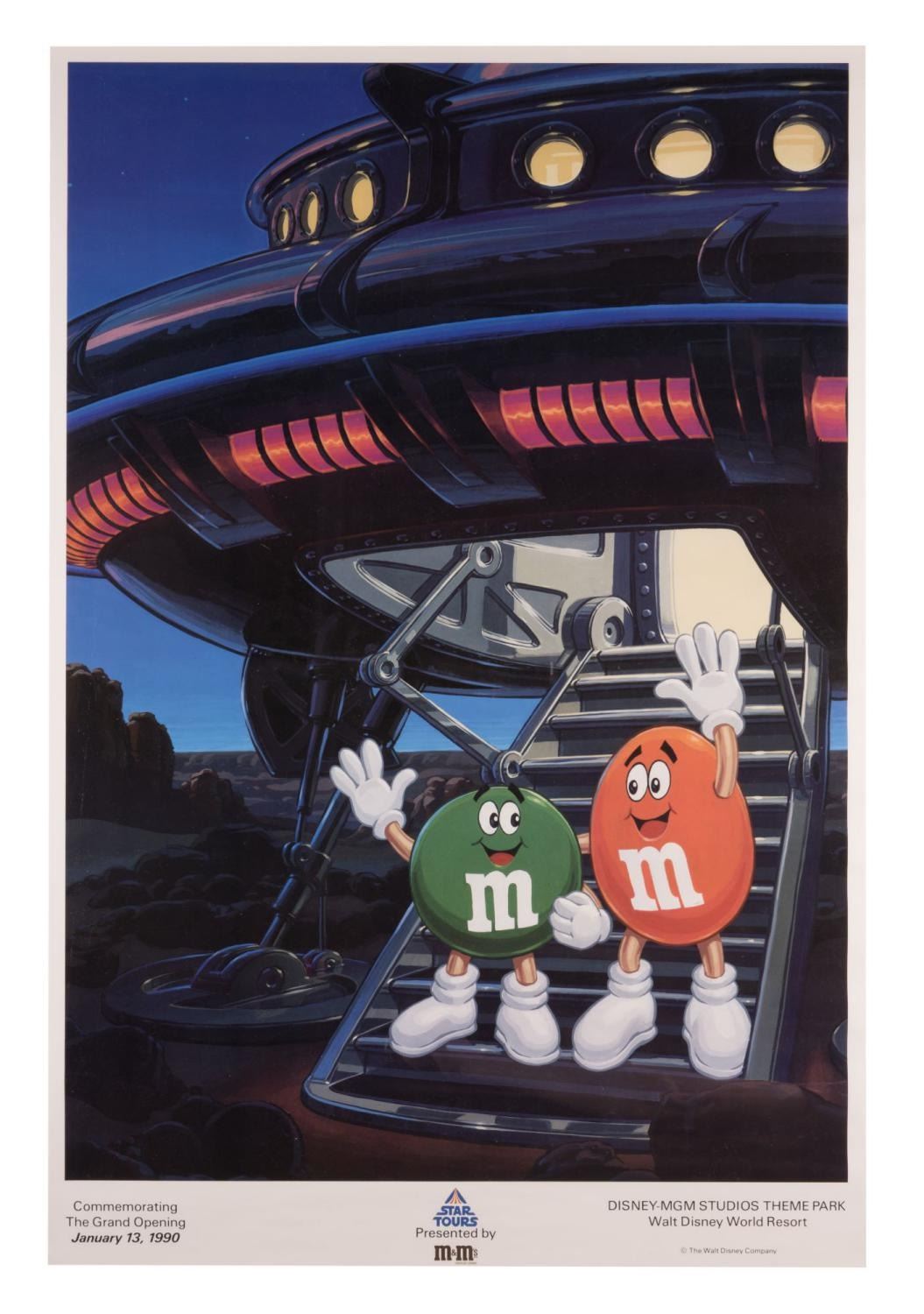(Disney-MGM Studios, 1990) A Star Tours grand opening poster featuring M&M’s, the official sponsor of the attraction. Measuring 24" x 36", the poster was stored rolled and is in fine condition.