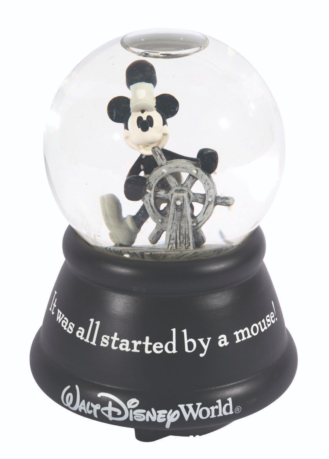 (Walt Disney World, 1990s-2000s) A Walt Disney World “It was all started by a mouse” snow globe featuring Mickey Mouse as Steamboat Willie. When wound, the globe plays “The Mickey Mouse Club March,” and worked when tested. Measuring 5.25” tall and 3.75” in diameter, the snow globe is in very good condition with light scuffs and wear.