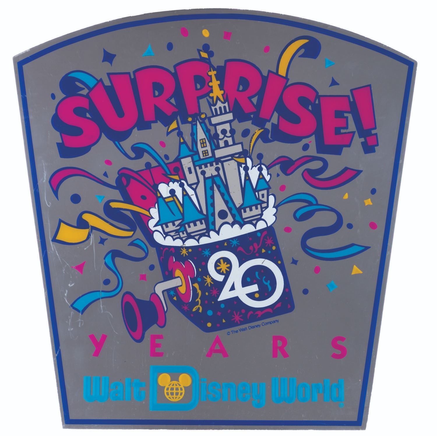 (Walt Disney World, 1991) A die-cut lamppost sign celebrating Walt Disney World's 20th anniversary.Measuring 21.25" x 22.25", the mirrored acrylic sign is in fair condition with heavy scratches throughout and wear from Park use, with hanging materials installed on the reverse.