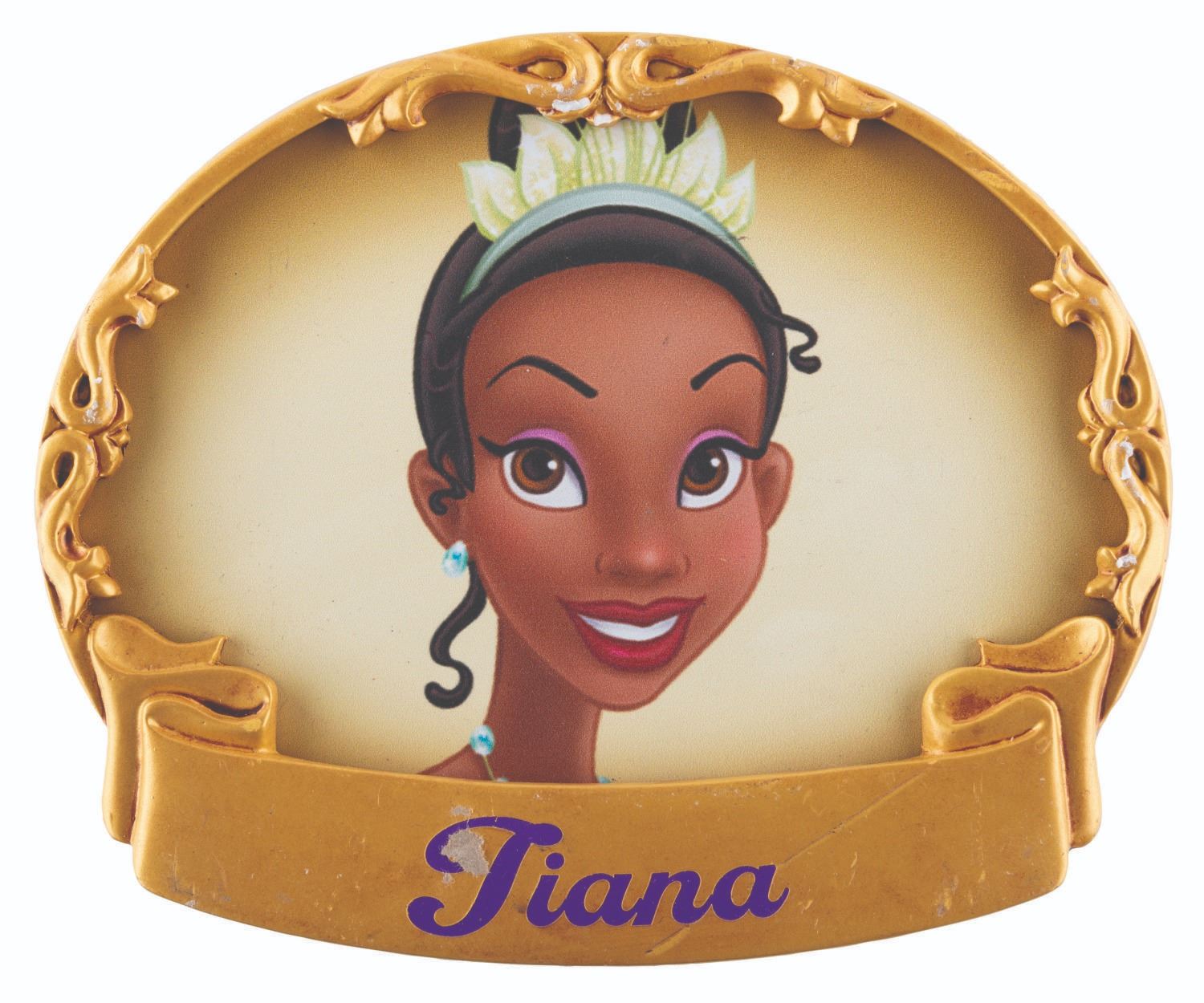 (Walt Disney World, 2013) A small portrait sign from the Tiana meet and greet at Princess Fairytale Hall in the Magic Kingdom. "The Princess and the Frog" star's portrait would be displayed on a FastPass entrance sign when she was ready to greet Guests. Measuring 8” x 9.5”, the sign is in good condition with a 3” scratch on the nameplate, additional scratches, scuffs, stains, and paint loss from Park use.