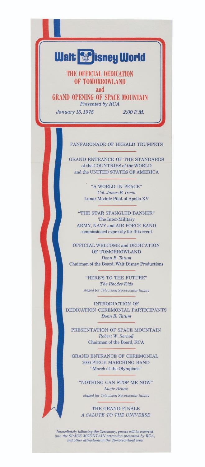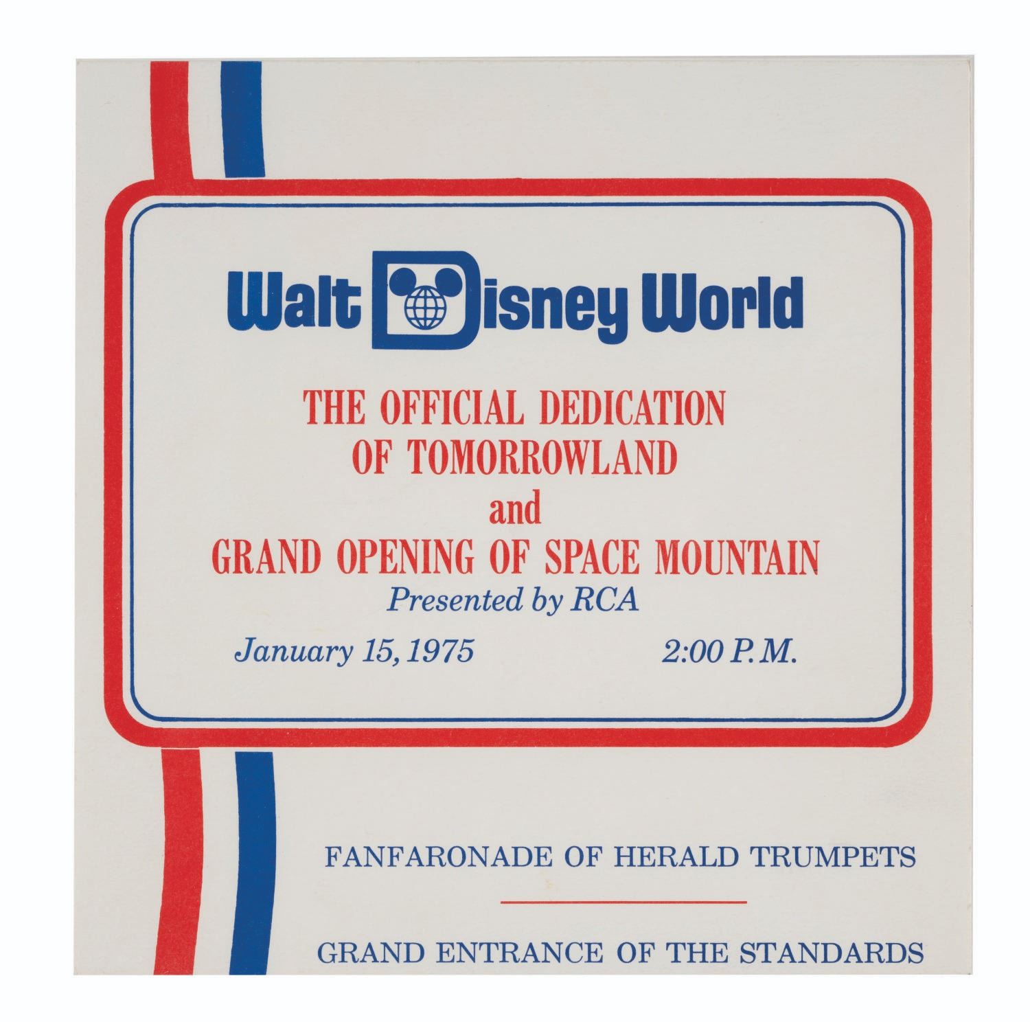 (Walt Disney World, 1975) A Walt Disney World Tomorrowland Dedication Program. This rare tri-fold program was issued exclusively to attendees and lists the related bands, guests, and events related to the Grand Opening of Space Mountain and Dedication of Tomorrowland. Measuring 6.5”x6.75” when folded, this commemorative paper souvenir is in a fine condition.