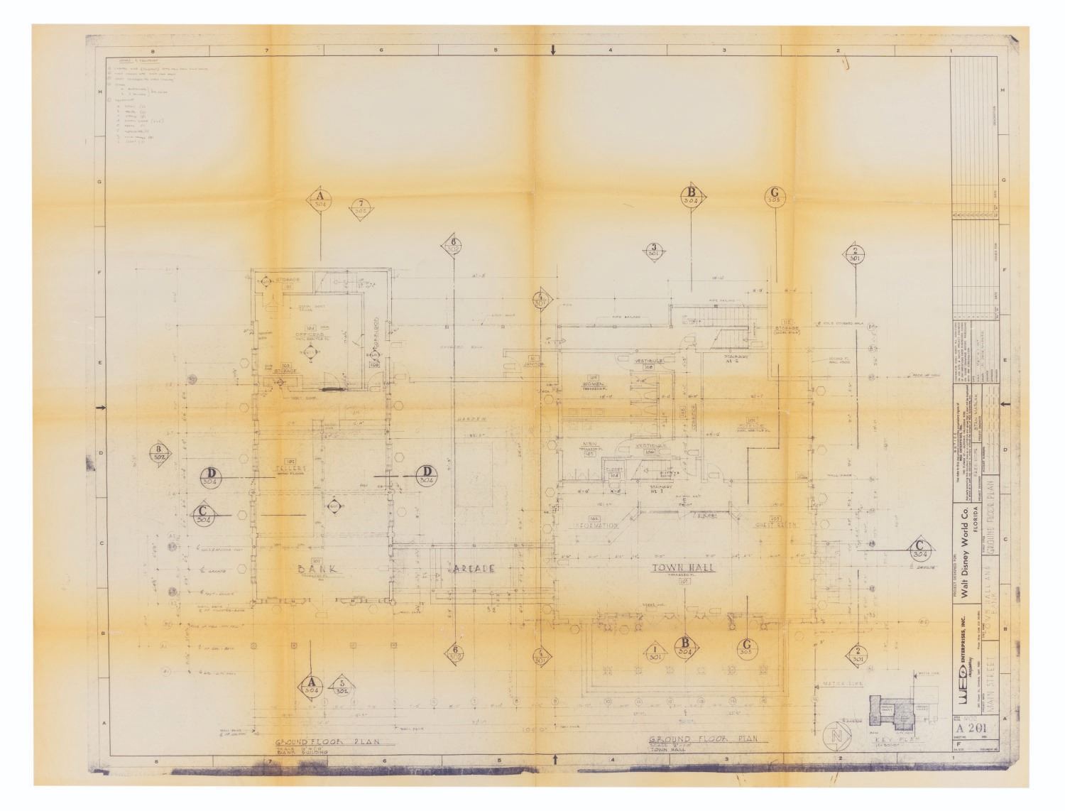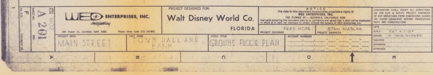(Walt Disney World, 1960s) A Walt Disney World blueprint for the ground floor of the Town Hall and Bank on Main Street U.S.A. The plan includes space for Guest Relations and information areas in the Town Hall, and tellers and a vault in the Bank. Measuring 36" x 48", the blueprint displays in good condition with heavy discoloration along the edges and folds, paperclip oxidation stains along the upper and lower edges, and light creasing.