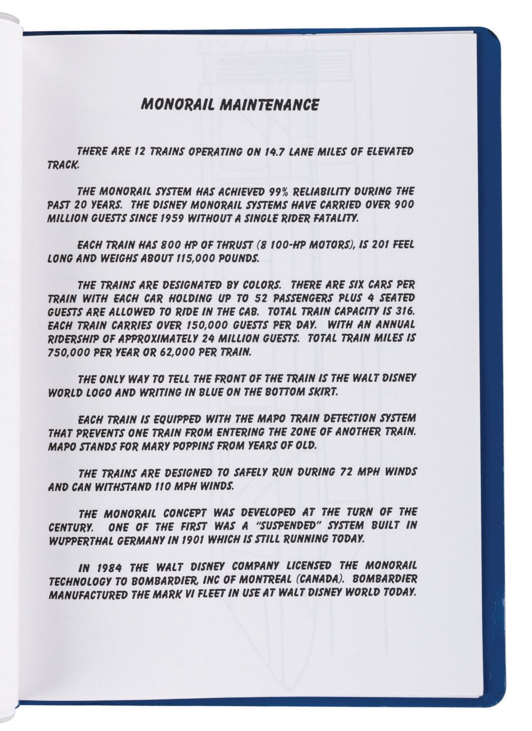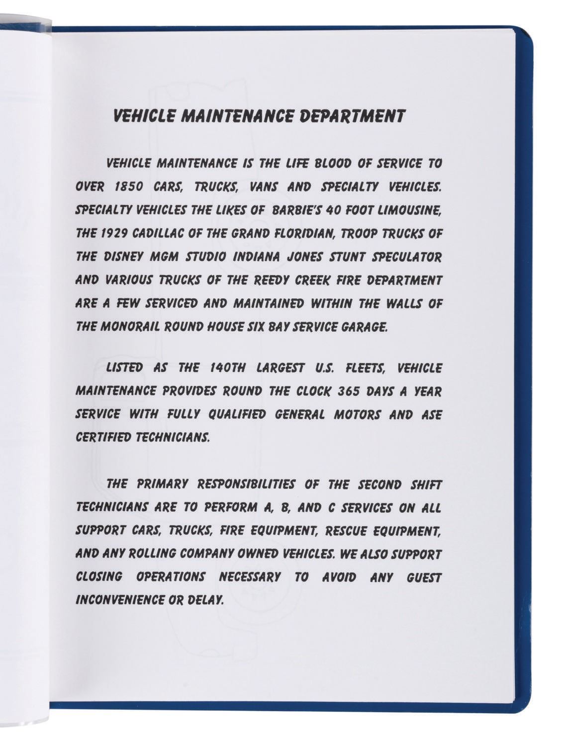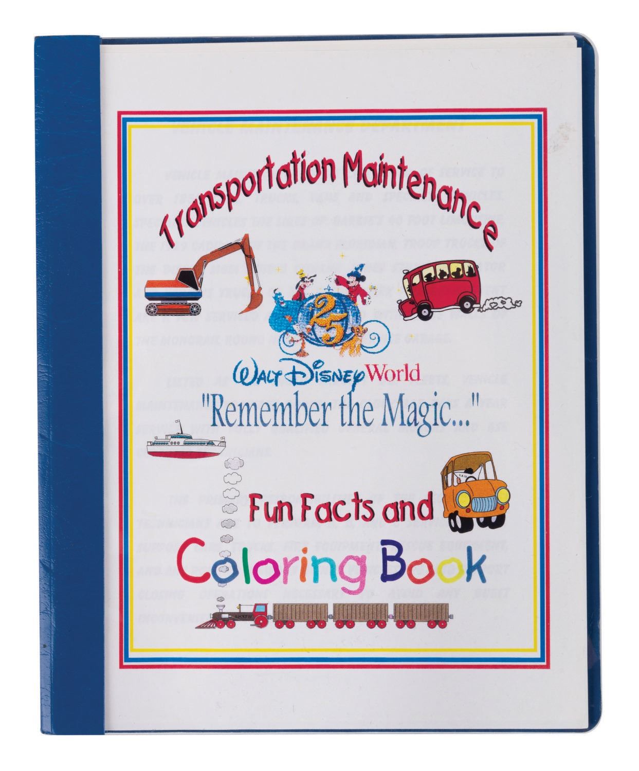 (Walt Disney World, 1996) A Walt Disney World Remember the Magic Transportation Maintenance Fun Facts and Coloring Book. A vintage coloring book created for the seminars and workshops once offered through the Walt Disney World Education Program for Young People. The 25-page guide contains maintenance information and illustrations of the boats, trains, buses, and vehicles utilized by Walt Disney World. Measuring 9.25"x11.5", the pages are preserved in a portfolio cover and are in very good condition with little wear to edges and corners.