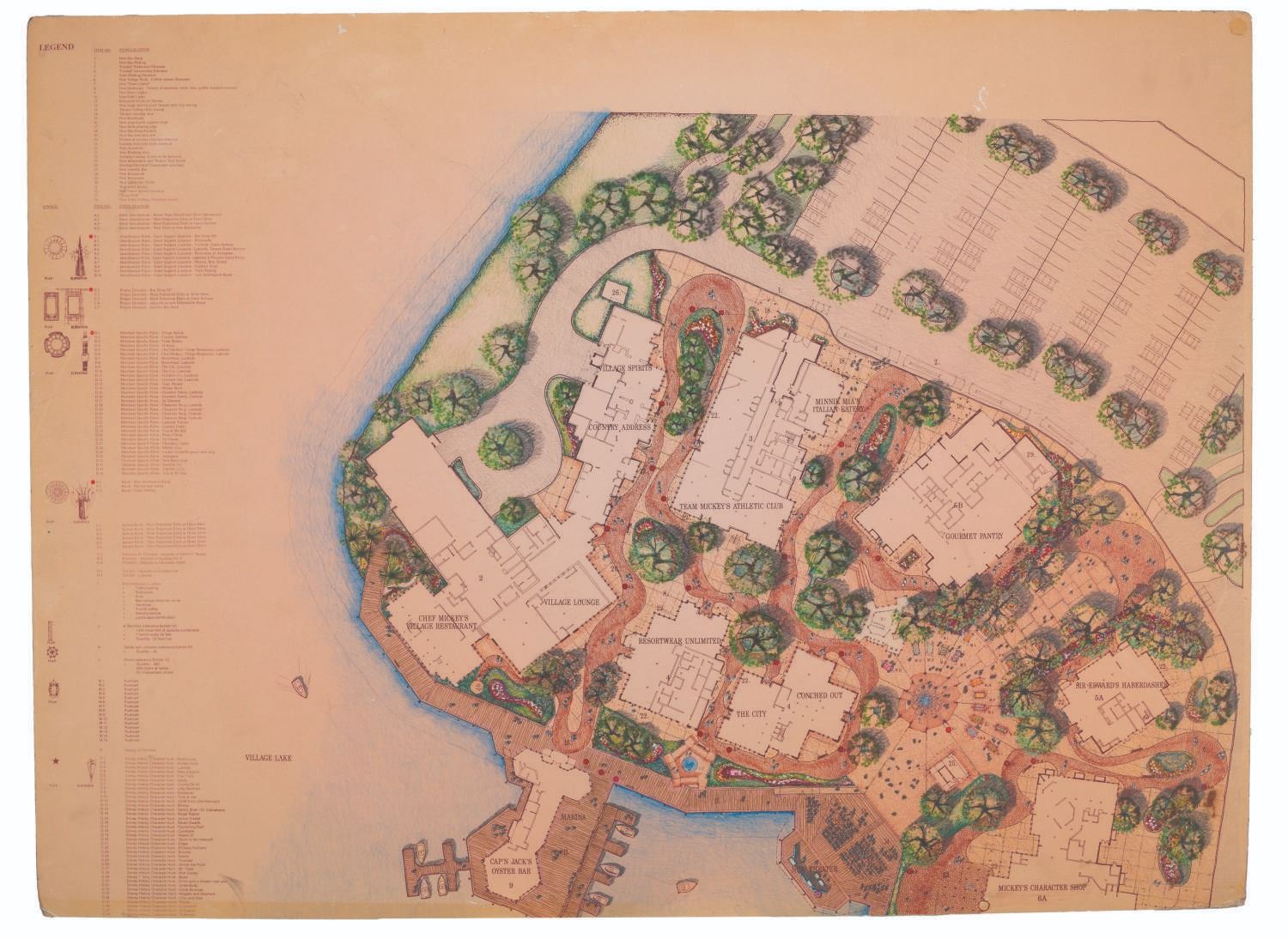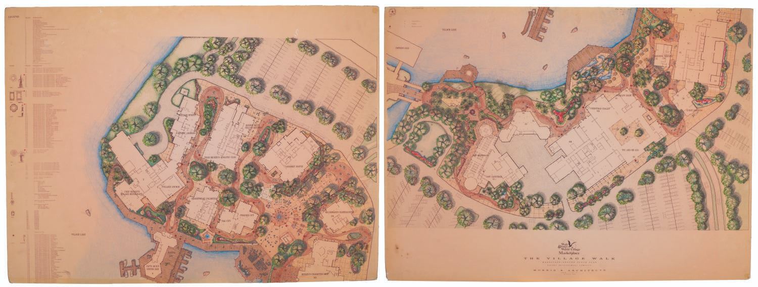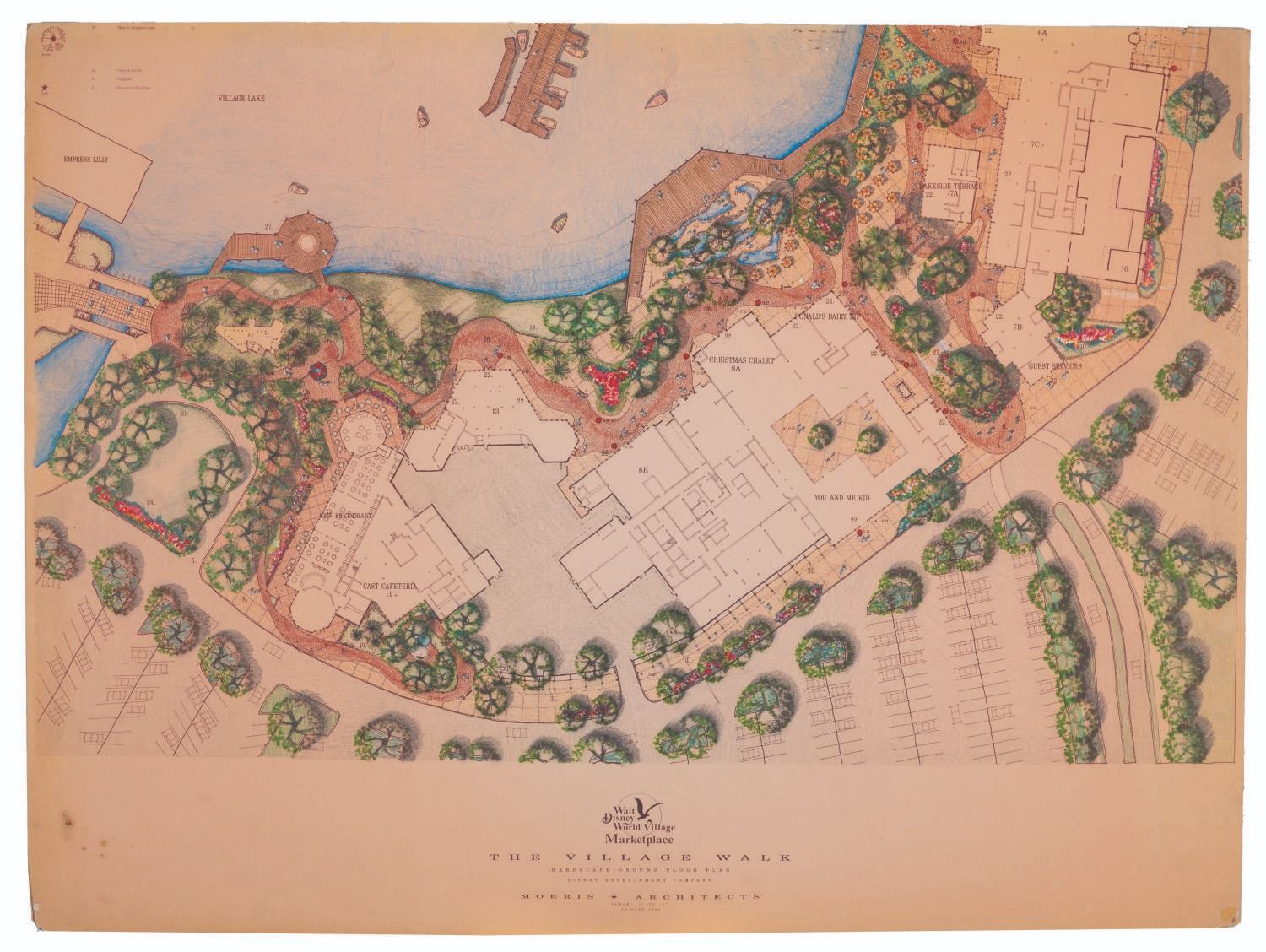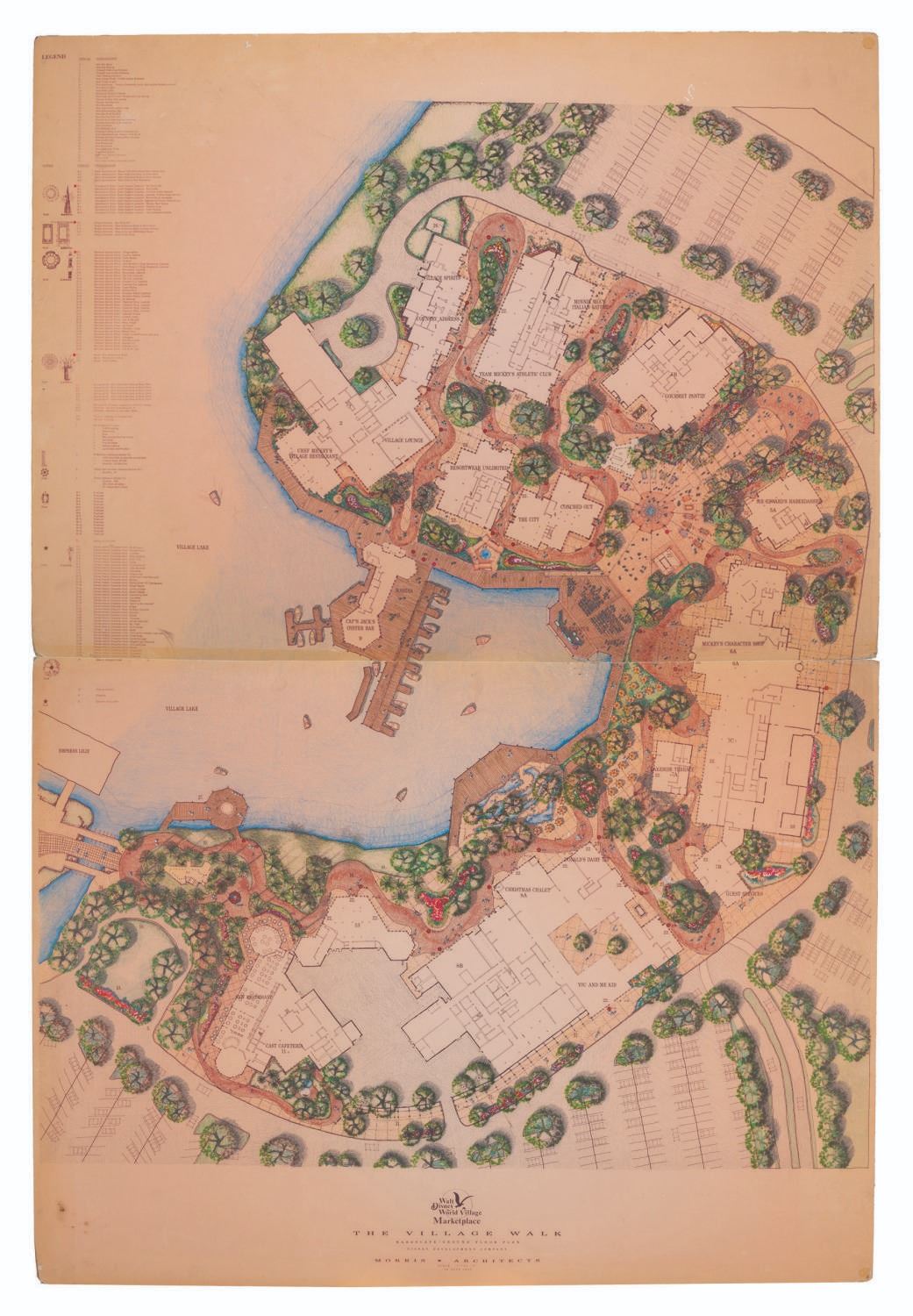 (Walt Disney World, 1992) A pair of presentation boards for The Village Walk at Walt Disney World Village Marketplace. The hardscape ground floor plan by Morris Architects is dated July 24, 1992, and depicts the layout for shops, backstage areas, and the village lake. Measuring 35.75" x 48", the plans display in good condition with heavy scratches, scrapes, stains, discoloration from age, and edge wear.