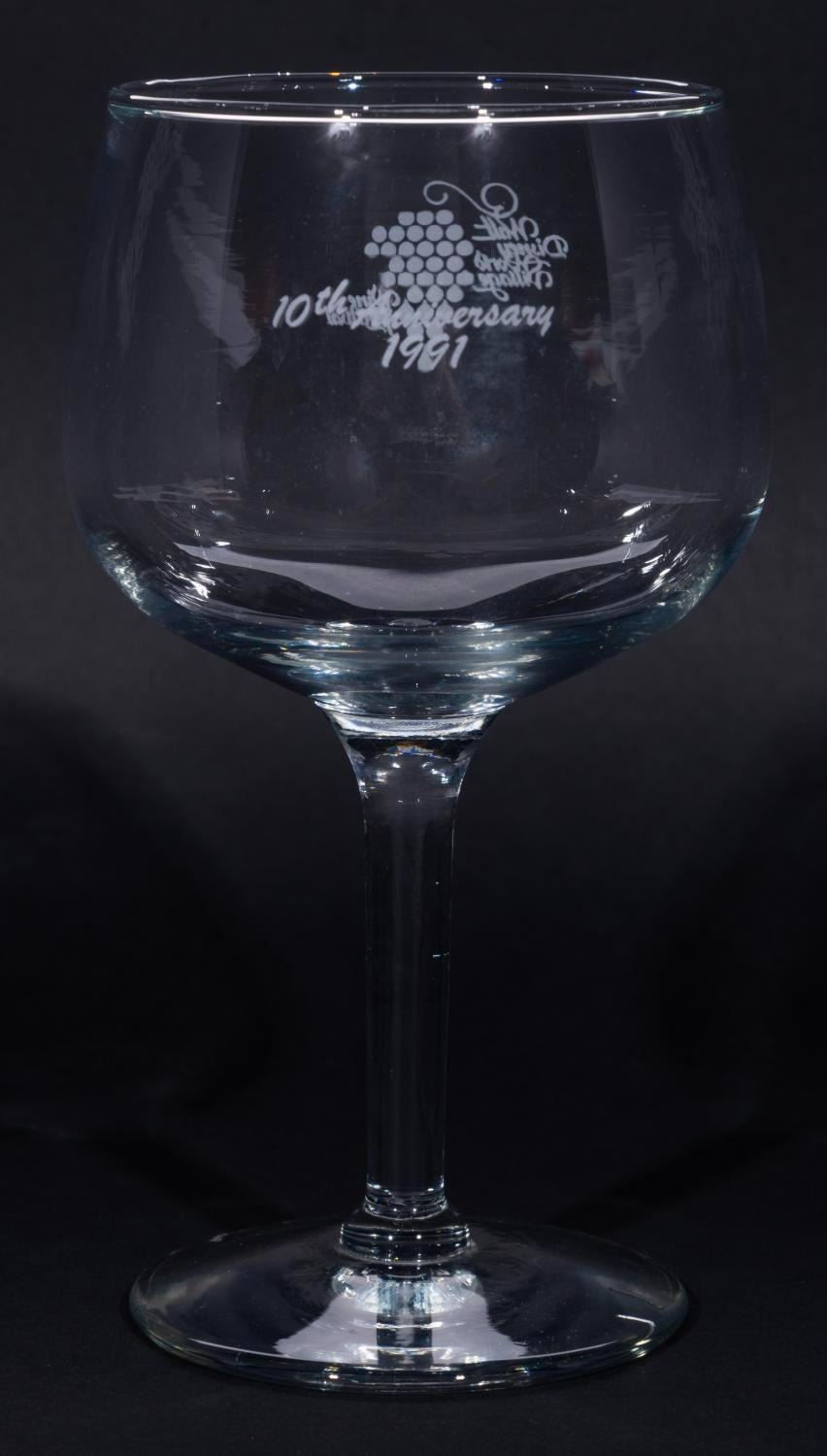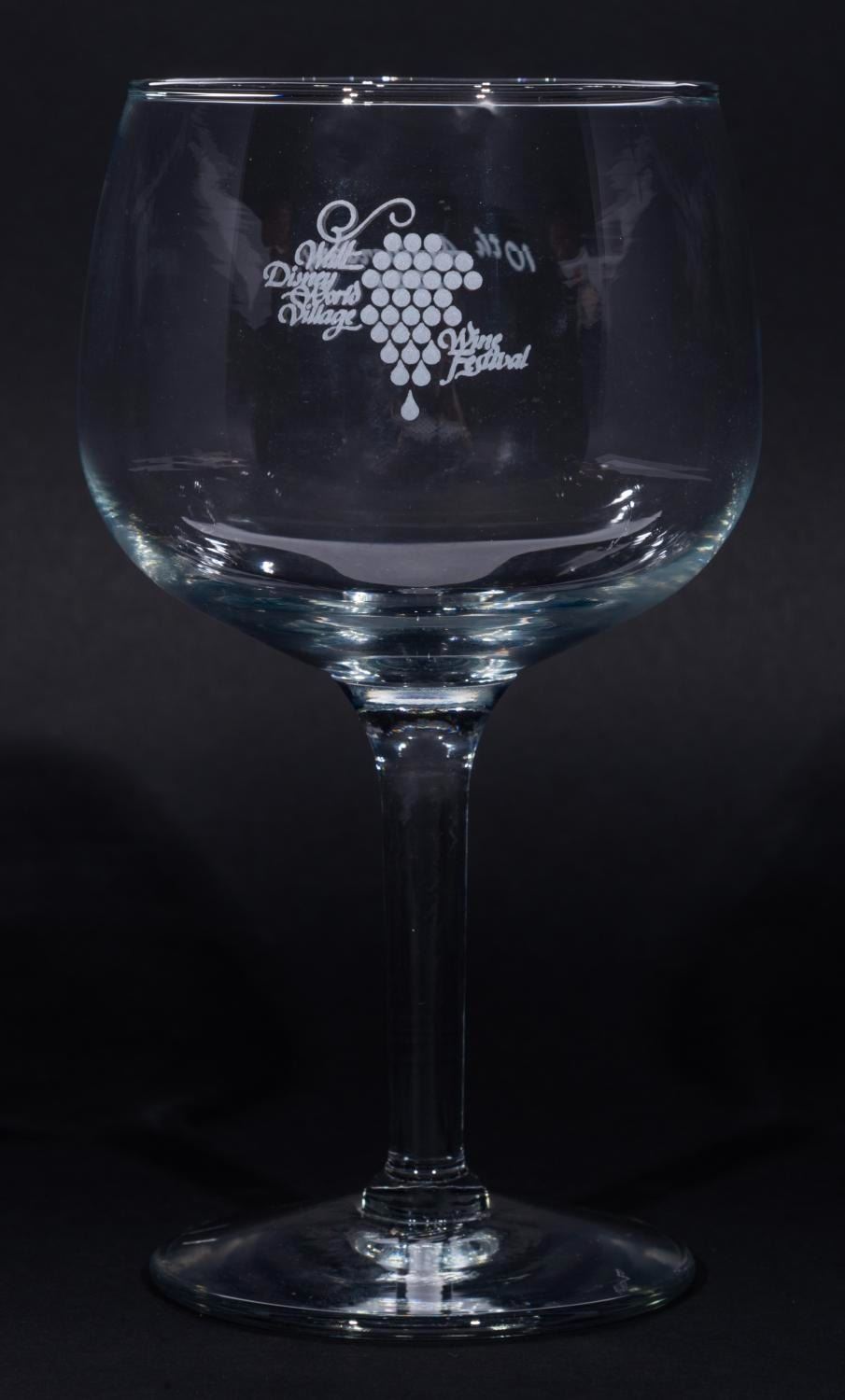 (Walt Disney World Village, 1991) A wine glass from the 10th anniversary of the Walt Disney World Village Wine Festival. Measuring 3.25” in diameter and 6.5” tall, the wine glass displays in very good condition with light scuffs and wear.