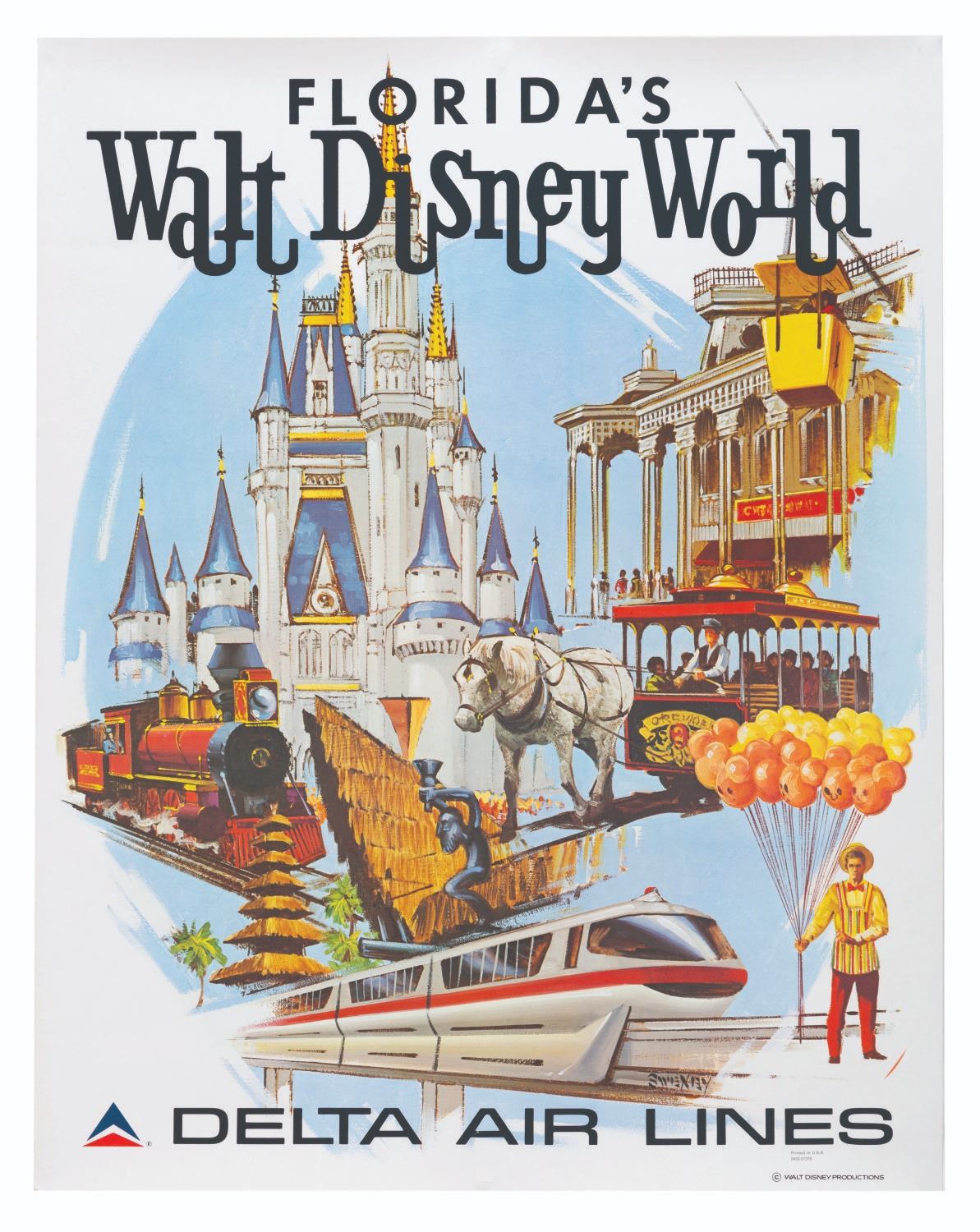 (Walt Disney World, 1971) An extremely rare Delta Airlines travel poster for Walt Disney World, featuring artwork by Dabiel Sweeney. This is the first example of this poster we have ever offered. Measuring 22" x 28", the poster is in very good condition with light edge wear and no major creases.