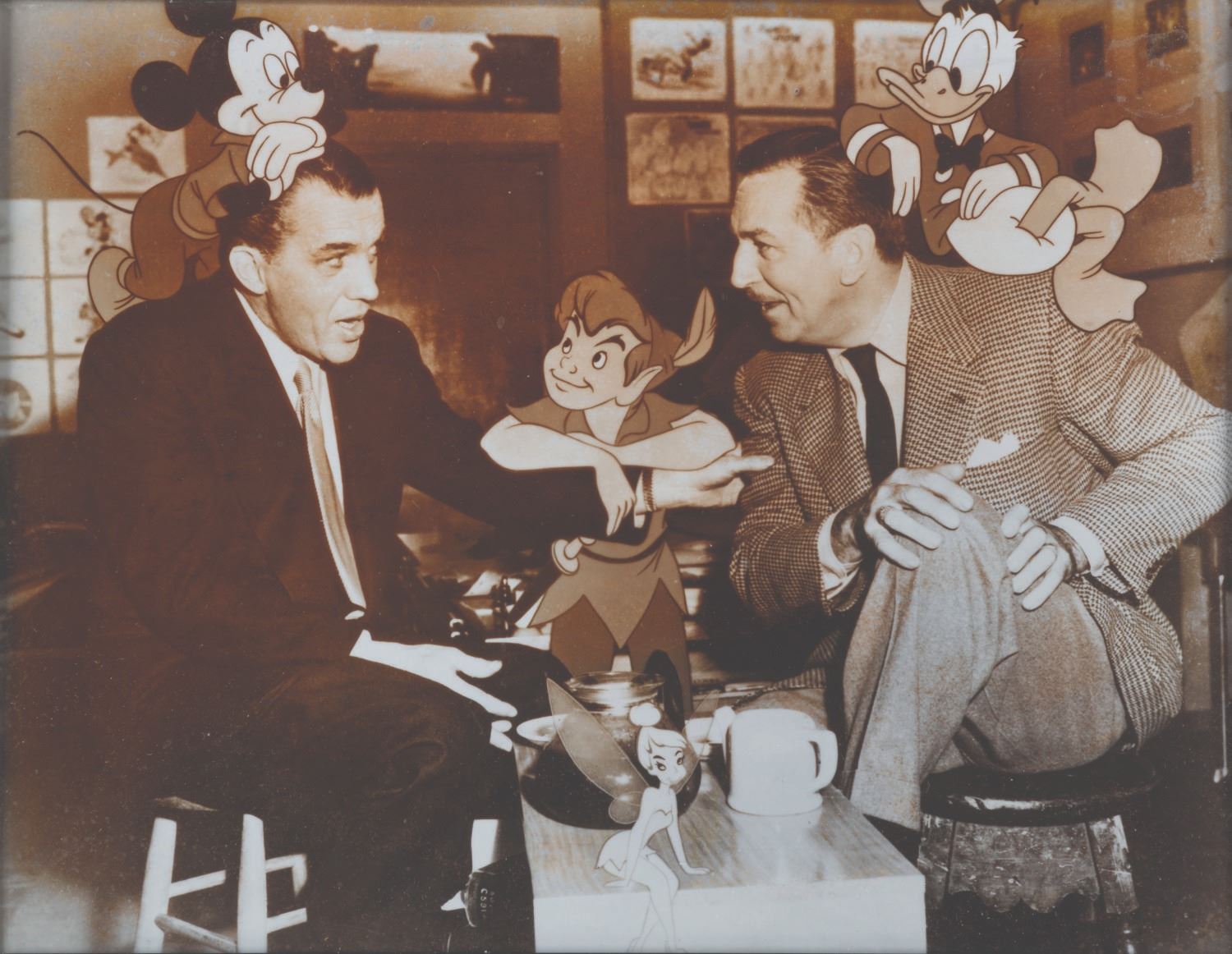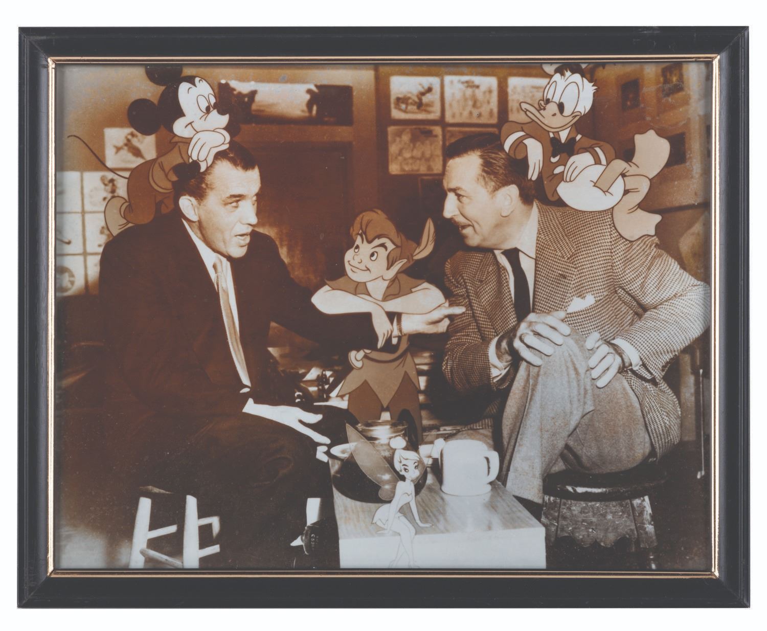 (Disney, 1953-55) A publicity photo featuring 1950s television icons Walt Disney and Ed Sullivan alongside Mickey Mouse, Donald Duck, Peter Pan, and Tinker Bell. Measuring 8" x 10", the photo displays in good condition with discoloration from age. The photo is presented in an 8.25" x 10.25" metal frame in good condition with light scratches and scuffs.