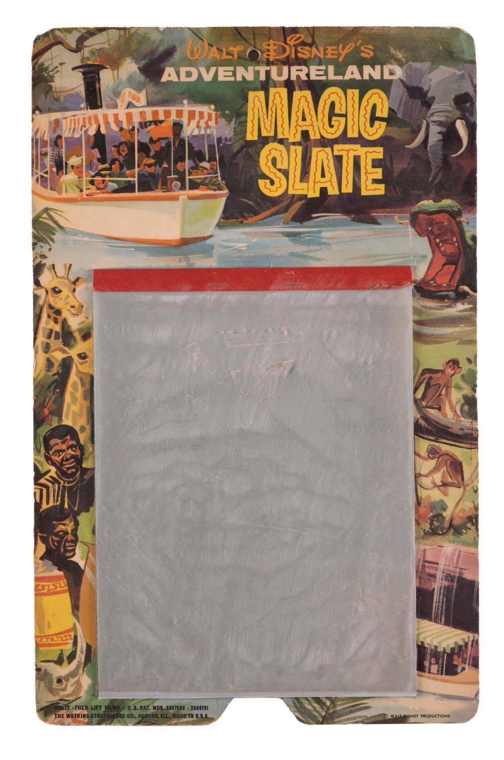 (Disneyland, 1950s-60s) A Walt Disney's Adventureland Magic Slate by Watkins-Strathmore Company. The drawing tablet toy features imagery of natives, giraffes, hippos, monkeys, and the Congo Queen boat. Measuring 10.5"x16.5", the toy is in good condition overall with indents, creases, and wear to plastic layers and backing from use and age.