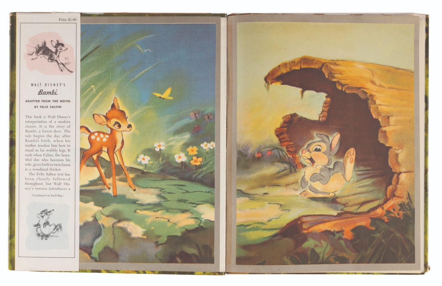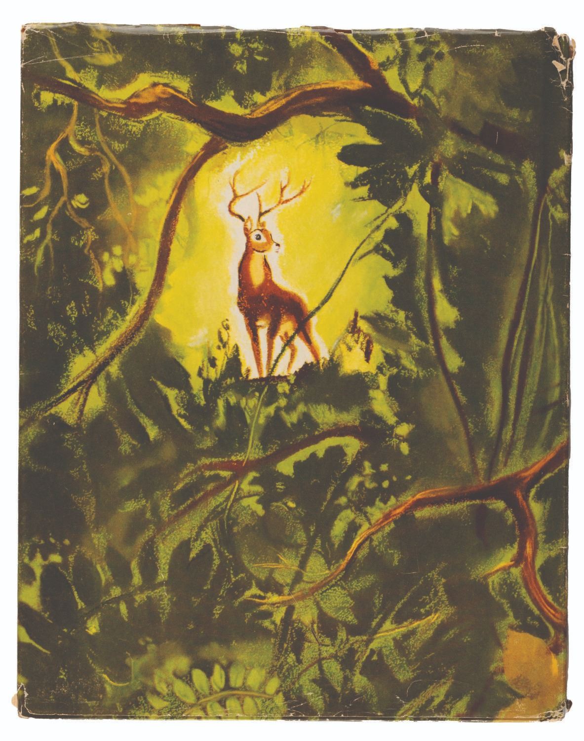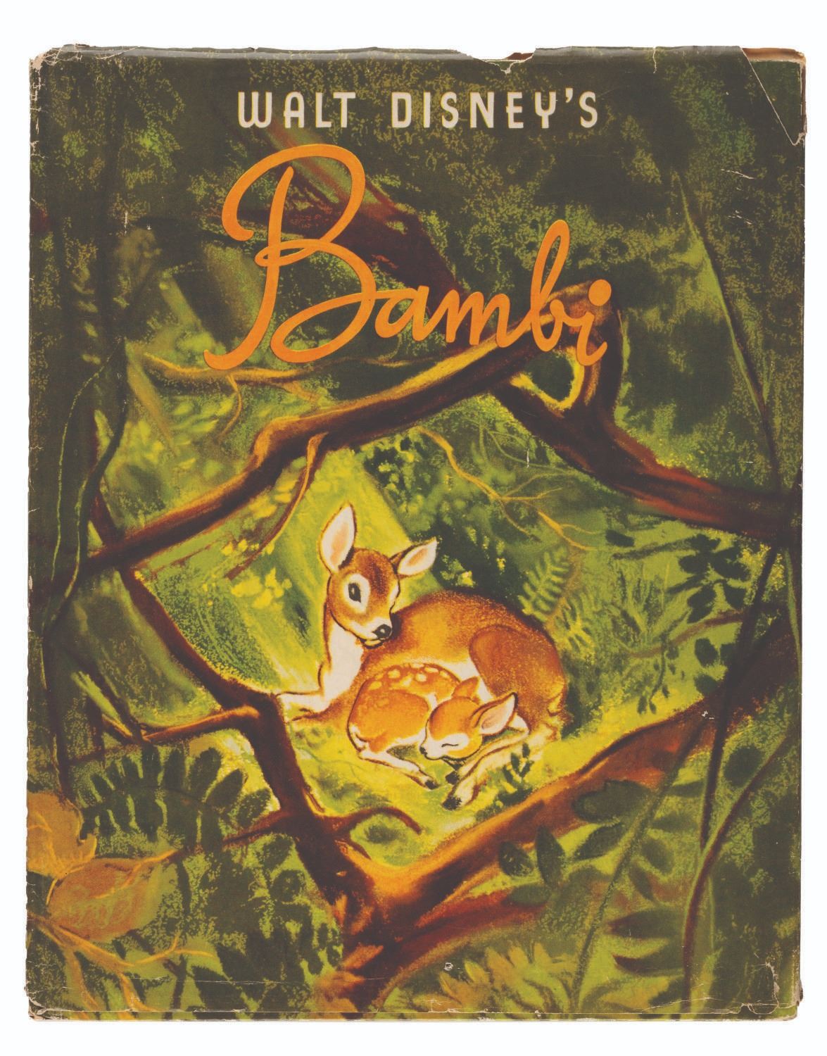 (Simon and Schuster, 1941) A hardcover Walt Disney's "Bambi" storybook published by Simon & Schuster. Measuring 9" x 11.25", this book is in good condition, with heavy wear to the jacket, light wear to the front and back covers of the book, and light wear and discoloration to the pages.