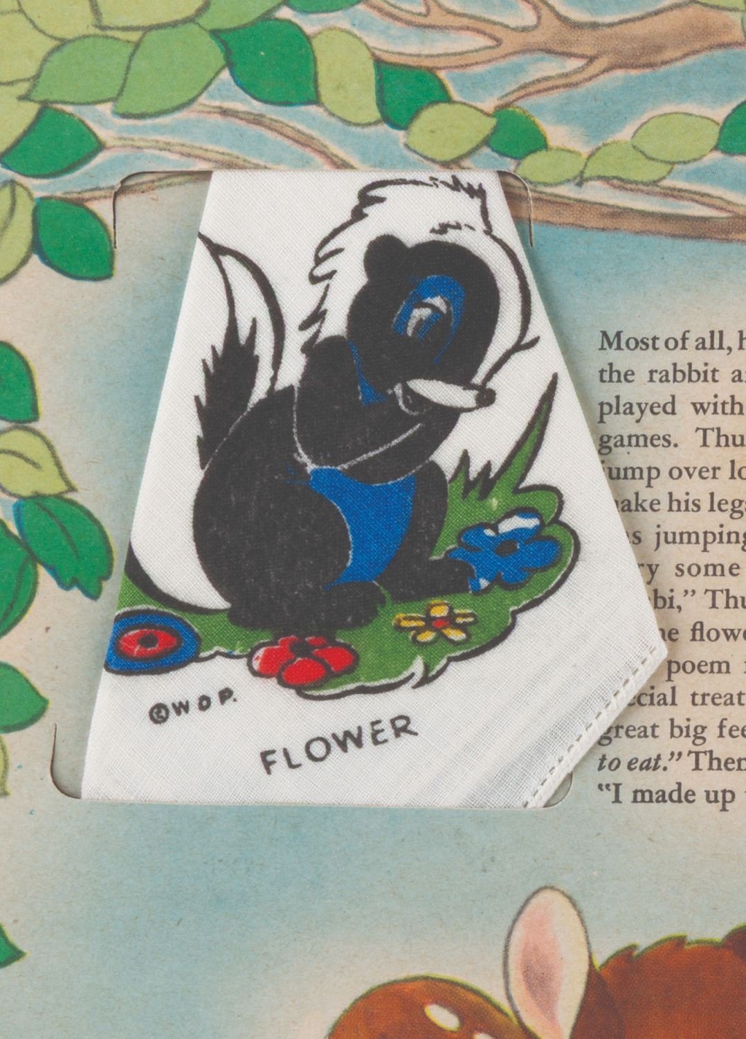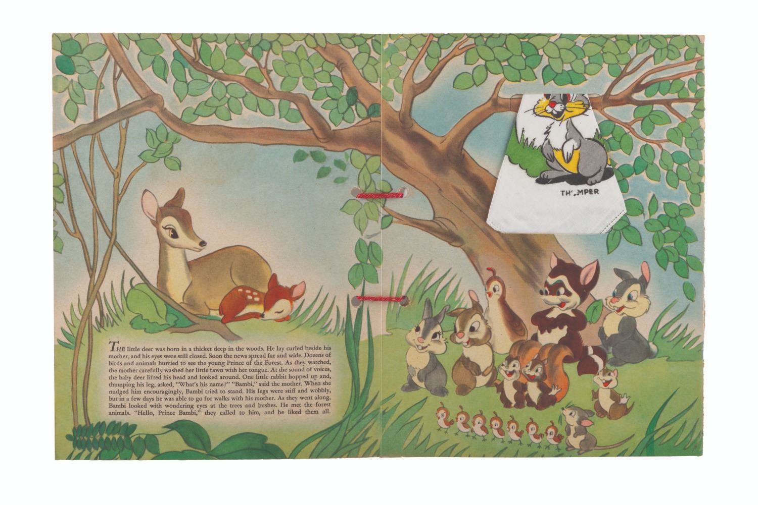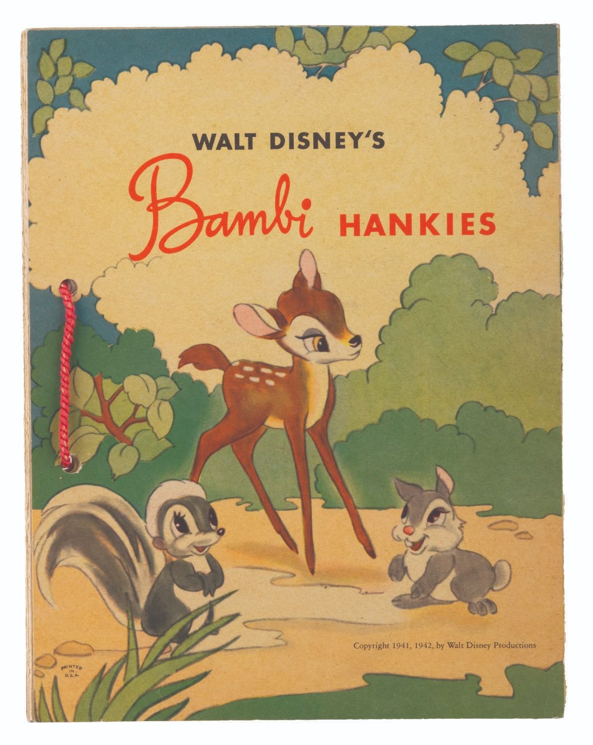 (Disney, 1942) An unusual storybook of “Bambi" with children’s handkerchiefs throughout the illustrations featuring Thumper, Owl, Flower, and Baby Bambi. Measuring 7.25" x 9.25", the string-bound book is in very good condition with light wear.