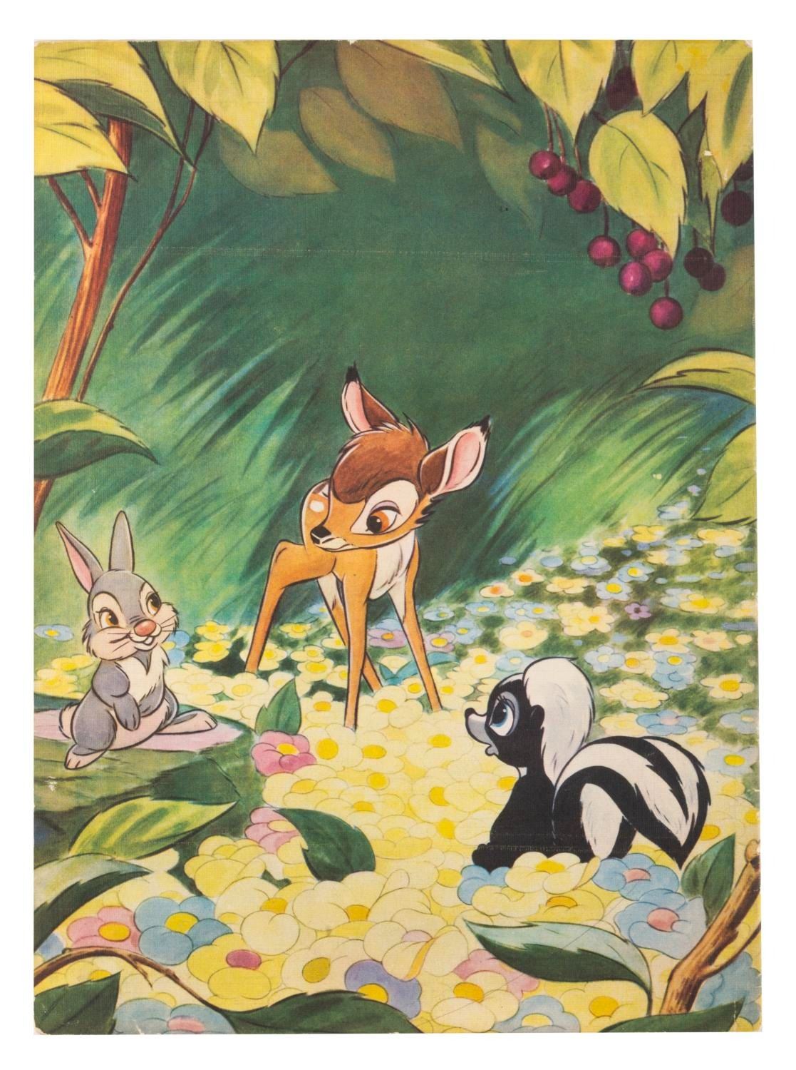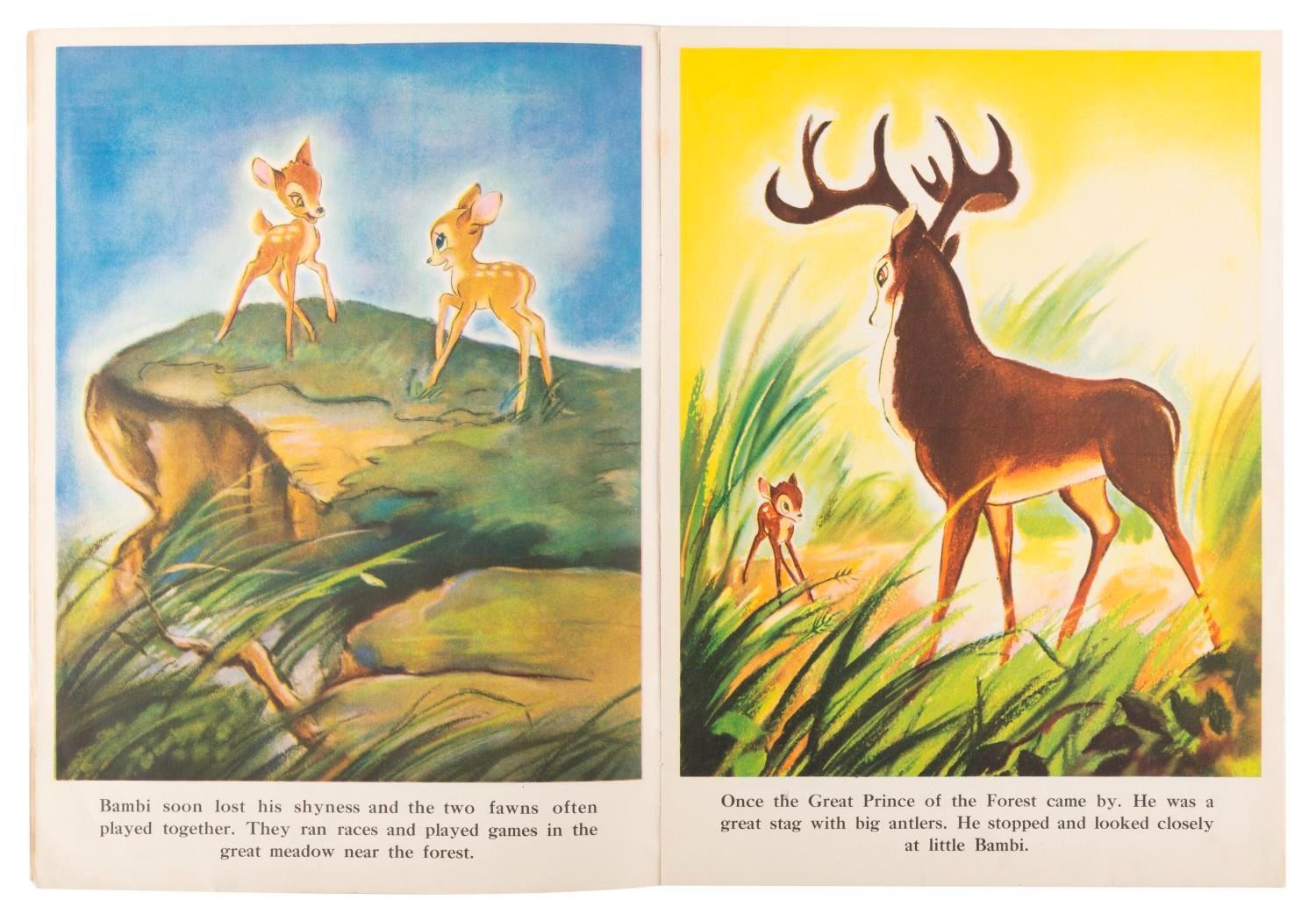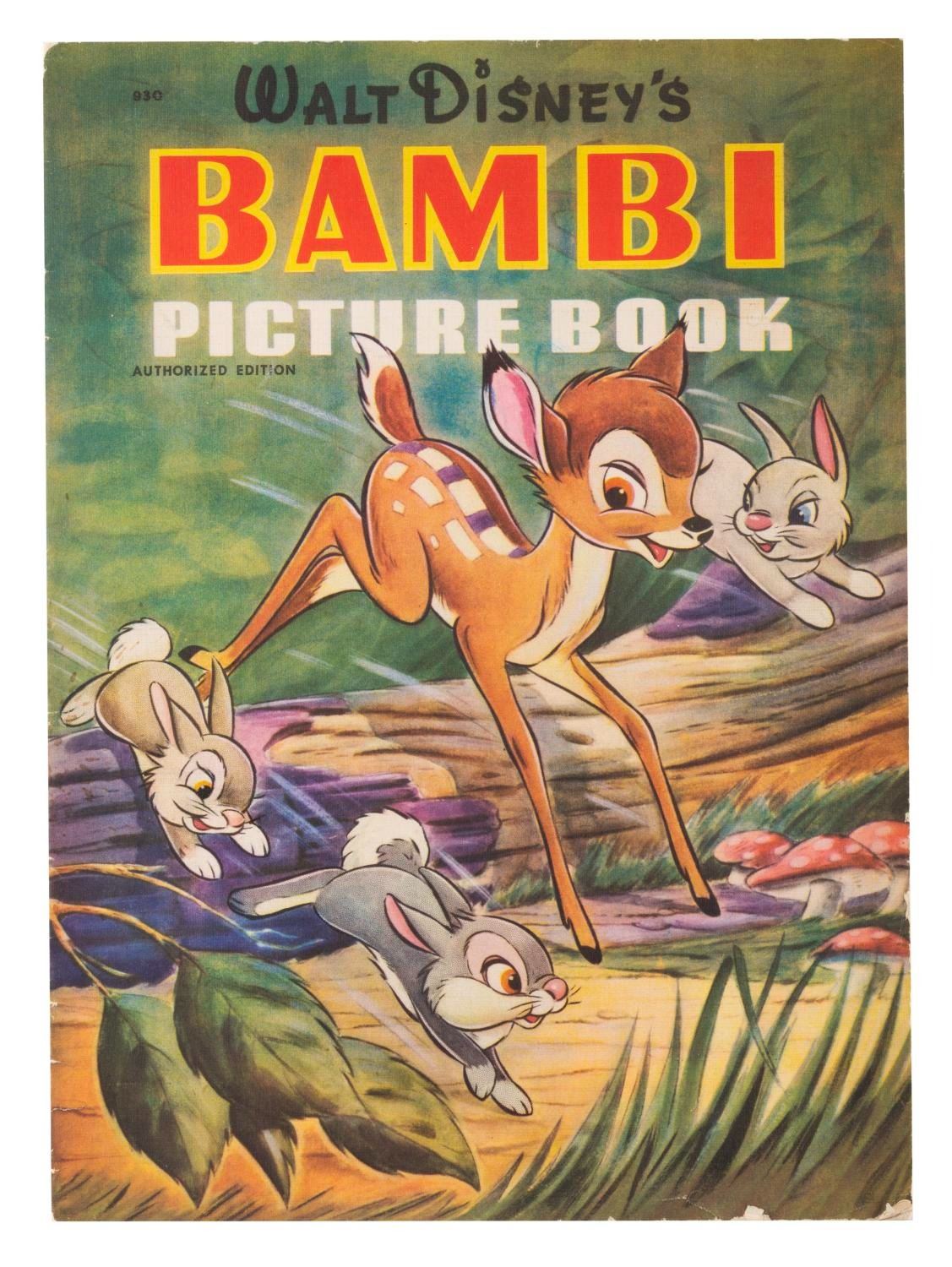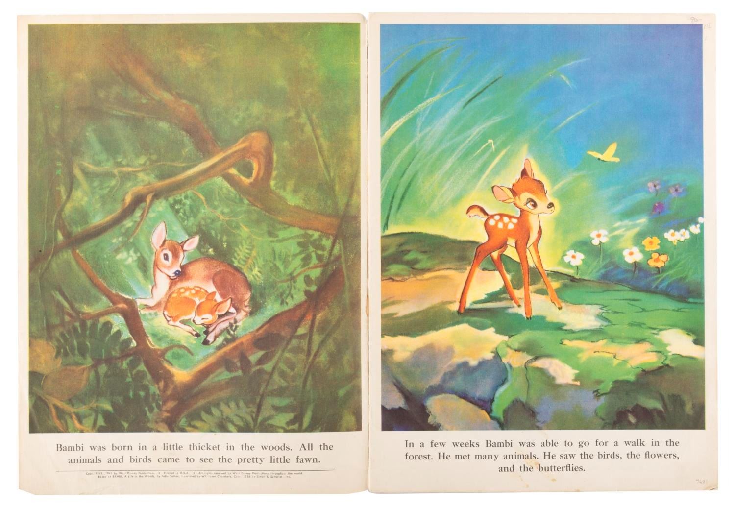 (Disney, 1942) A Walt Disney’s “Bambi" picture book printed on linen-like paper. Measuring 9.5" x 13", the book displays in very good condition with edge tears and wear.