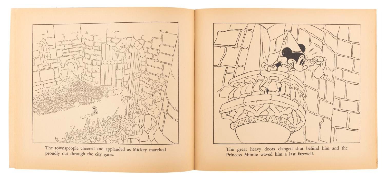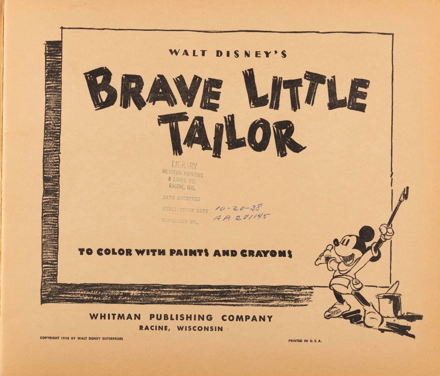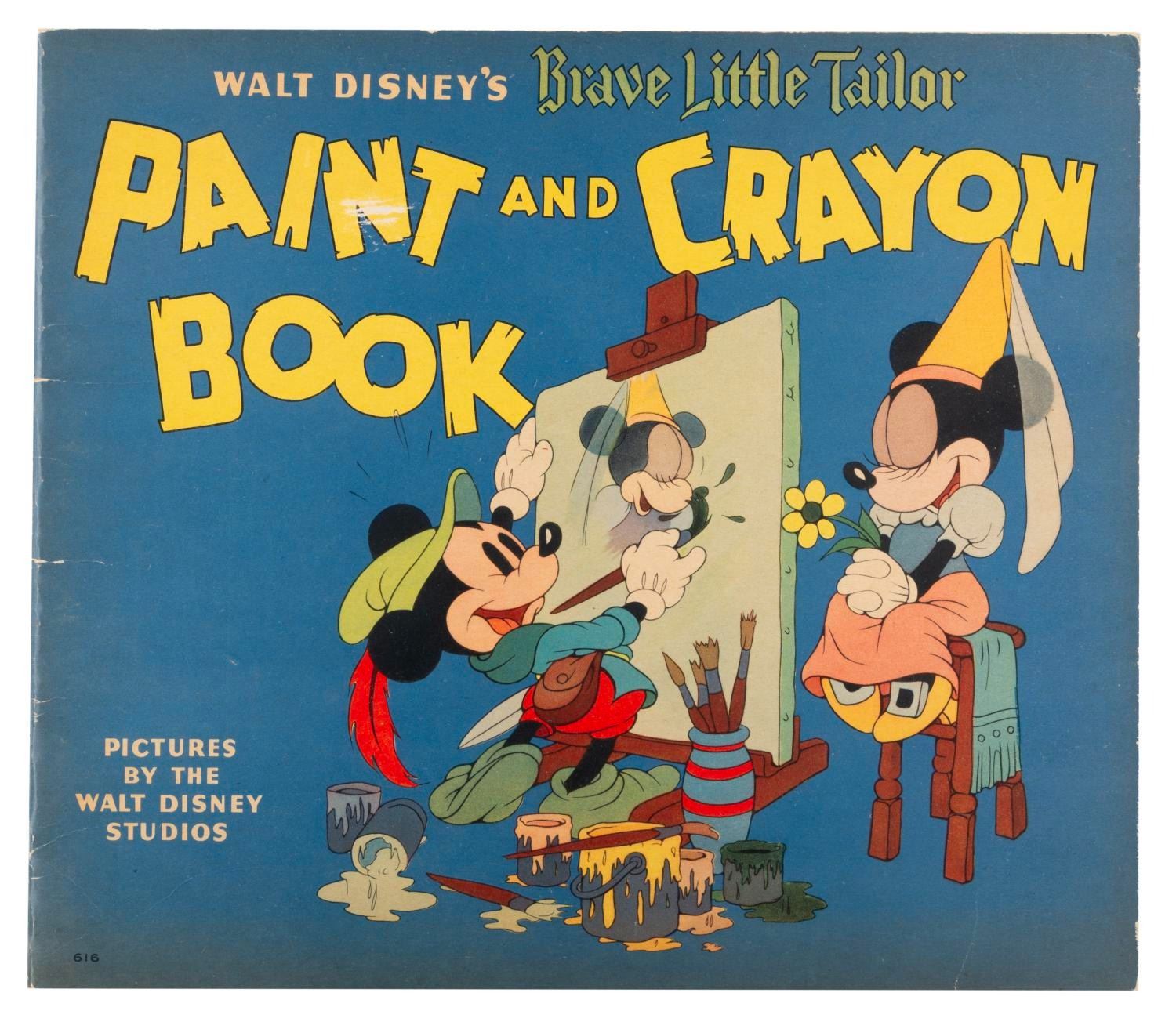 (Whitman, 1938) A Walt Disney's Brave Little Tailor Paint and Crayon Book. Measuring 11" x 12.5", the book is in good condition with creases, a scrape on the cover, and discoloration from age, with an inscription and a stamp on the title page.