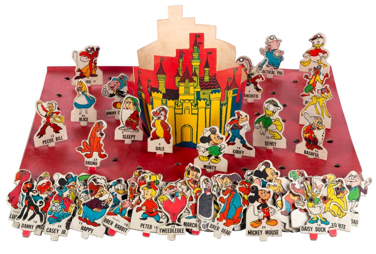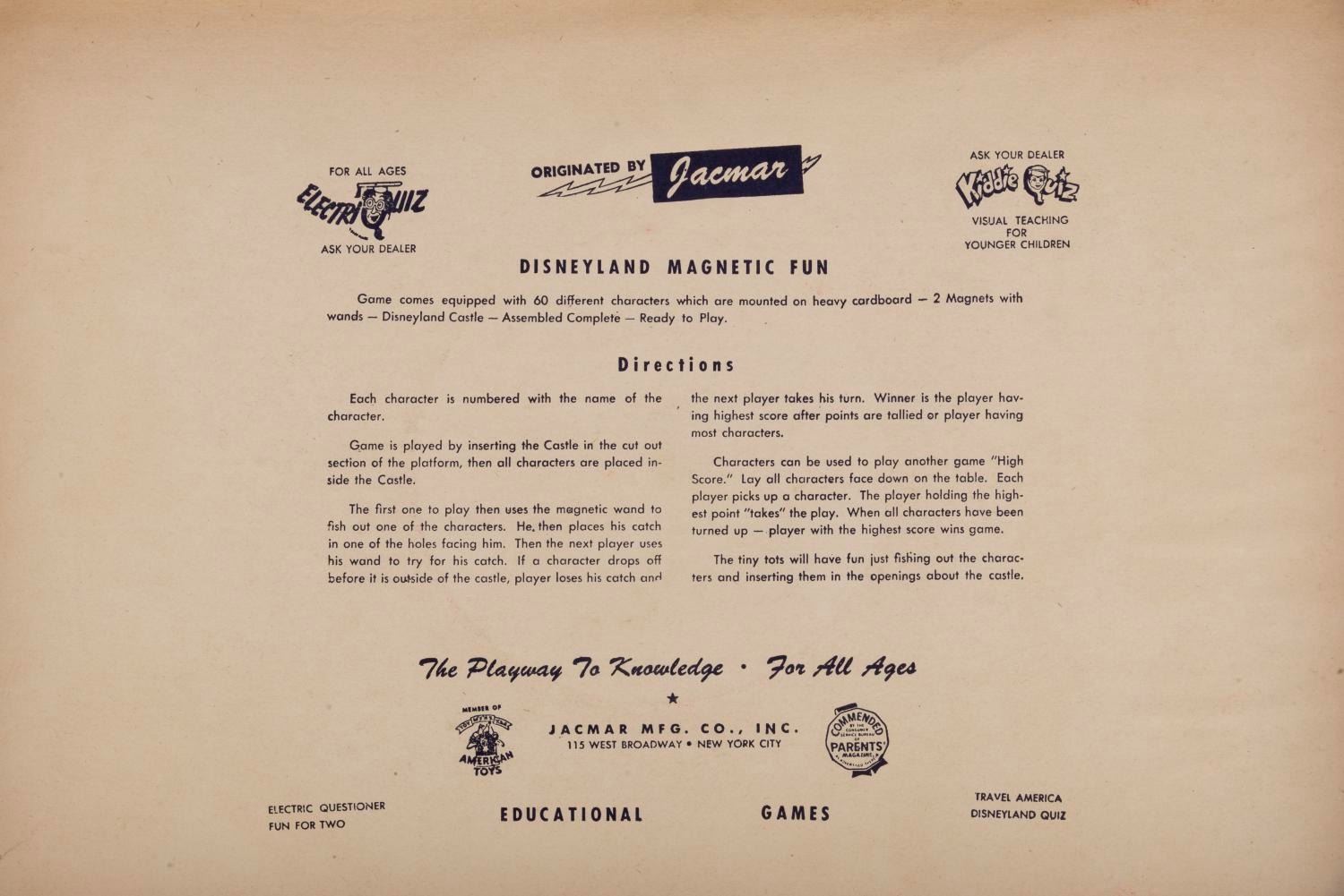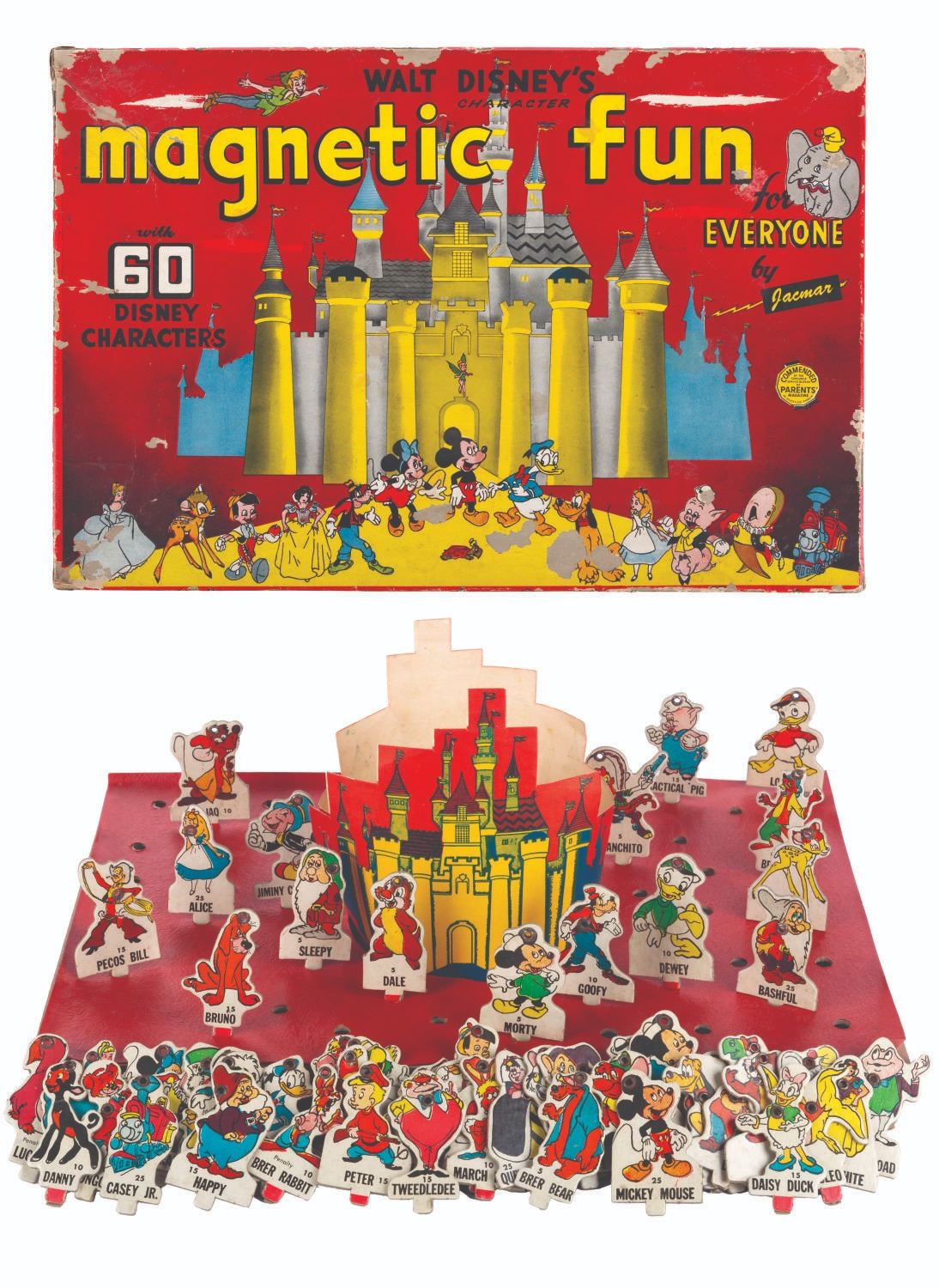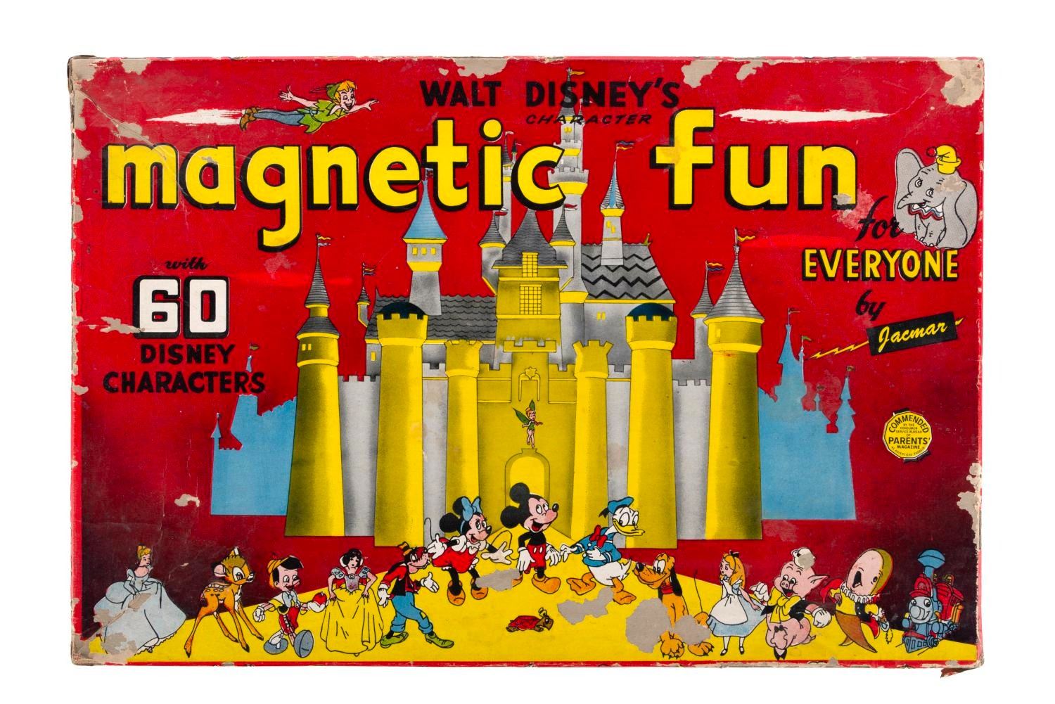 (Jacmar, 1950s) A rare Walt Disney's Character Magnetic Fun for Everyone toy by Jacmar. This set (No.718) comes with magnets, wands, and all 60 characters within their original 18.25"x12.5"x2.5" box. This boxed set is in good condition, each piece punched from the original backing, and exhibiting wear, tears, and surface loss to the box, lid, and pieces.