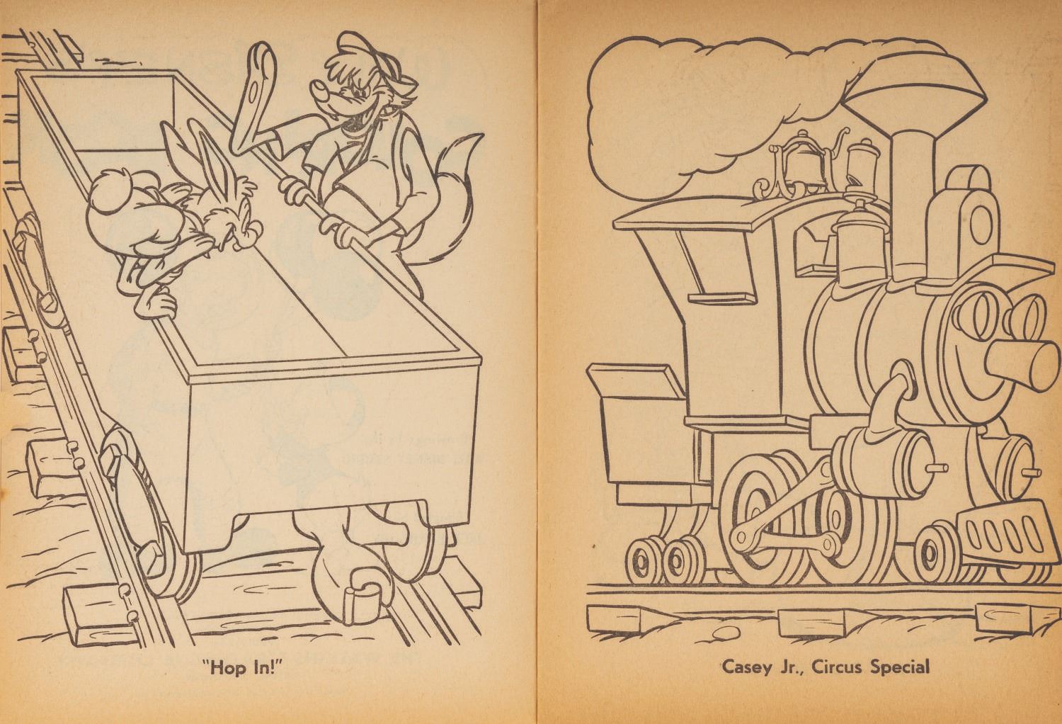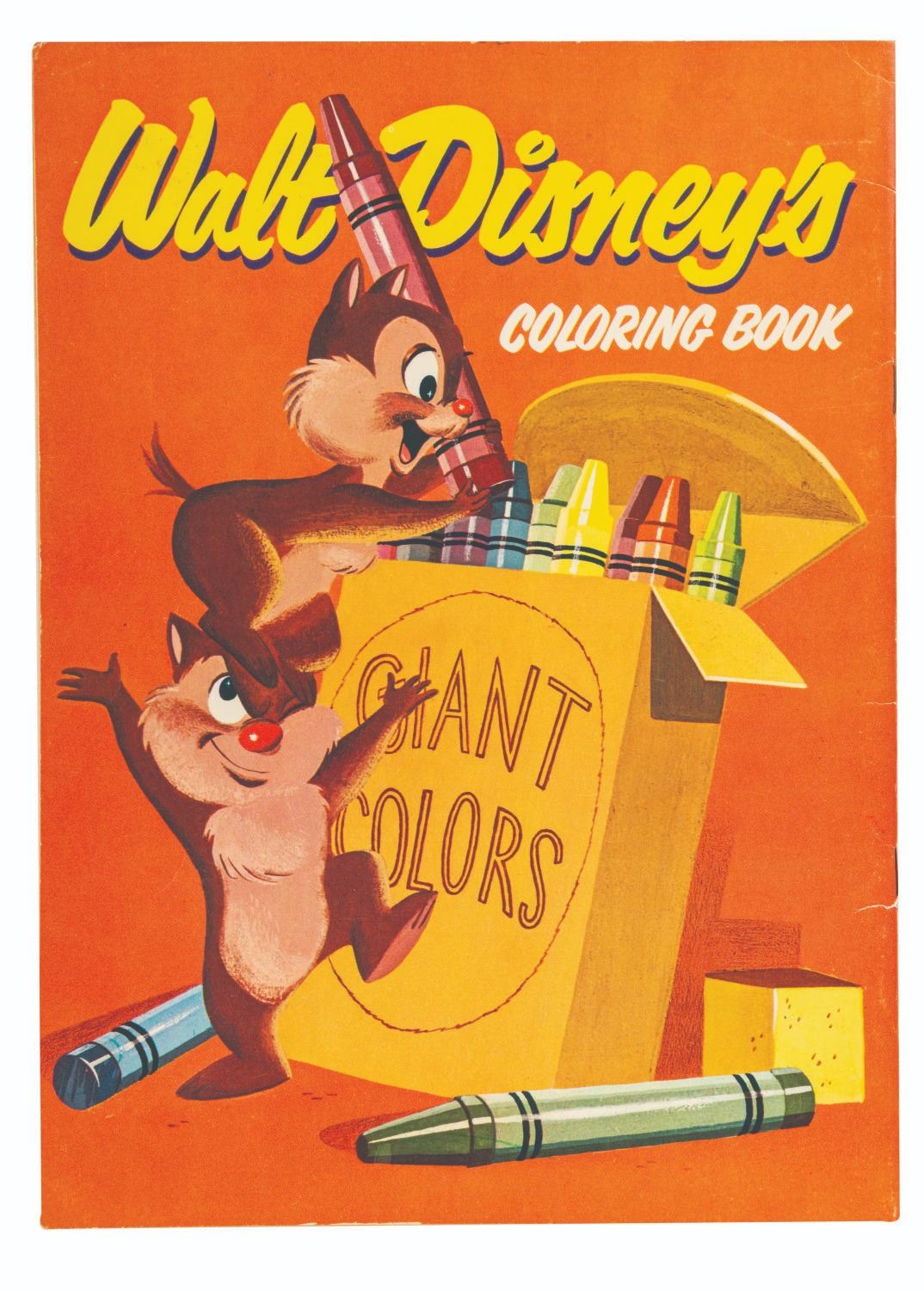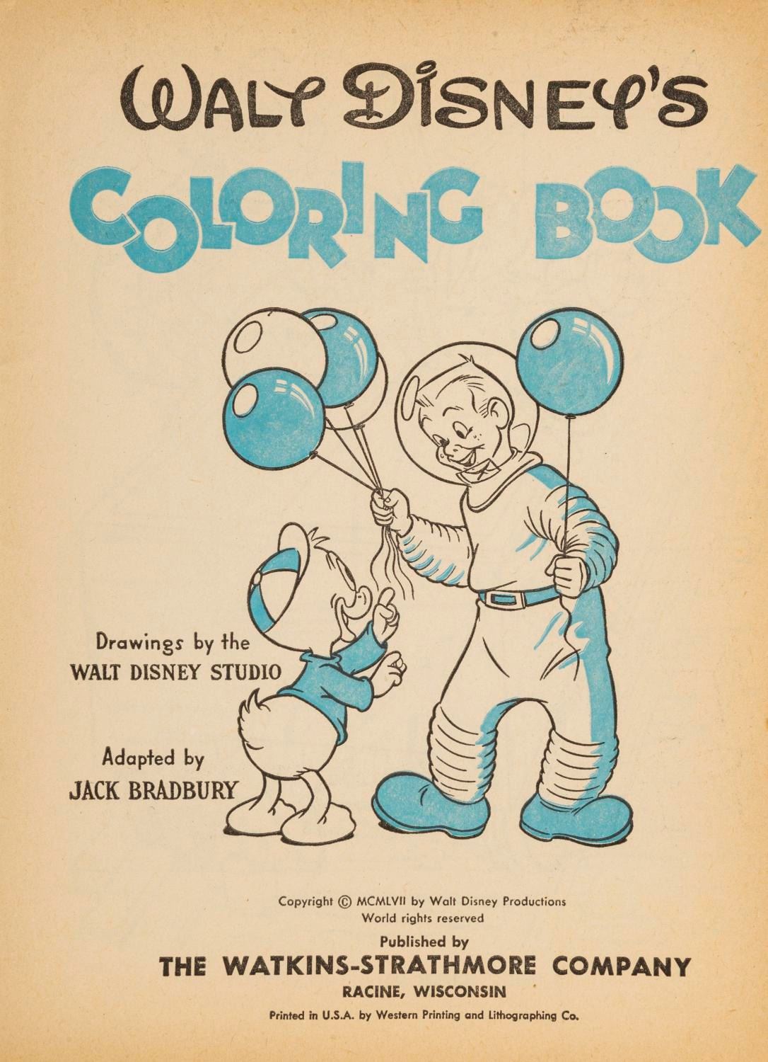 (Watkins Strathmore, 1957) A Walt Disney’s Coloring Book featuring Disney characters around Disneyland Park. Measuring 11” x 8.25”, the 28-page book is in very good unused condition, with color shift to the pages, slight creases to the spine and edge wear, consistent with age and handling.