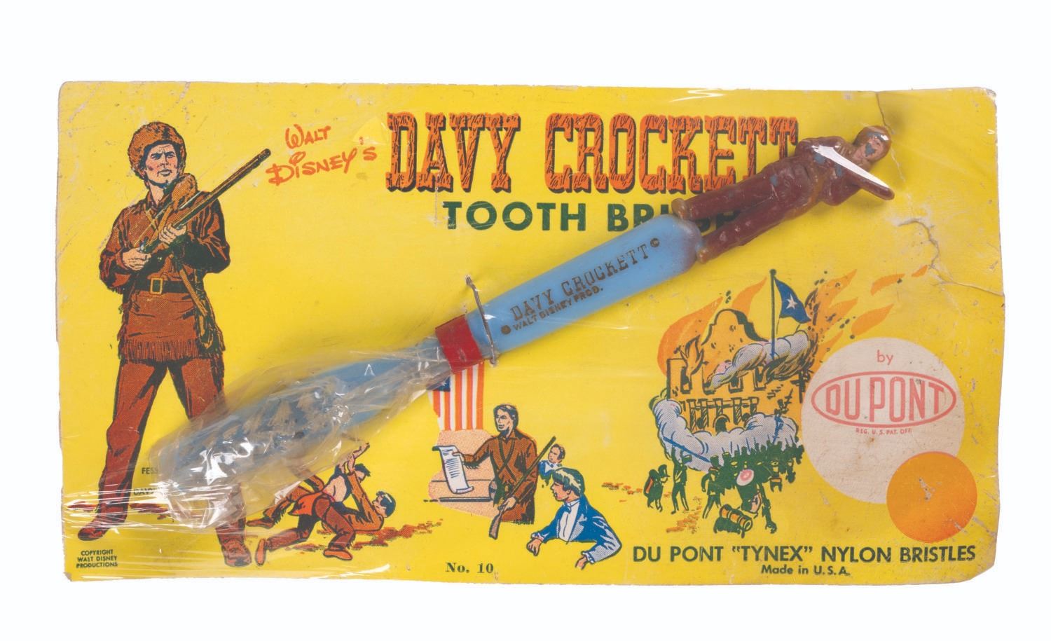 (DuPont, 1950s) A Walt Disney's Davy Crockett Tooth Brush with the original packaging. Measuring 5.25" long on its 6.25" x 3.25" card, the tooth brush is in good condition with wear to its painted elements and the card displaying creases and wear.