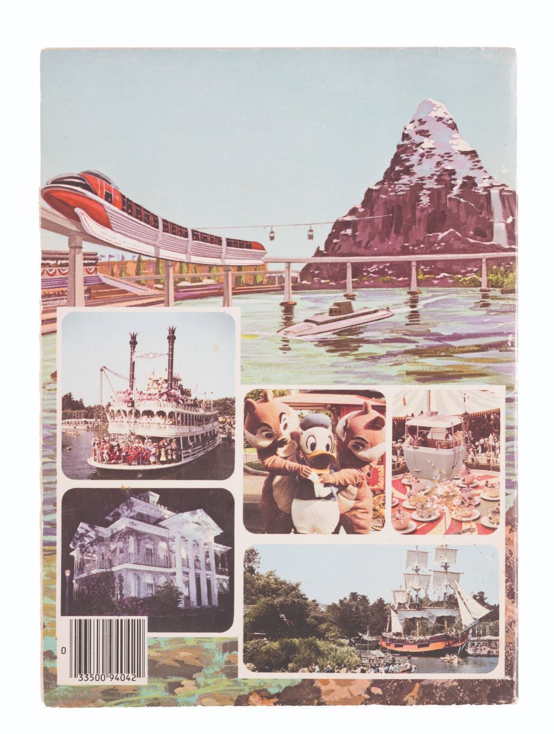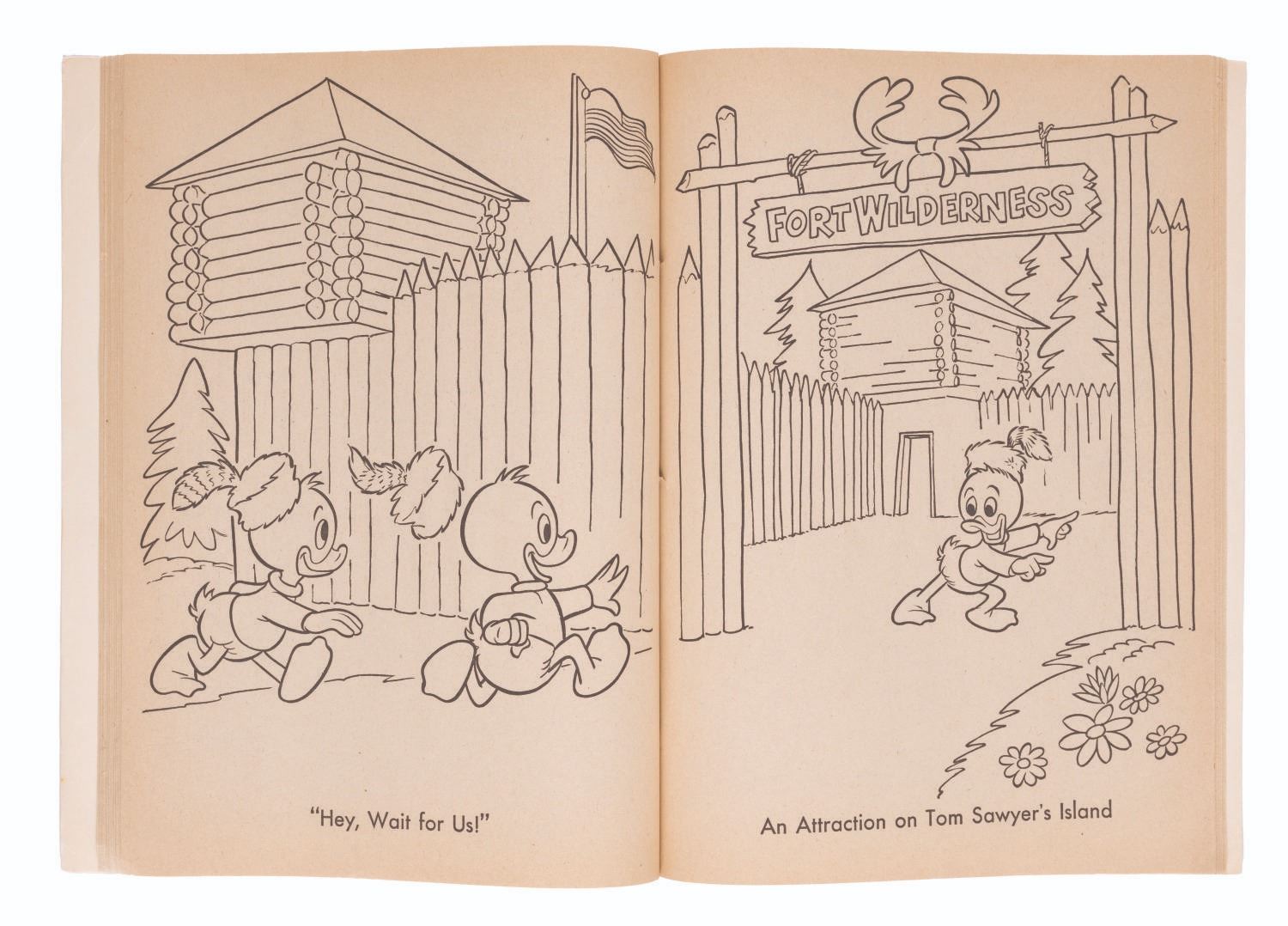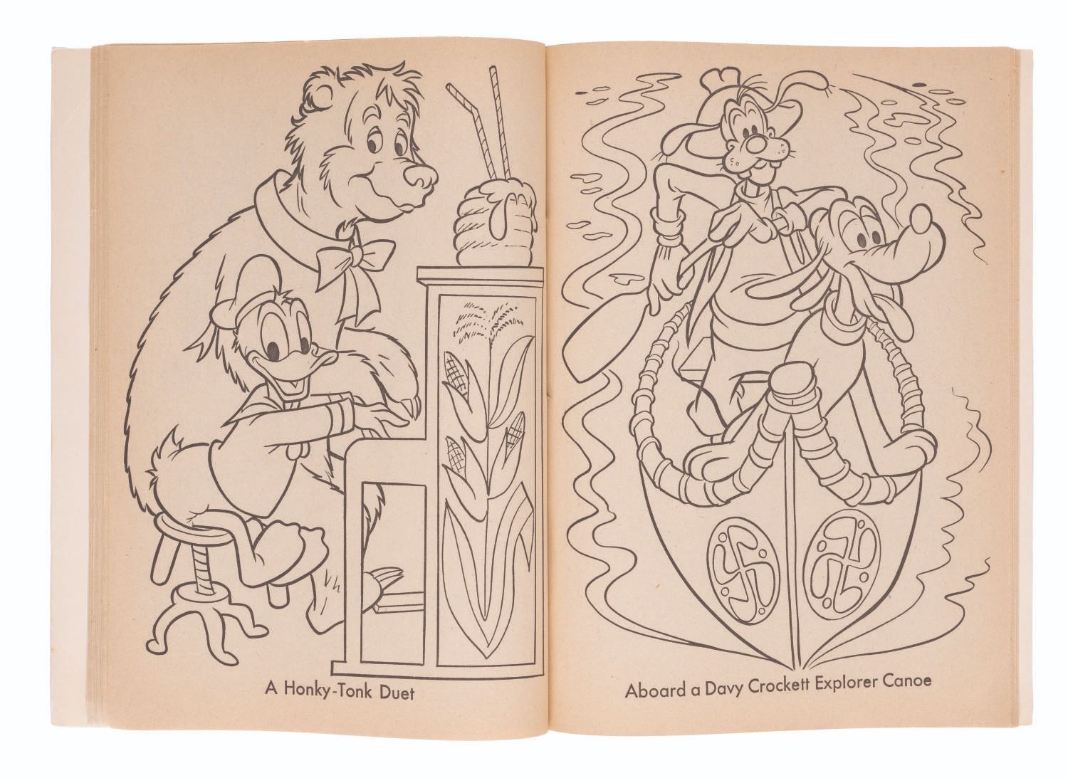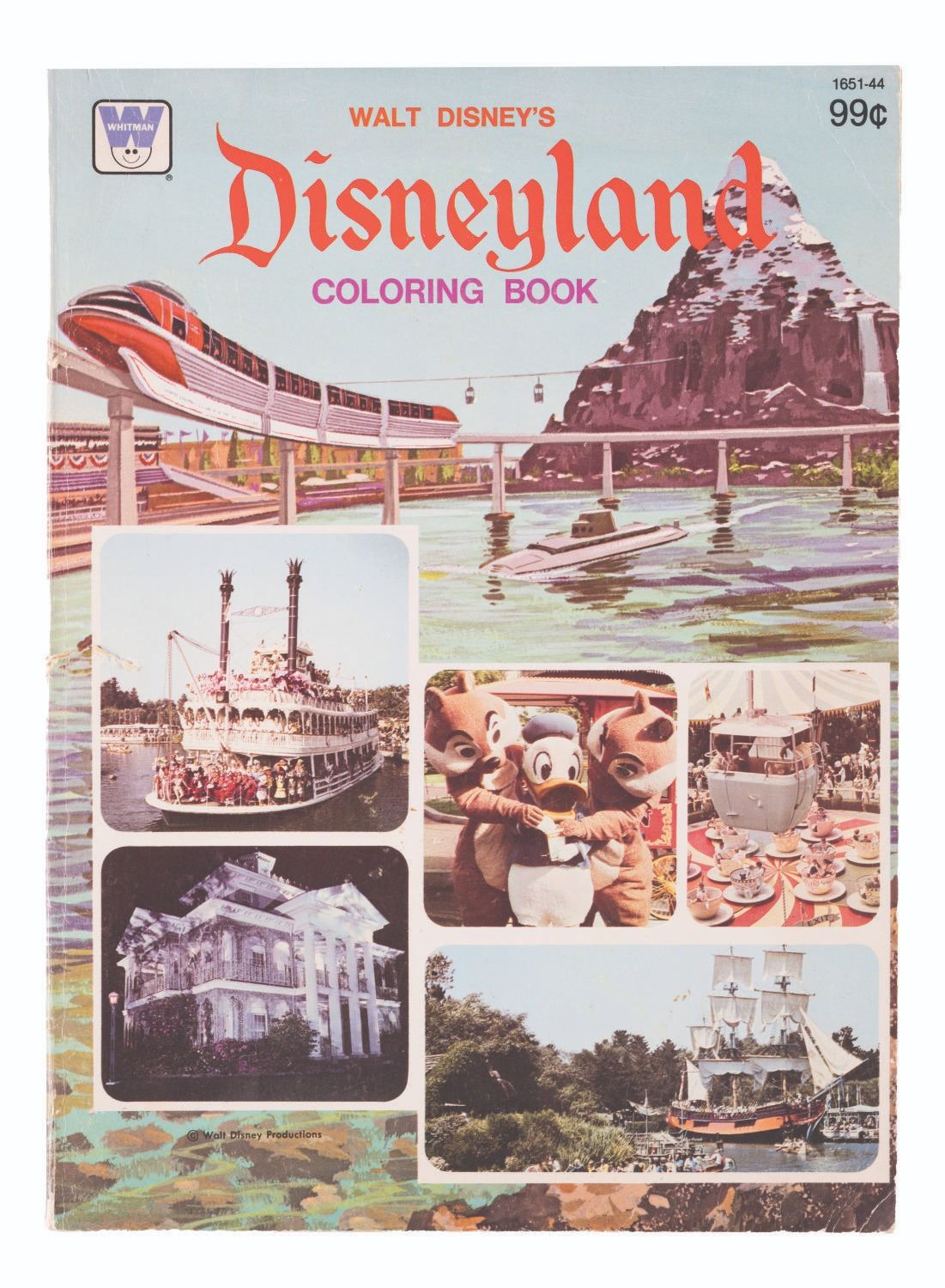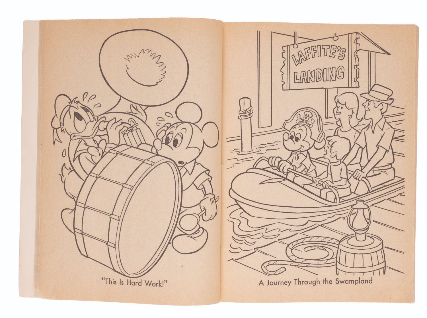 (Whitman, 1975) A Walt Disney's Disneyland Coloring Book with pages for new attractions America Sings and the Country Bear Jamboree. Measuring 8” x 10.75”, the coloring book is in fair condition with several pages colored, writing inside the cover, typical handling wear, a stain on the back, and a 1” tear through the spine.