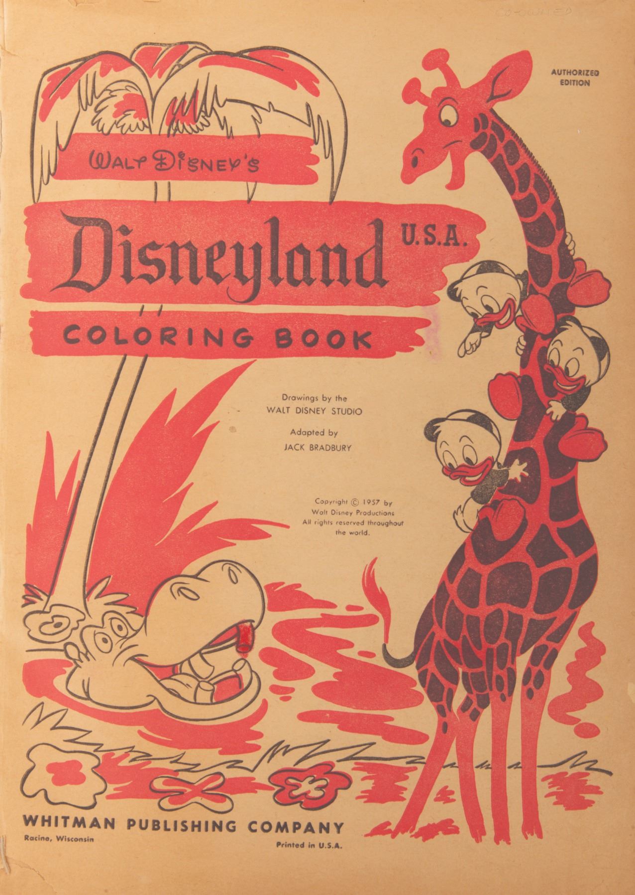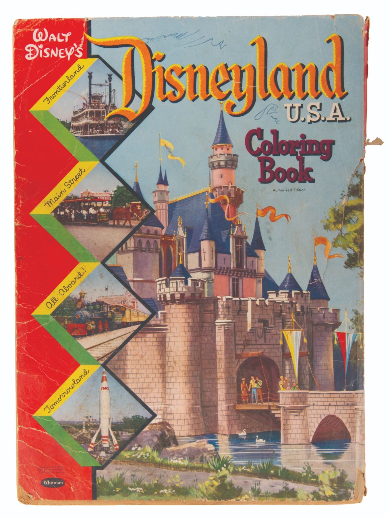 (Whitman, 1957) An early Walt Disney's Disneyland U.S.A. Coloring Book by Whitman Publishing. This large coloring book measures 11" x 15" and is in fair condition, with damaged and loosened binding, partly used pages, and wear from age throughout.
