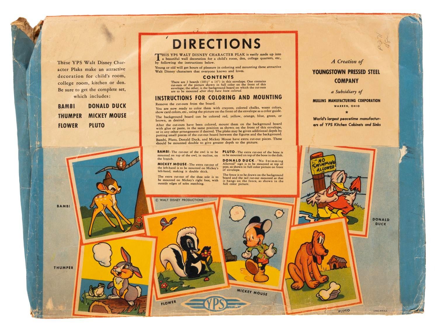 (Youngstown Pressed Steel Company, 1942) A Walt Disney’s Donald Duck Character Plak. It has been punched from its original card (not included) and remains uncolored except for the sign. Measuring 9” x 12.5”, the character is in very good condition with light scratches and edge wear, while the 11” x 14.5” original envelope displays in good condition with heavy wear, scuffs, creases, and stains.