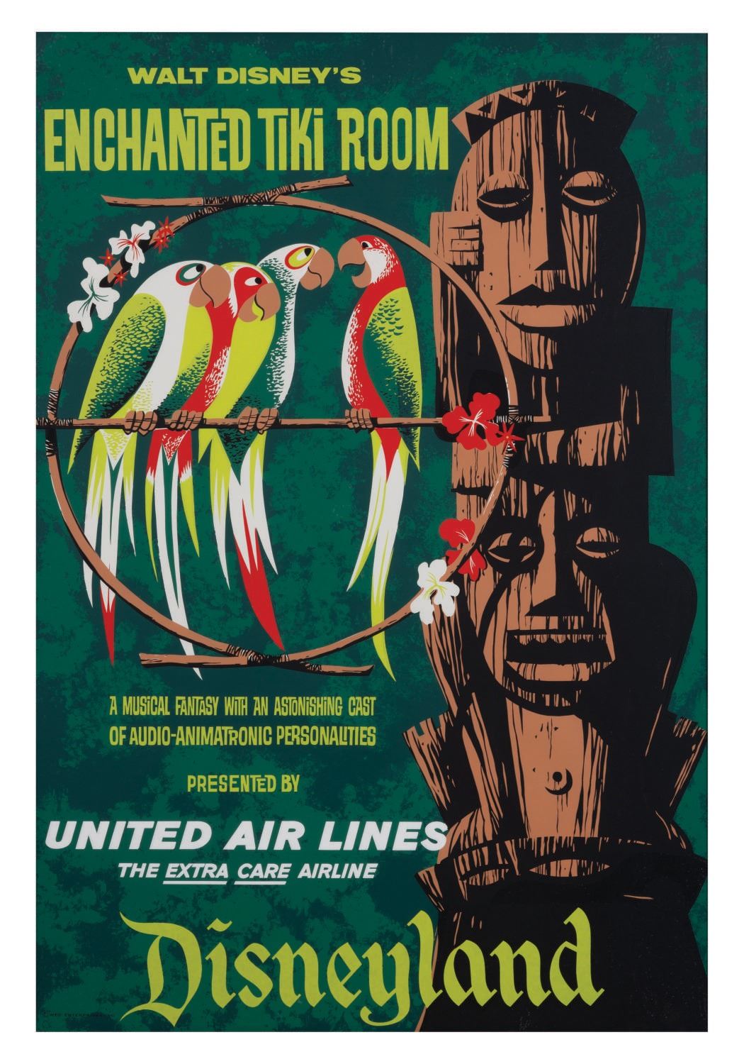 (Disneyland, 1963) An original hand-silkcreened attraction poster for Walt Disney's Enchanted Tiki Room. This earliest version of the poster features beautiful imagery by Paul Hartley along with the name of Participant Sponsor United Airlines, and lists Disneyland as the location. The poster measures 36"x54" and is in very good condition with a few creases, scuffs, and expected wear from age.