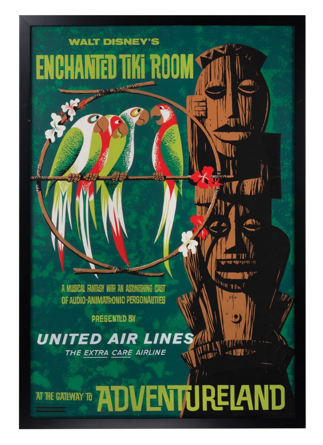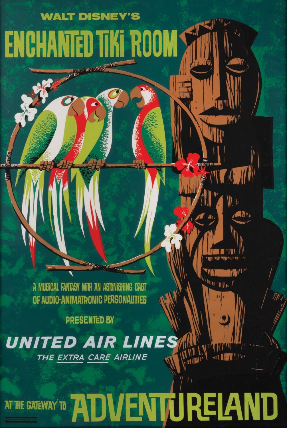 (Disneyland, 1963) An original hand-silkscreened poster for Walt Disney's Enchanted Tiki Room in Adventureland. This second variant of the poster features Paul Hartley's colorful imagery of Tikis and Macaws along with the name of Participant Sponsor United Airlines, with the location changed from "Disneyland" to "At the Gateway To Adventureland." Measuring 36"x54", the poster is in very good condition with creases and scuffs along edges.