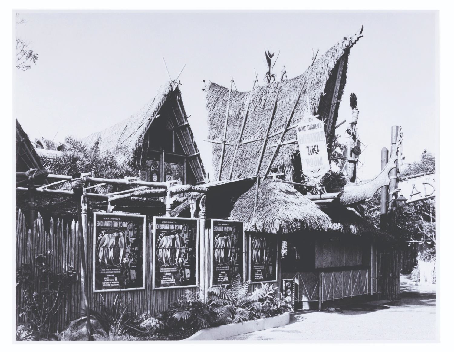 (Disneyland 1960s) A beautiful black and white glossy photo of the exterior of Walt Disney’s Enchanted Tiki Room. Visible are several attraction posters showing that admission costs were seventy-five cents for adults and fifty cents for children, as the Tiki Room was originally not included in Disneyland ticket books. Measuring 11” x 14”, the photo is in very good condition with one small indent on the left side.
