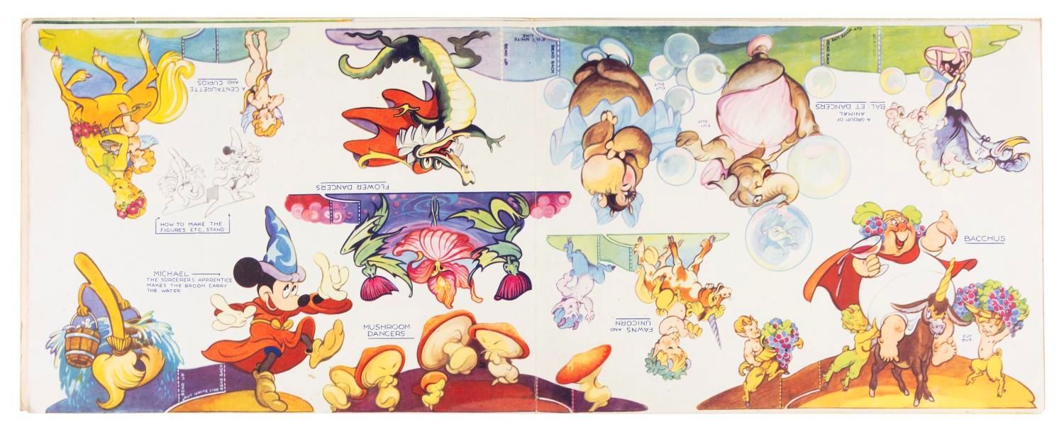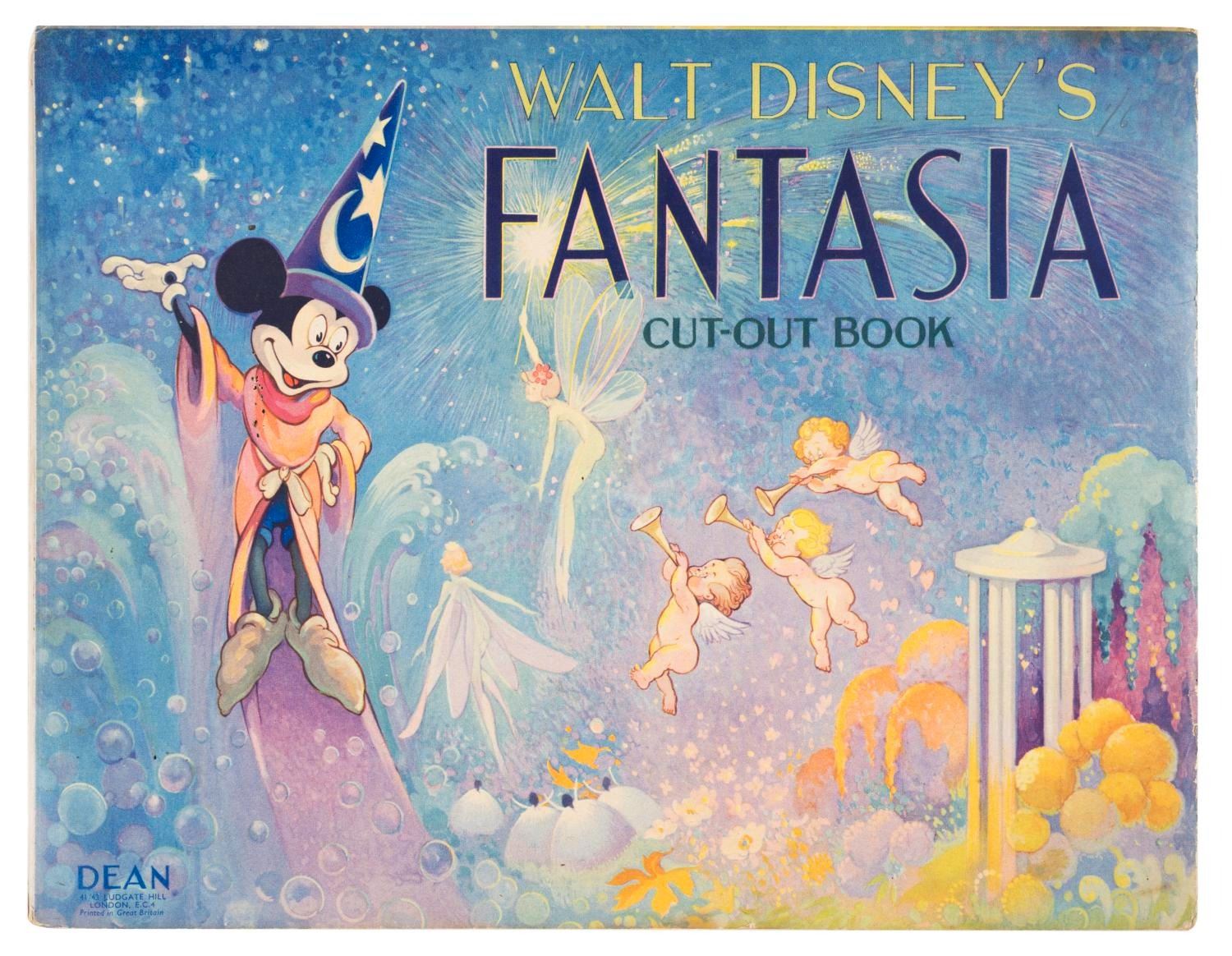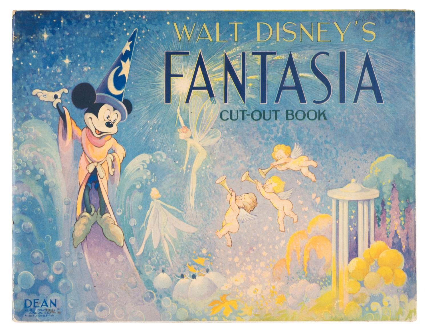 (Dean, 1940s-50s) A Walt Disney’s “Fantasia” cut-out book by Dean. Inside are cut-outs of the film’s characters, including a Sorcerer Mickey cut-out that refers to the character as “Michael.” Measuring 9.75” x 12.5”, the book is in good condition with edge wear, pinholes on the back cover, and discoloration from age.