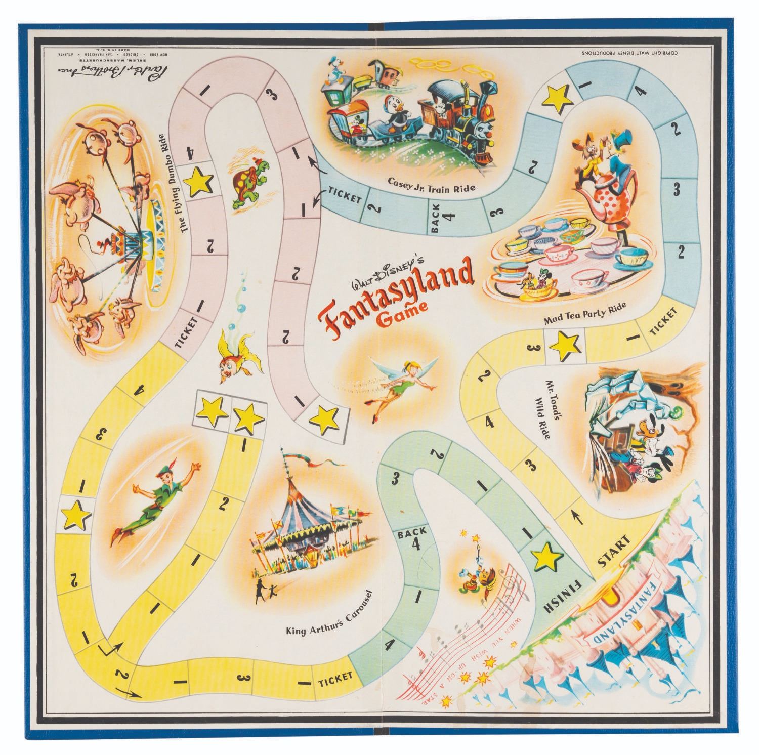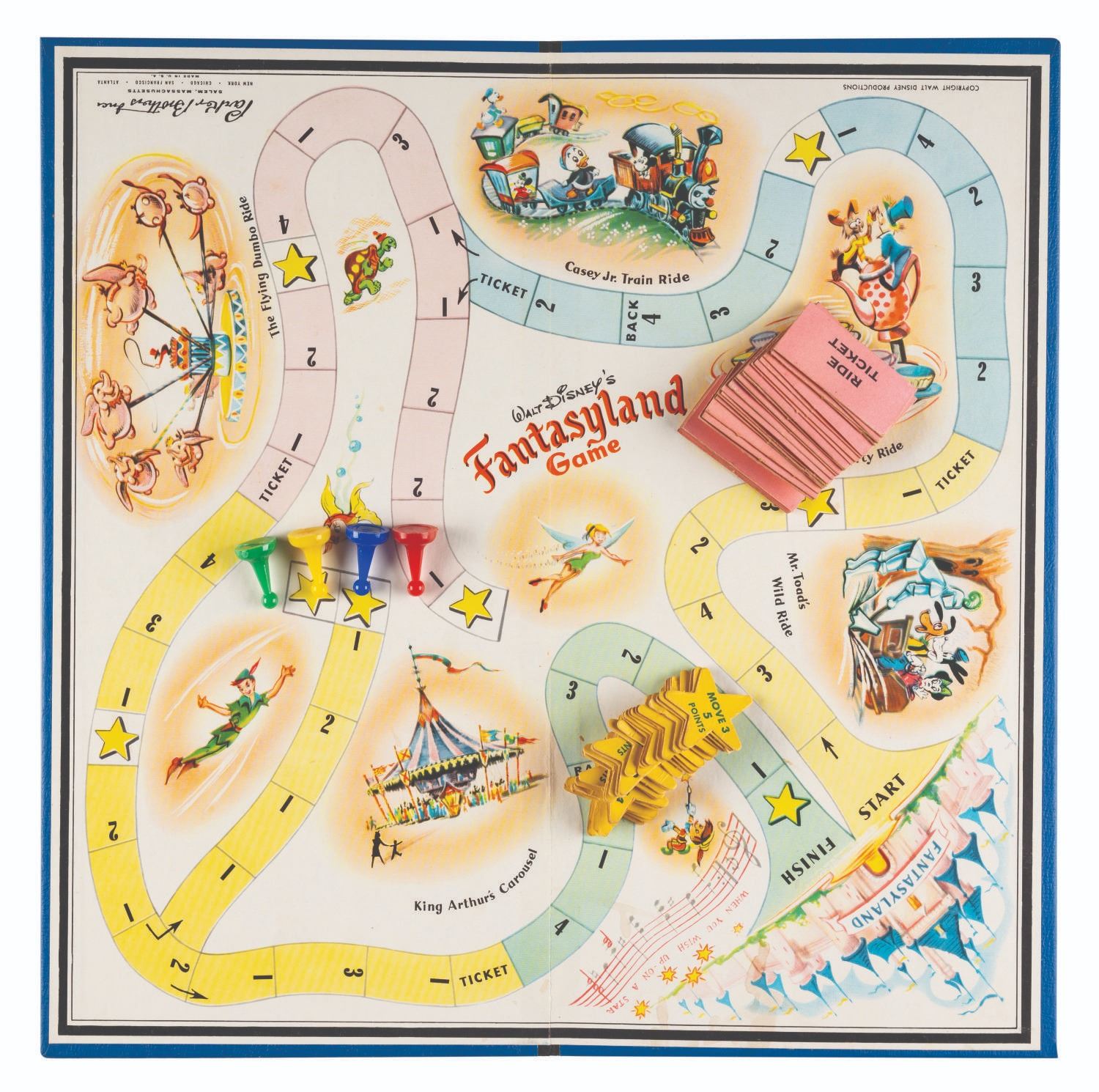(Parker Brothers, 1956) A "Walt Disney's Fantasyland Game" by Parker Brothers. The game features Disney characters at Disneyland and includes playing pieces, tickets, stars, a board, and an original box with instructions. The game and 16"x7.75"x1.75" box are in good condition exhibiting creases, fading, dents, and wear throughout.
