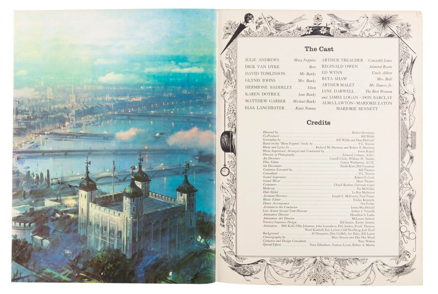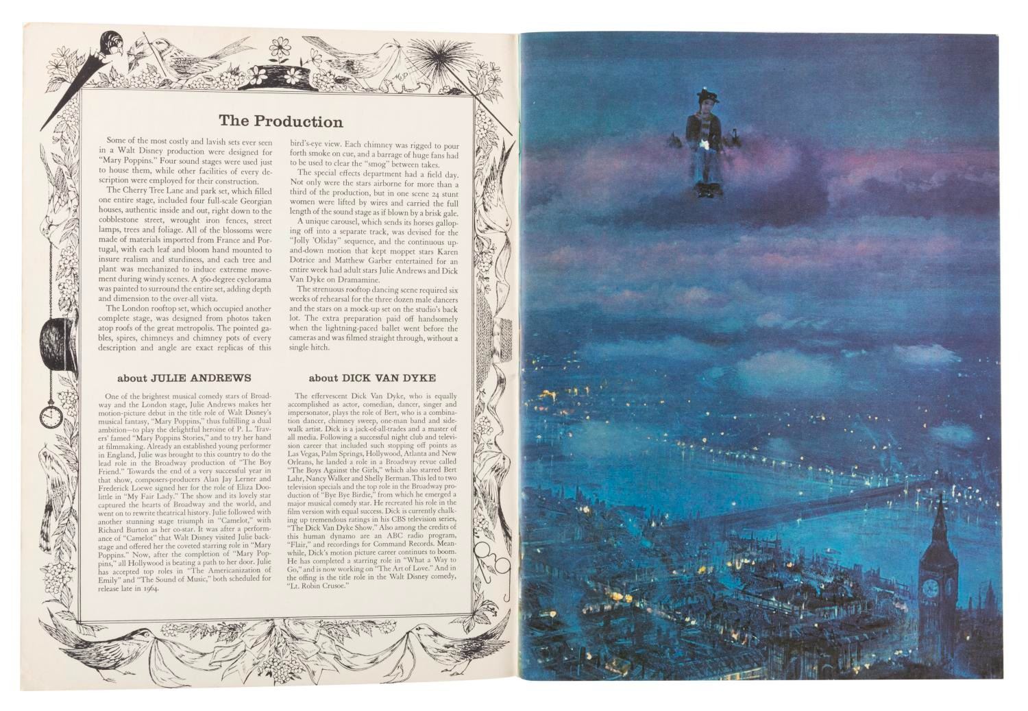 (Golden Press, 1964) A Walt Disney’s “Mary Poppins" book published by Golden Press, featuring the story of the film. Measuring 9.25" x 12.5", the softback book is in good condition with creases, scratches, wear, discoloration from age, and paper loss at the top right.