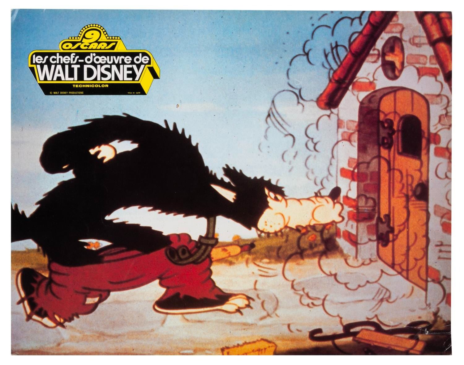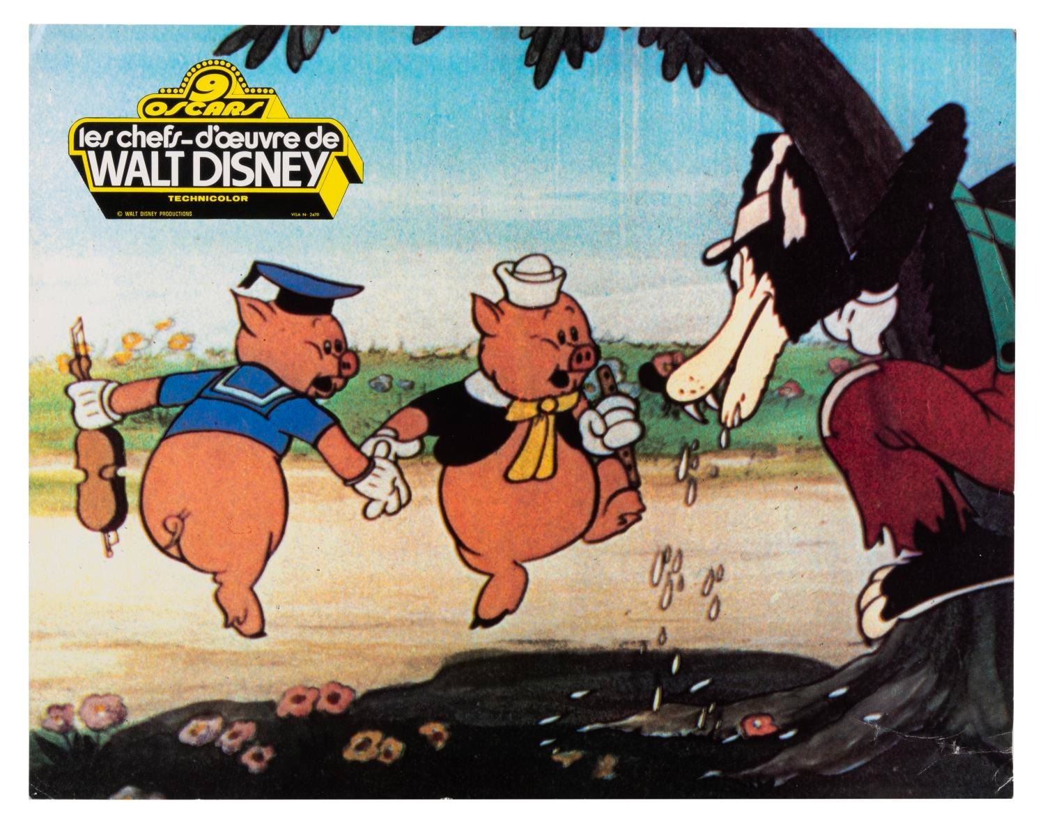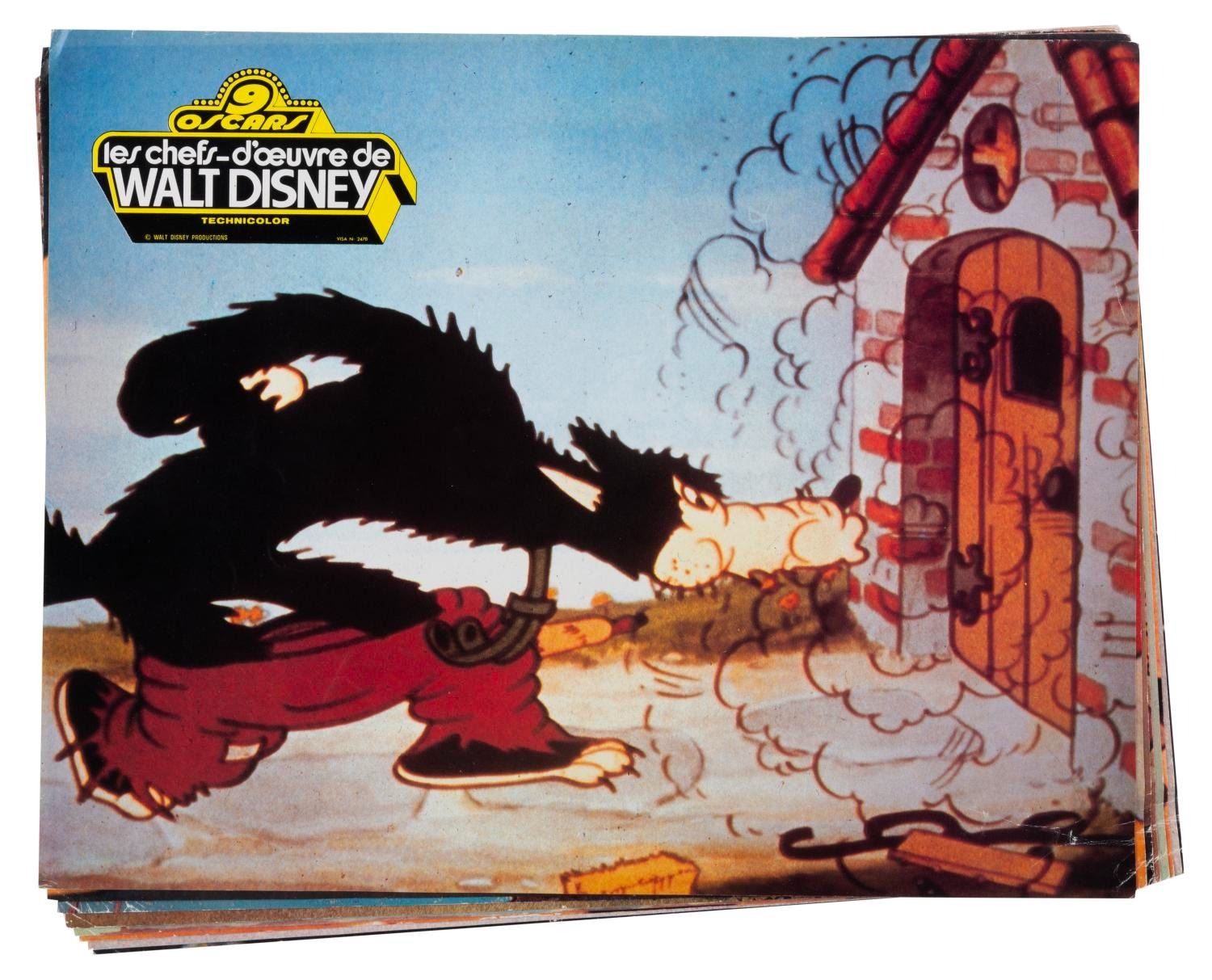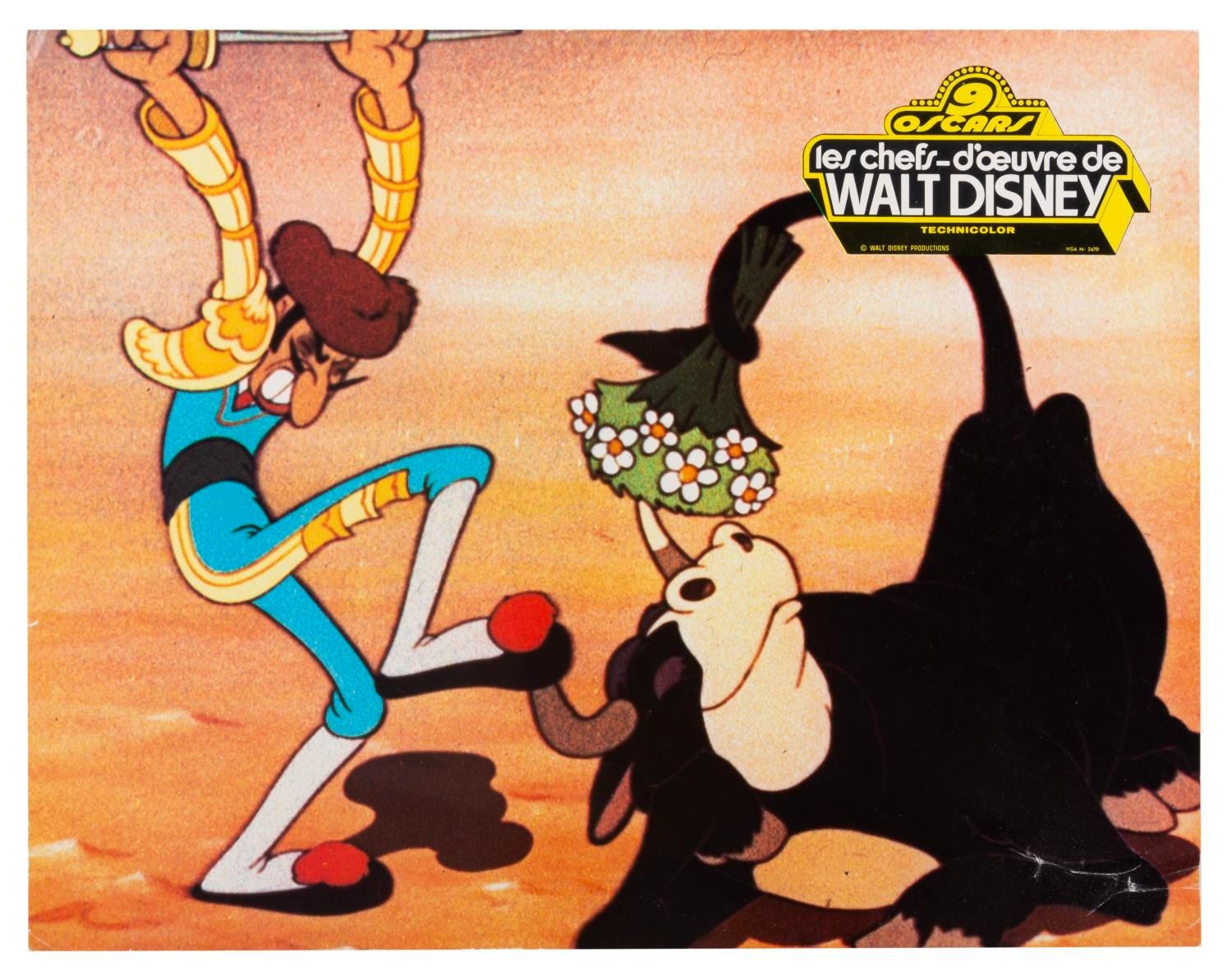 (Disney, 1966) A collection of eight French publicity photos from the 1966 compilation of the Disney Studios' nine Academy Award-winning short films, "Walt Disney's Masterpieces." Included are photos from the shorts "Three Little Pigs," "The Ugly Duckling," "Flowers and Trees," "Ferdinand the Bull," and more. Measuring 9.5" x 12", the photos are in good condition with creasing, edge wear, adhesive residu,e and folds.