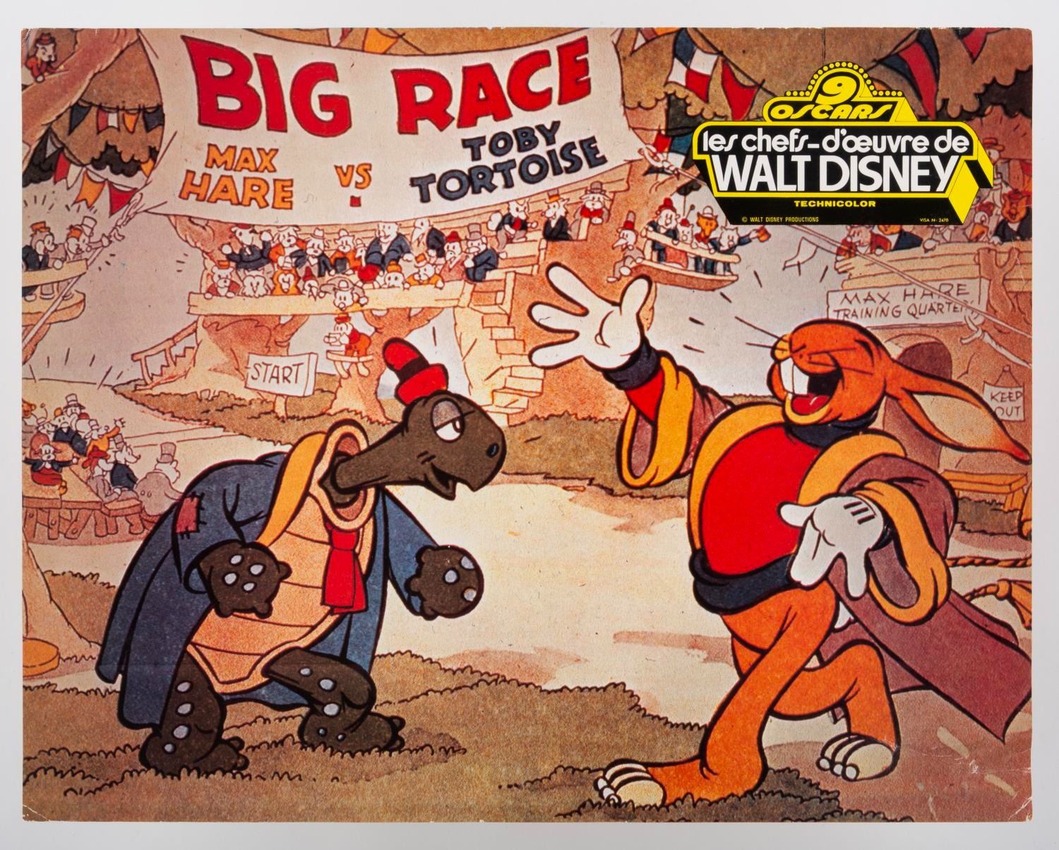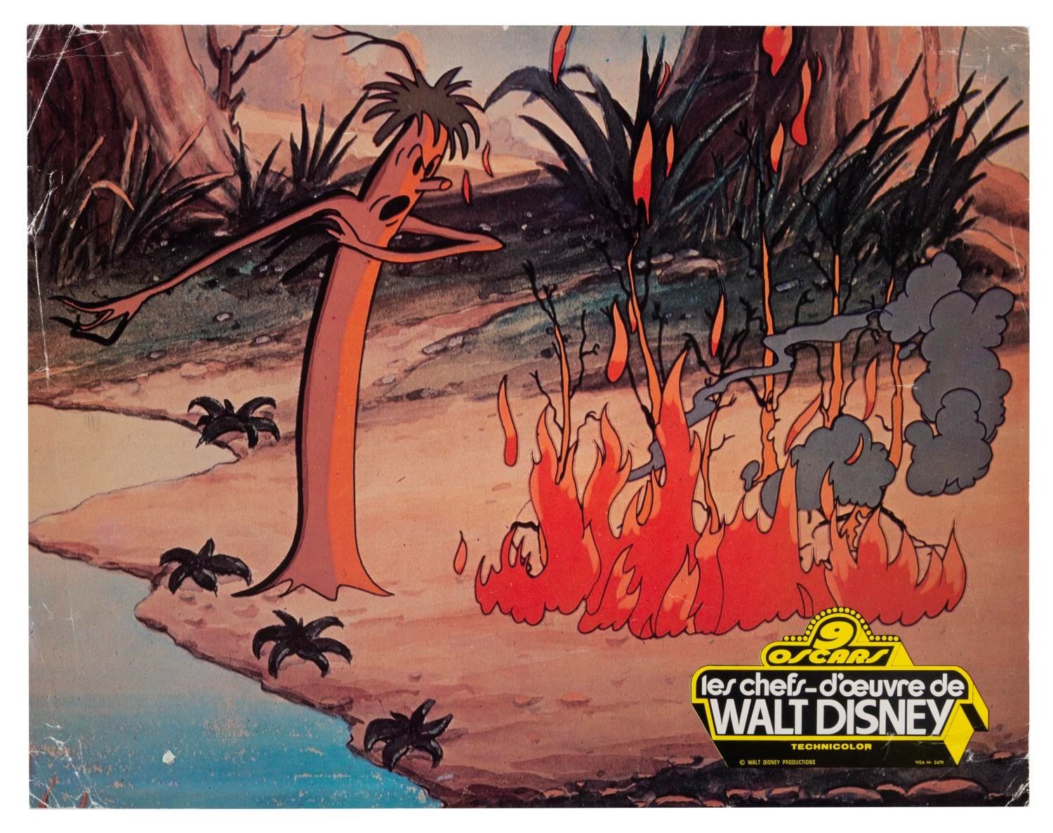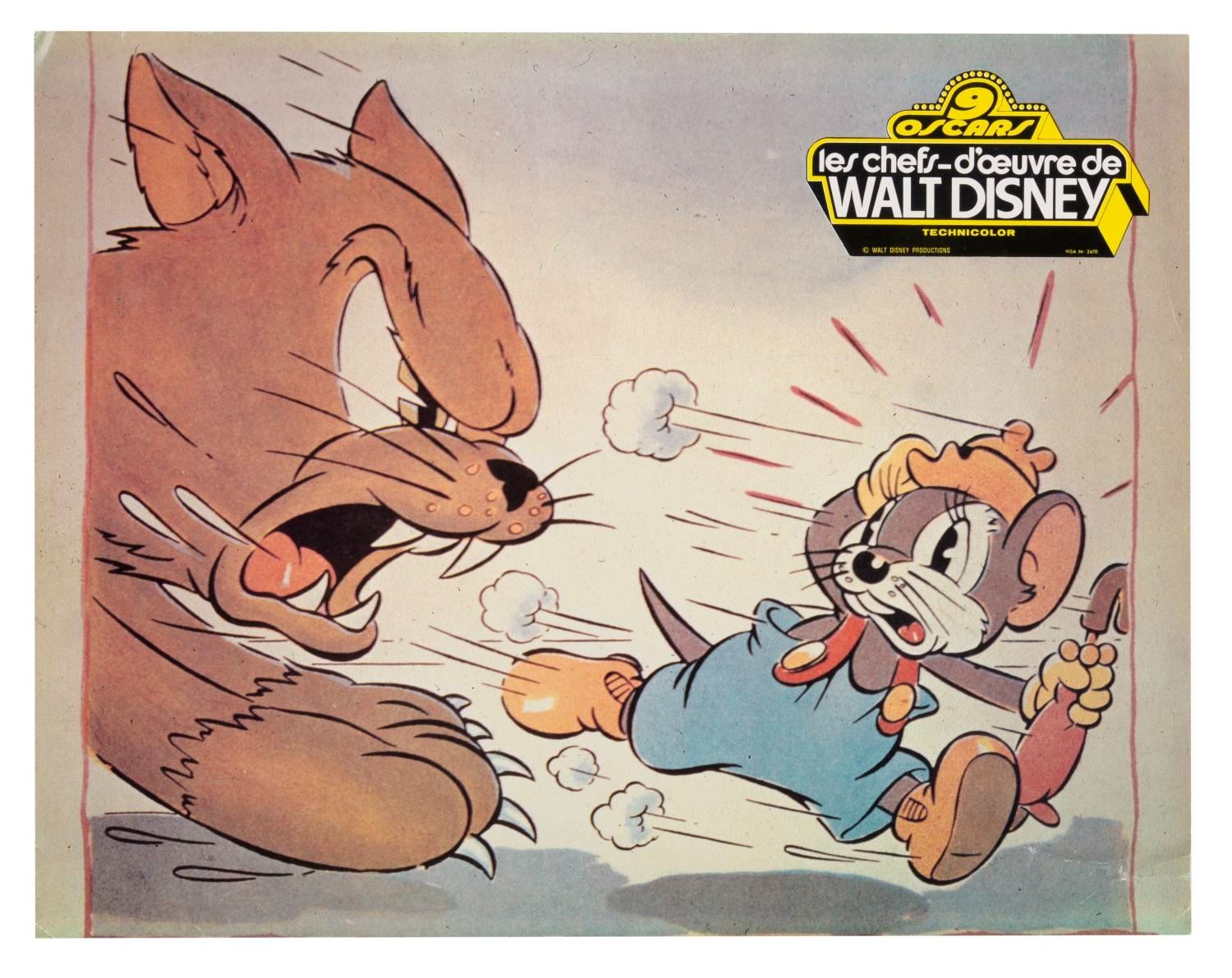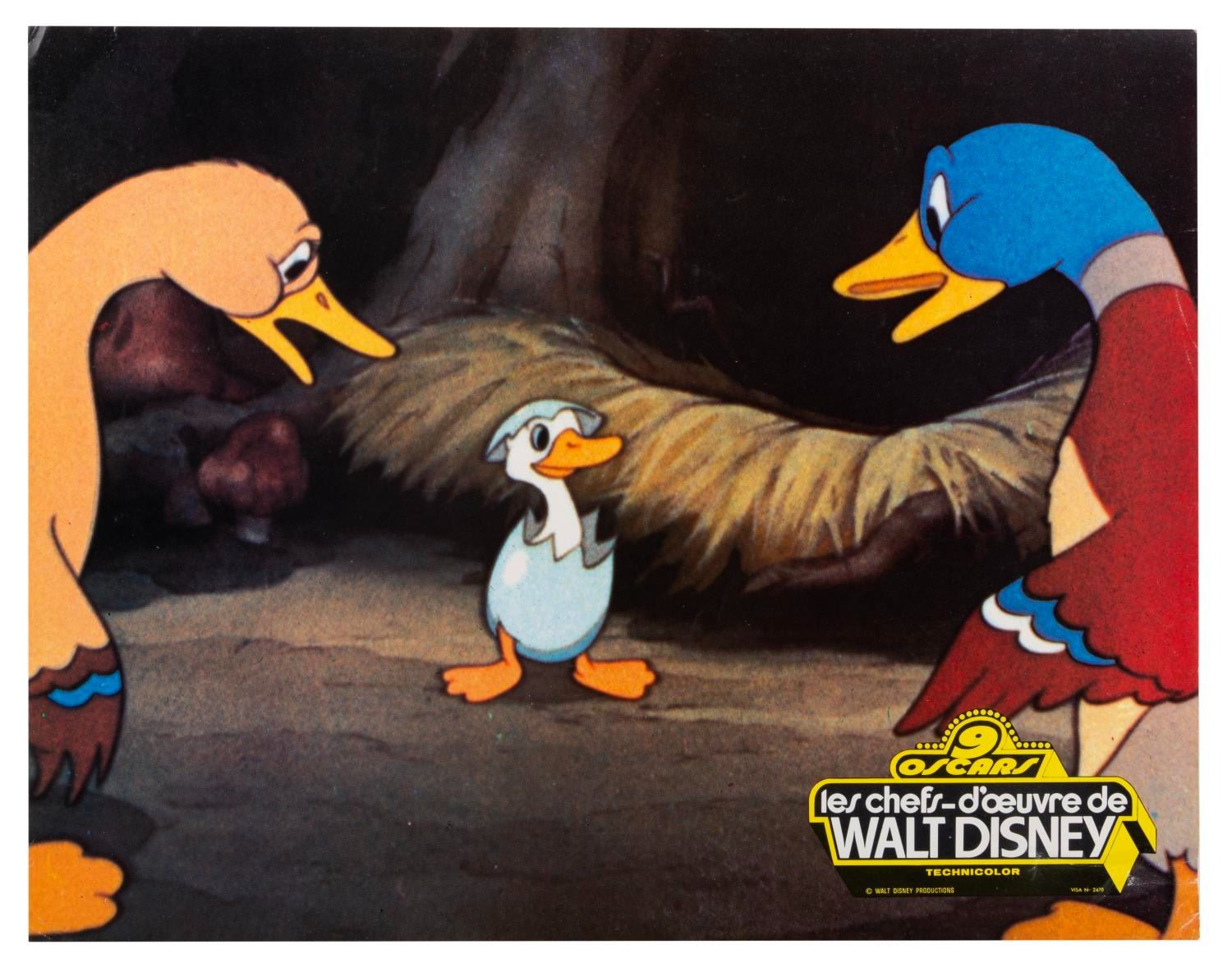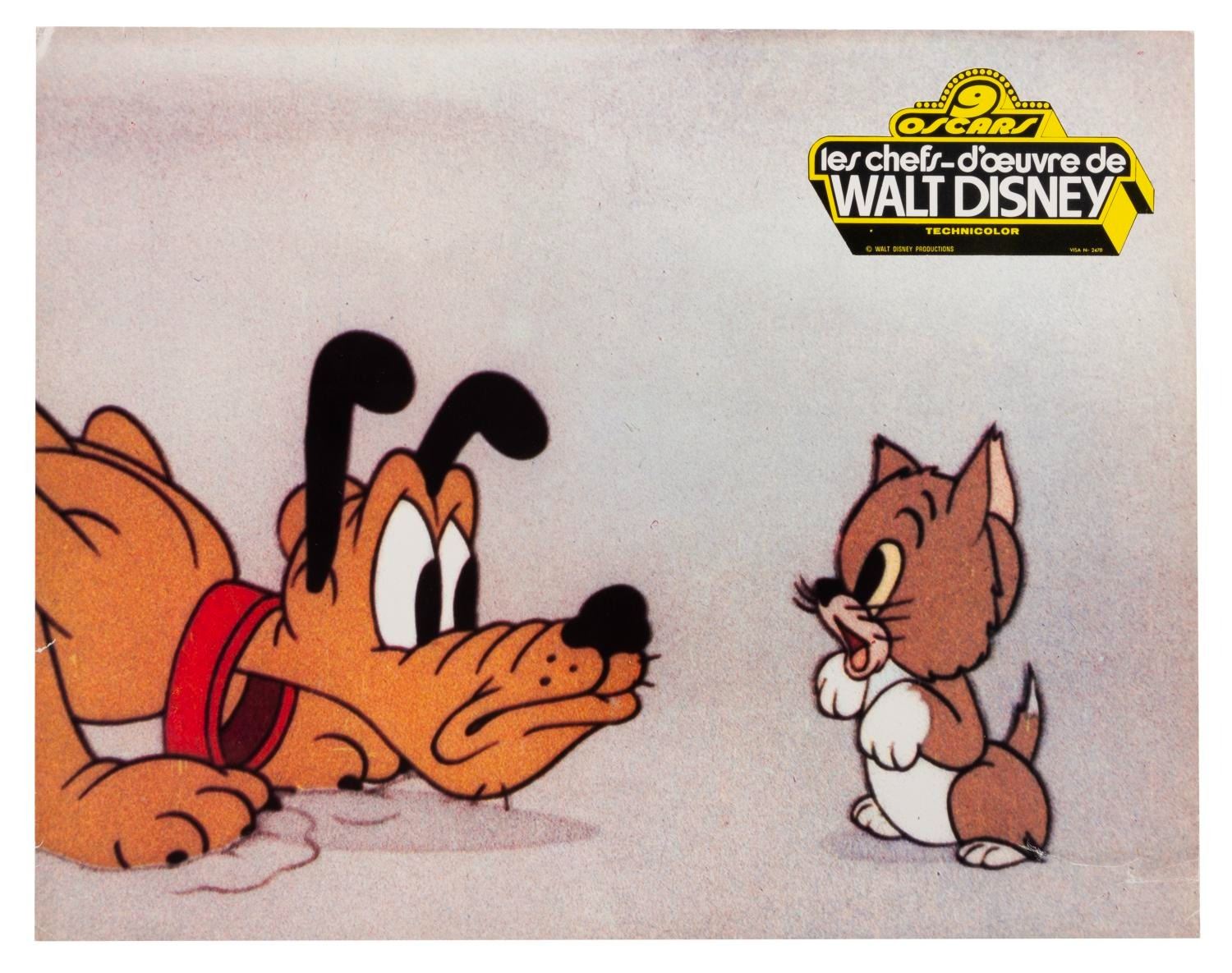 (Disney, 1966) A collection of eight French publicity photos from the 1966 compilation of the Disney Studios' nine Academy Award-winning short films, "Walt Disney's Masterpieces." Included are photos from the shorts "Three Little Pigs," "The Ugly Duckling," "Flowers and Trees," "Ferdinand the Bull," and more. Measuring 9.5" x 12", the photos are in good condition with creasing, edge wear, adhesive residu,e and folds.