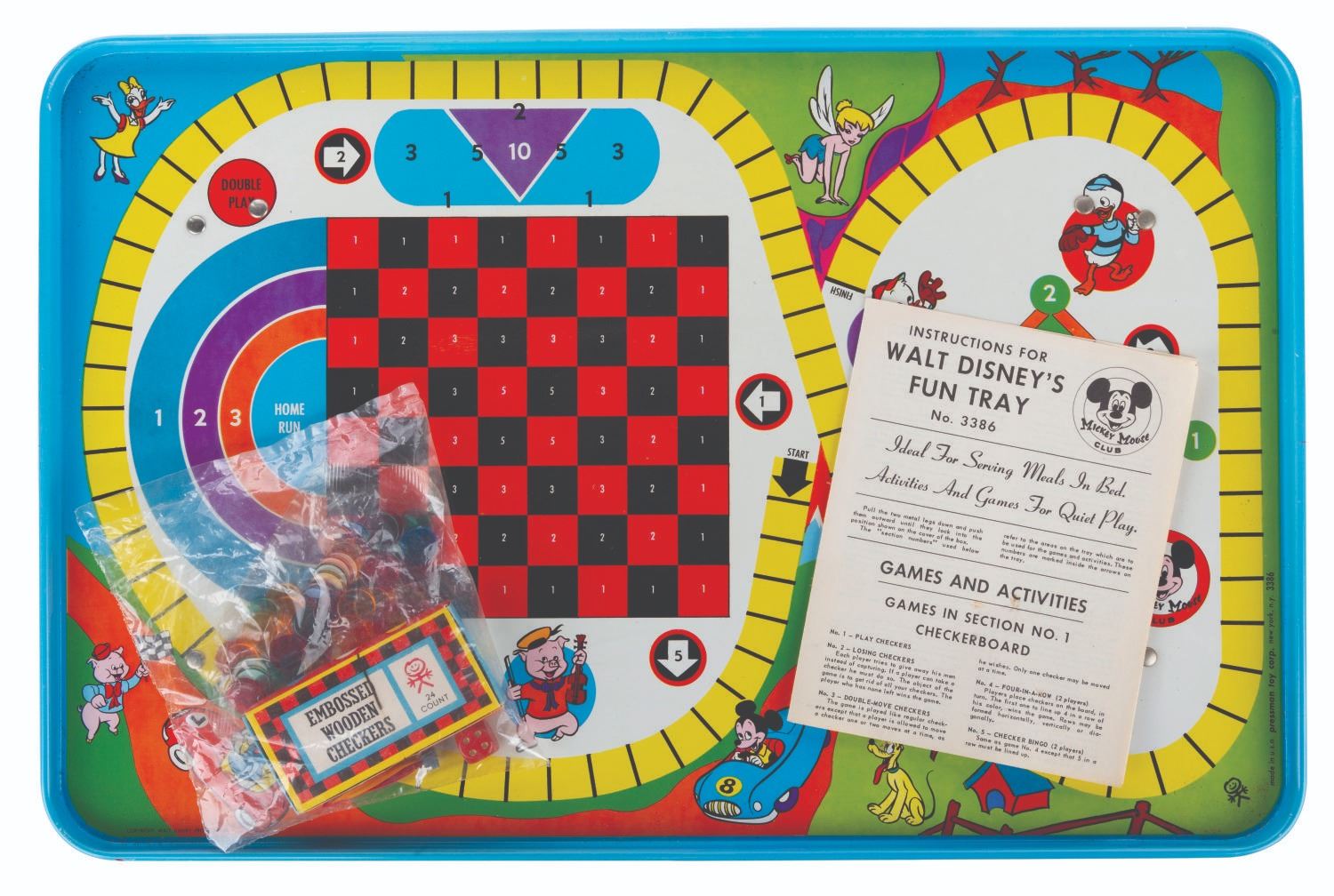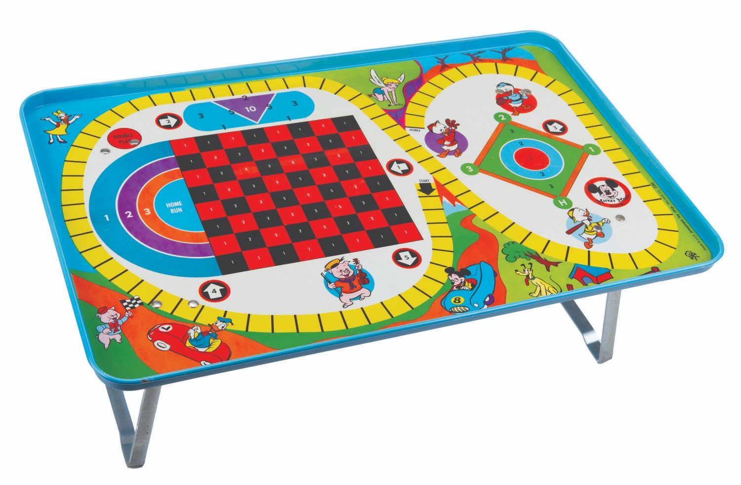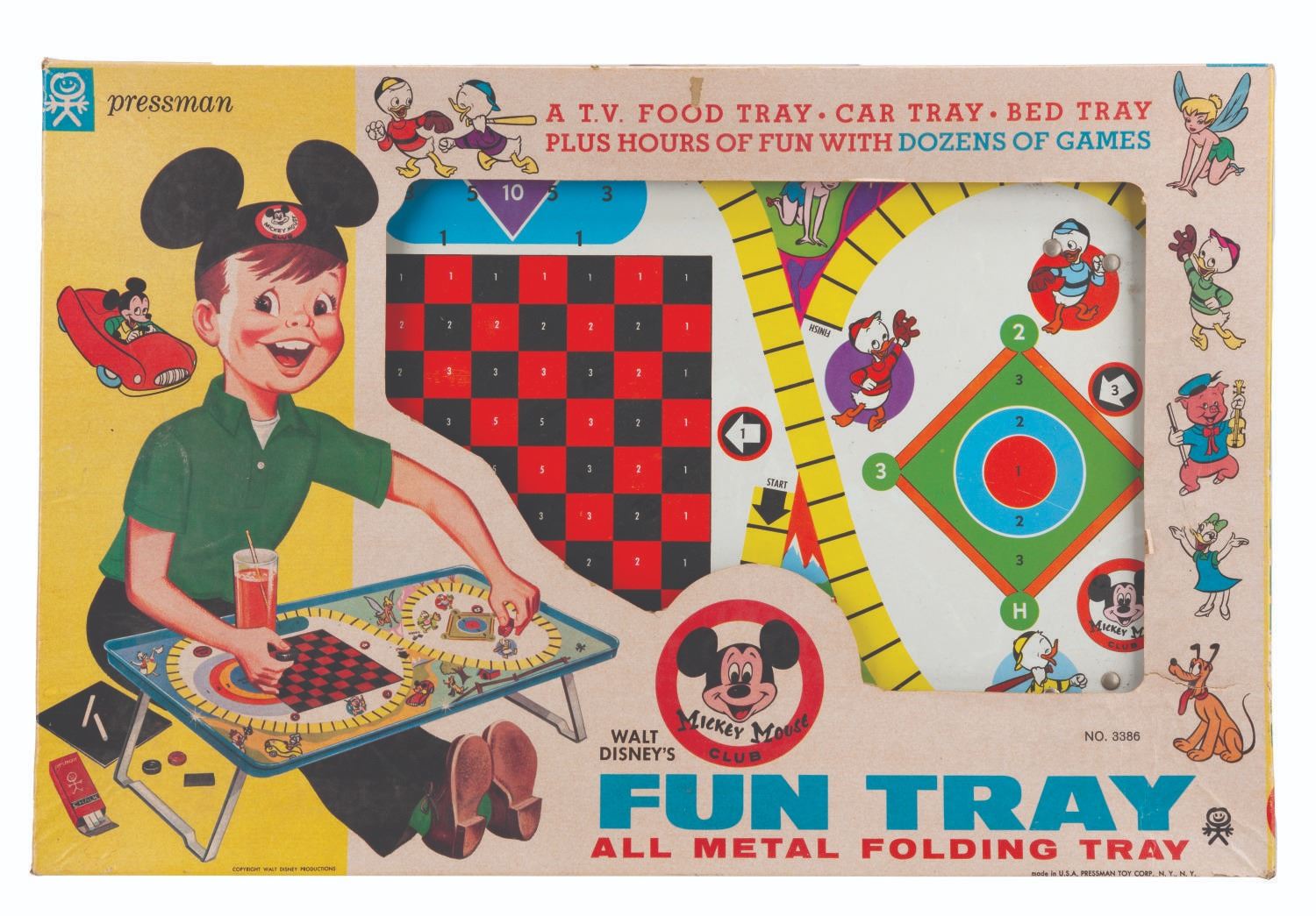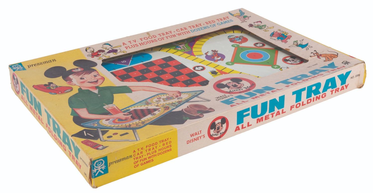 (Pressman, 1960s) A Walt Disney's Mickey Mouse Club Fun Tray that acts as a TV food tray, car tray, or bed tray. The tray consists of five sections to play a total of 41 games, including Checkers, Jumbo, Royalty, Shuffleboard, and Baseball. With two metal legs that pull down and lock into place, the tray measures 7.5" when erected x 20.25", and is in fine condition with very light scuffs and chipping along the edge. In its original good-conditioned box with some discoloration and light edge wear, it contains all its original unused game pieces.