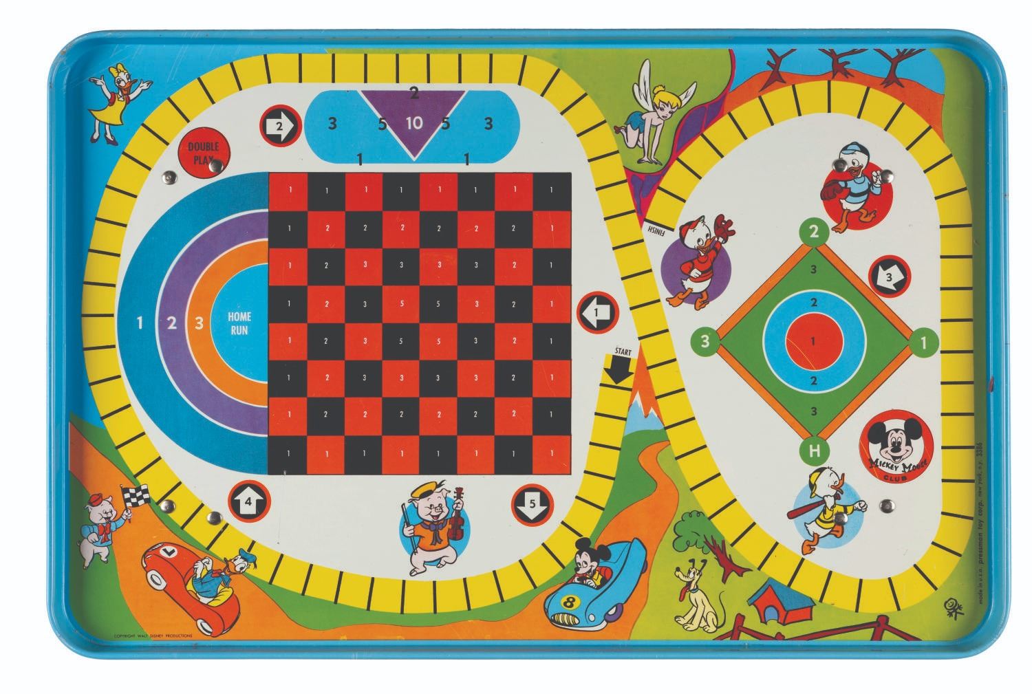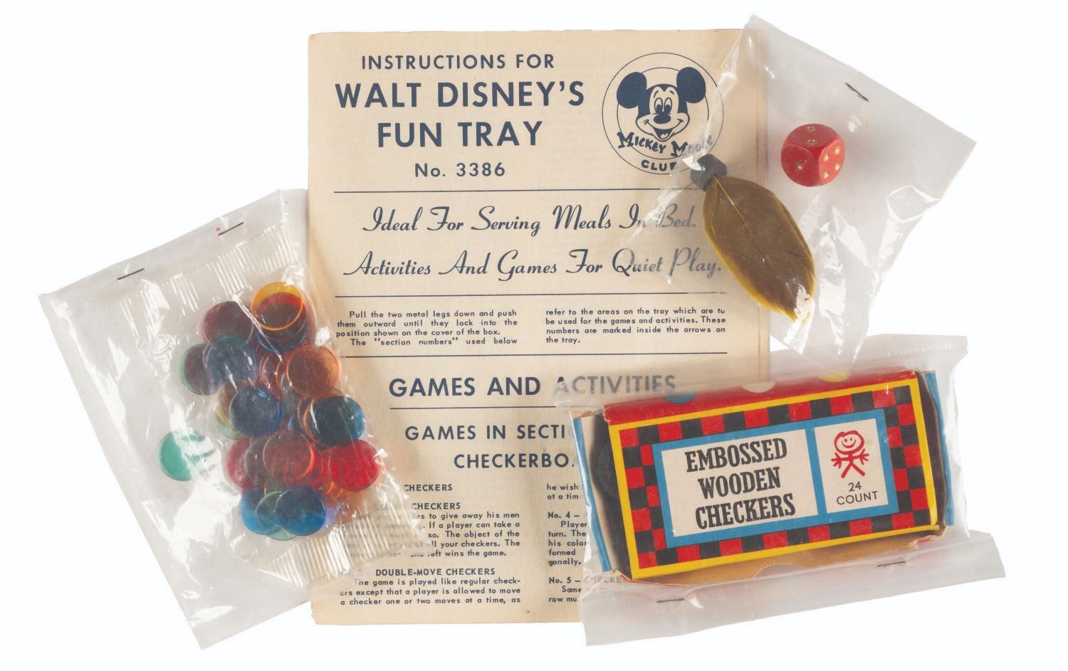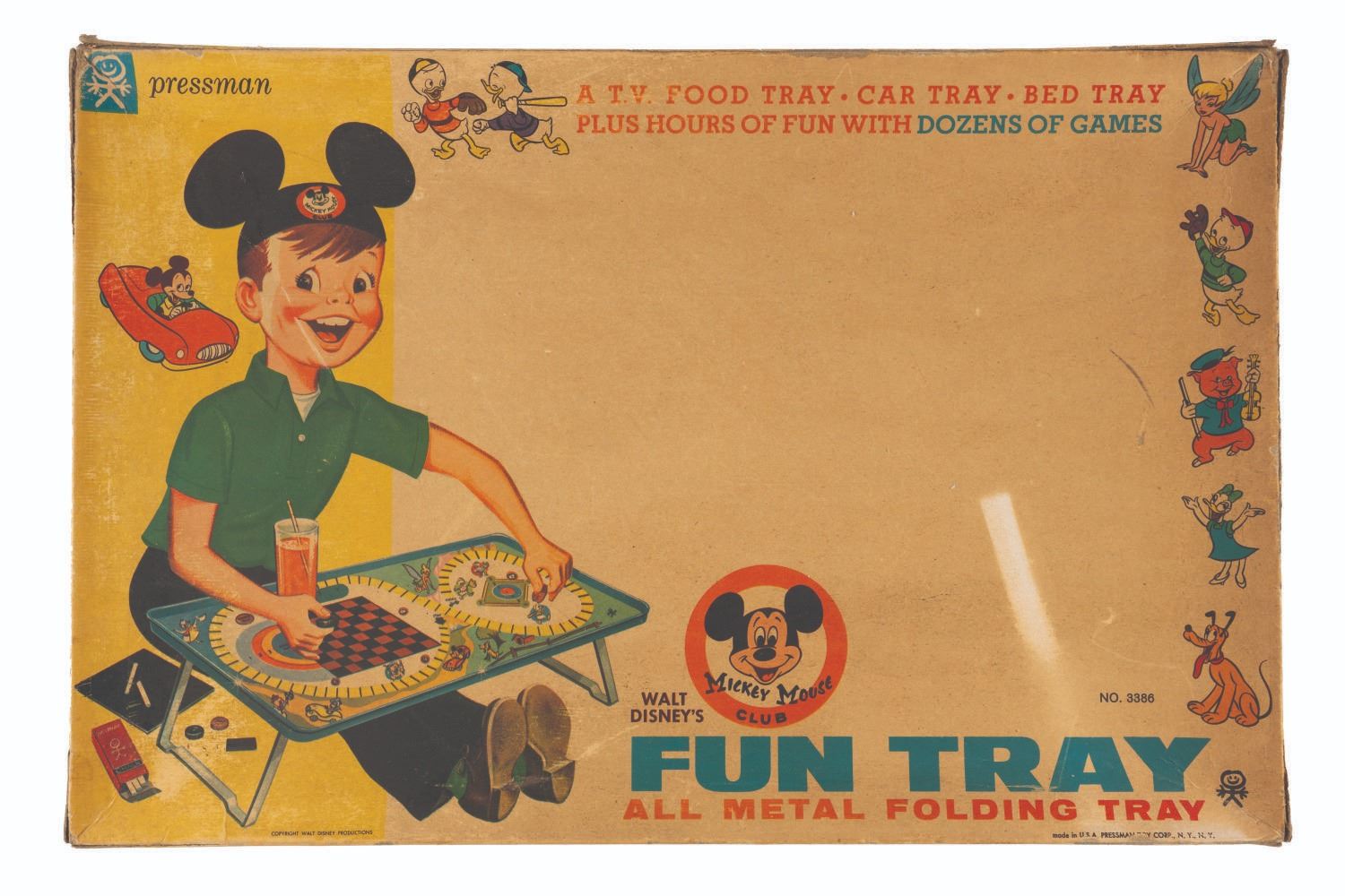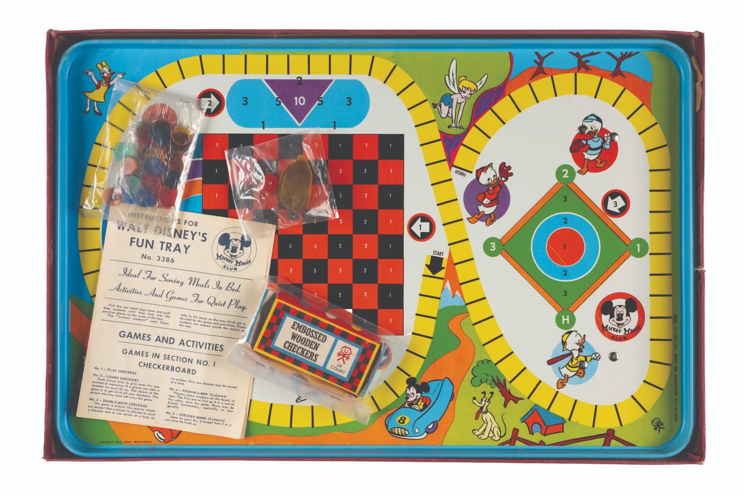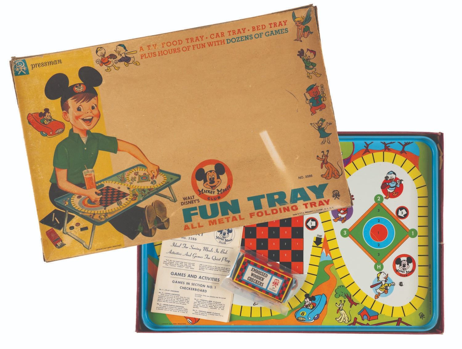 (Pressman, 1960s) A Walt Disney's Mickey Mouse Club Fun Tray that acts as a TV food tray, car tray, or bed tray. The tray consists of five sections with instructions for 41 games, including Checkers, Jumbo, Royalty, Shuffleboard, and Baseball. Measuring 13.25" x 20.5" x 7.25", the tray is in very good condition with slight wear from use, including very fine scratches. Included are unopened packages of checkers, markers, and one die. The box is in fair condition with discoloration and wear throughout, and split corners to the lid.