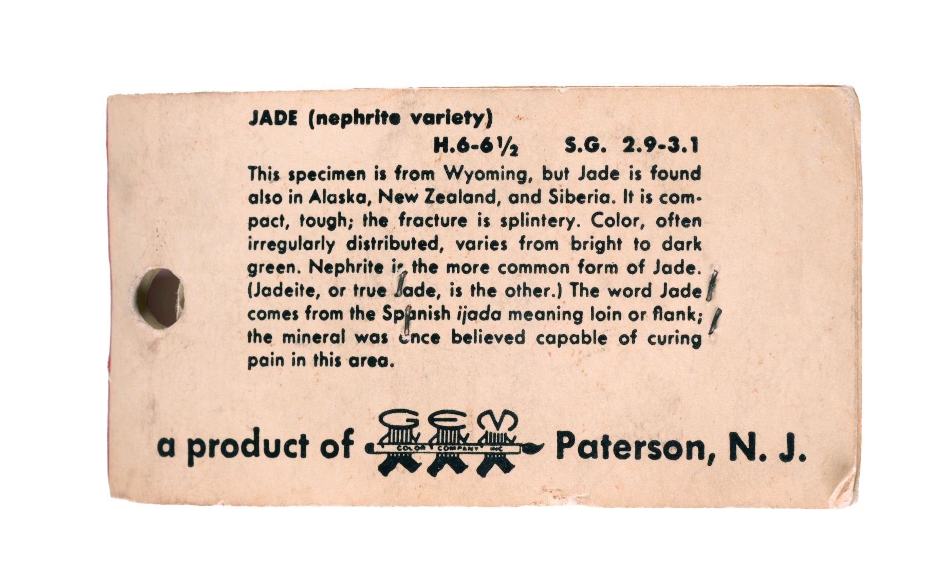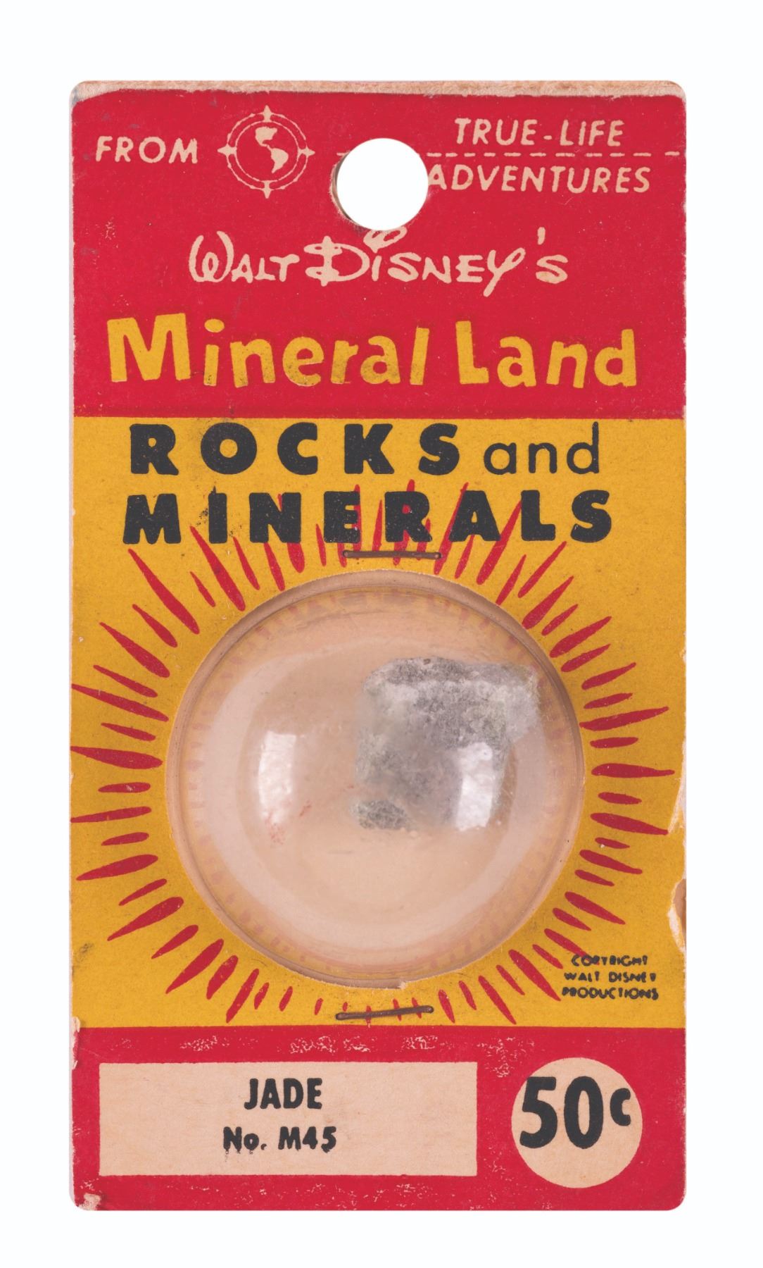 (Disneyland, 1960s) An extremely rare Walt Disney's True-Life Mineral Land Rocks and Minerals Jade specimen. Specimens like this were sold in relation to Walt Disney's True-Life Adventures series and offered for sale through hobby shops, department stores, and through Mineral Hall in Frontierland. This fragment comes sealed within its original plastic bubble and on original card measuring 3.5"x2". This rare souvenir of Disneyland is in good condition, with minor dimples and stress to bubble and fading, edge wear, and soiling to some card back.