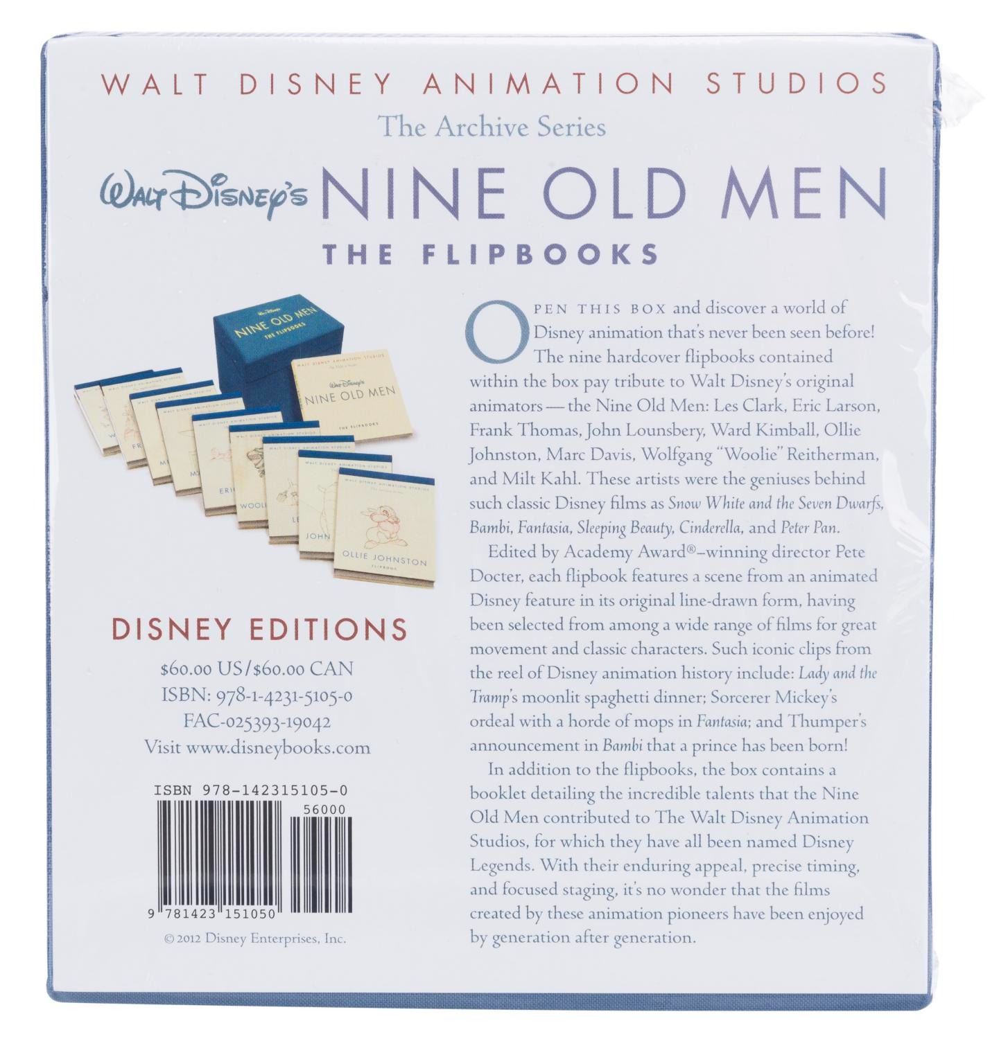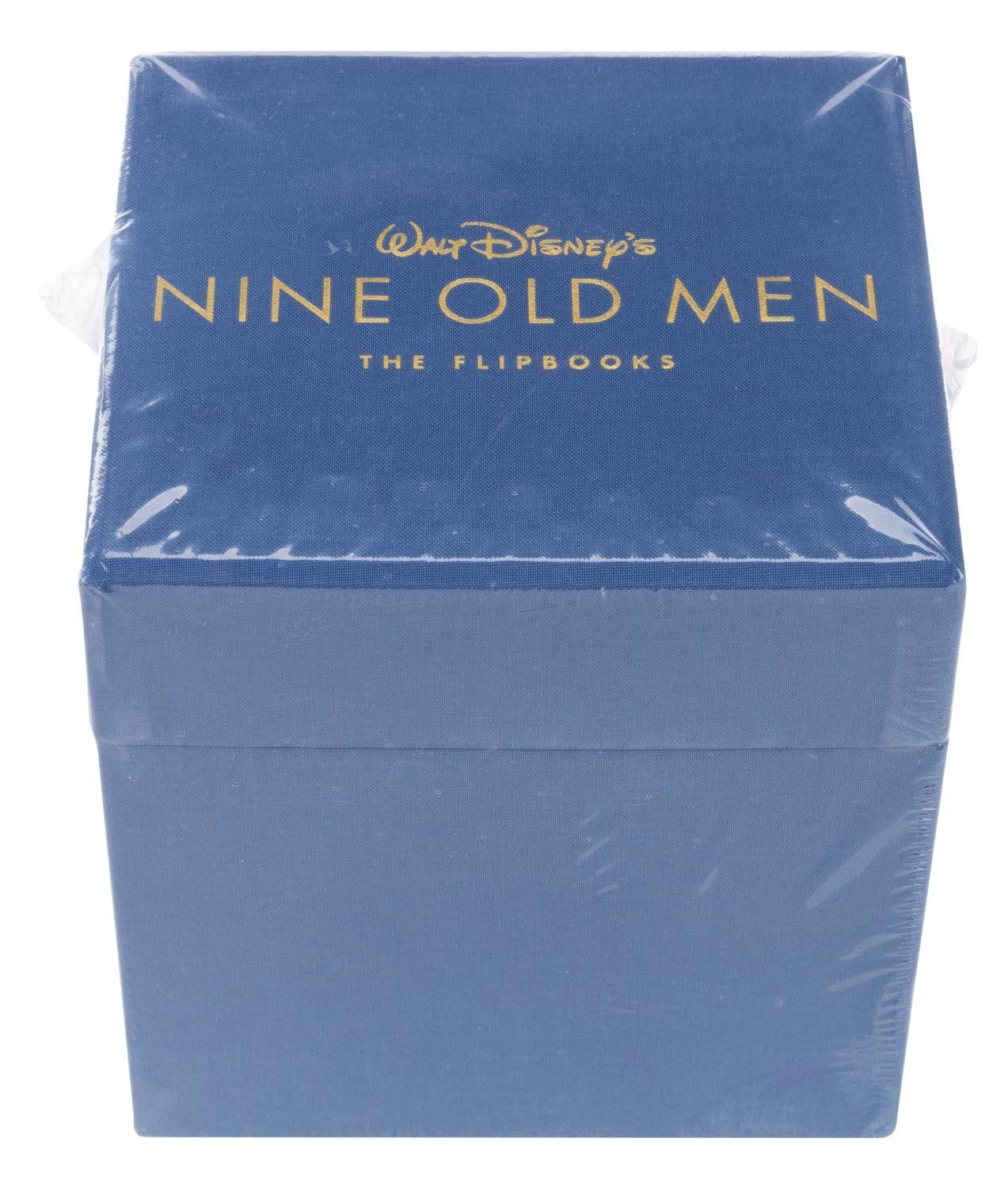 (Disney, 2012) A boxed set of 9 hardcover flipbooks edited by Pete Doctor and released by Disney Editions. Each book spotlights artwork by one of “Walt Disney’s Nine Old Men” - Les Clark, Eric Larsen, Frank Thomas, John Lounsbery, Ward Kimball, Ollie Johnston, Mark Davis, Wolfgang Reitherman, and Milt Kahl. The flipbooks consist of sequential animation drawings for scenes from classic Disney films, including “Alice in Wonderland,” “Fantasia,” “Peter Pan,” “Bambi,” “Pinocchio,” and more. An additional softcover volume of the artists’ biography is also included. Measuring 5.25” x 6.25” each, the flipbooks are in very fine condition, housed in a lidded cloth and board box, embossed with the Disney Edition’s title. Measuring 6.25” x 6.75” and 5.75” deep, the boxes are in very fine condition, in original shrink-wrapping.