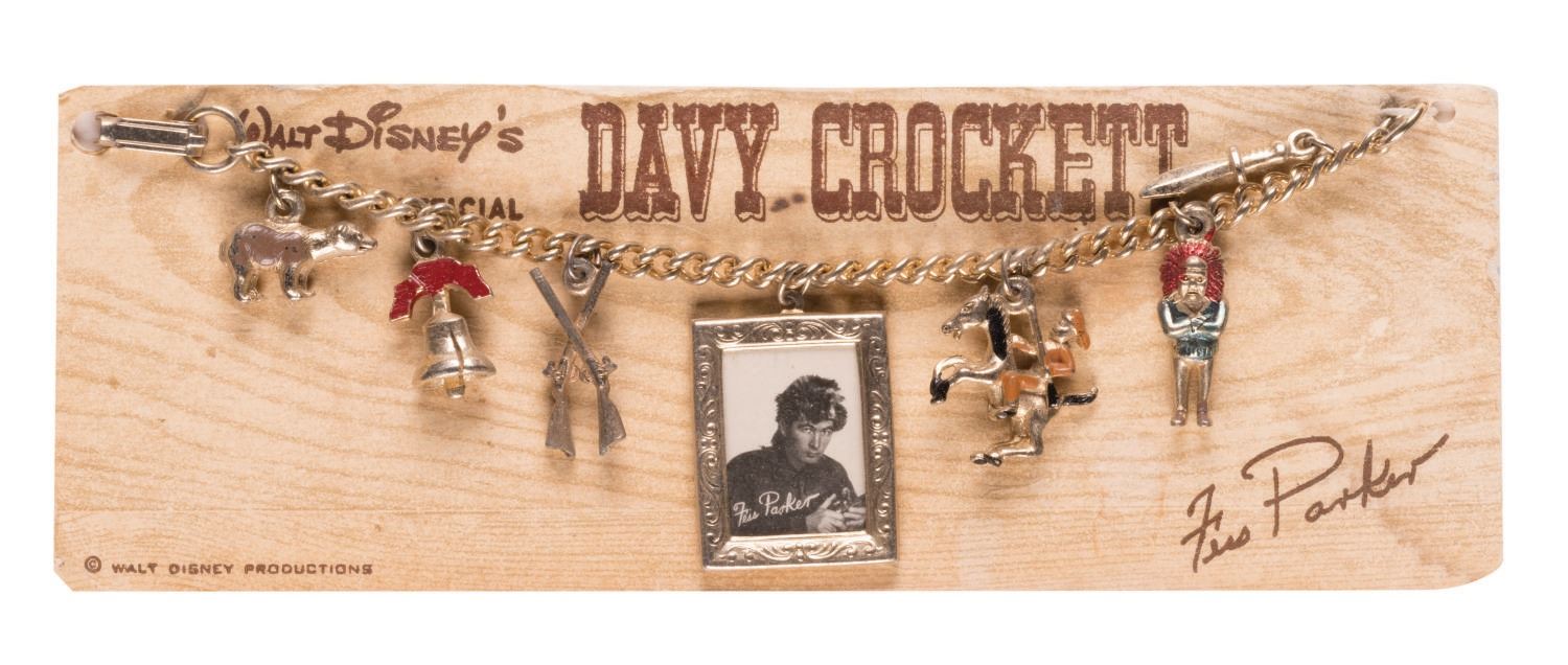(Disney, 1950s) A Walt Disney's Official Davy Crockett Charm Bracelet on the original card. Among the (7) charms are a bear, the Liberty Bell, and a miniature photo image of Fess Parker as Davy Crockett. The bracelet is in very good condition with A few small scratches to patina of charms, and creases to card.