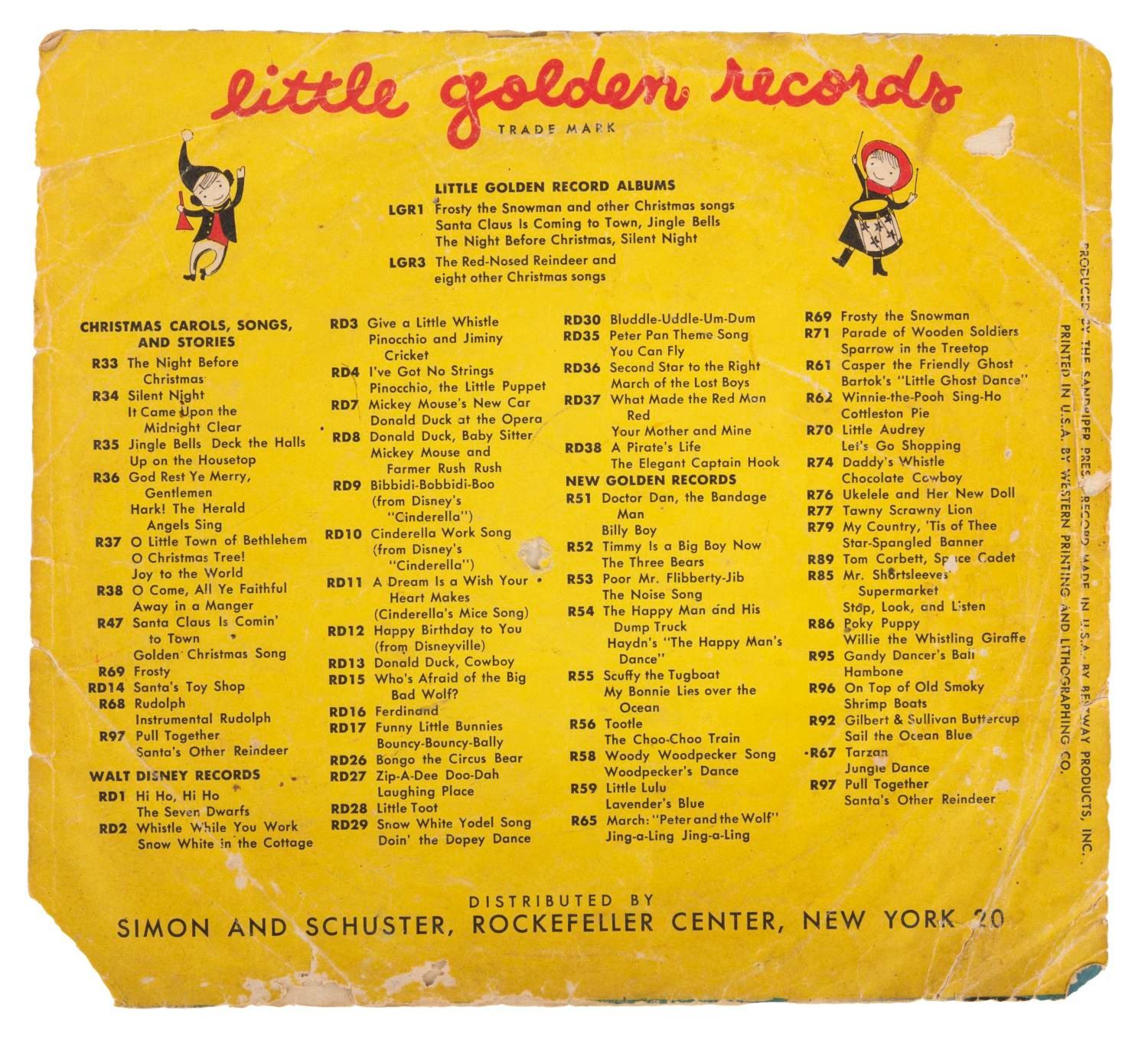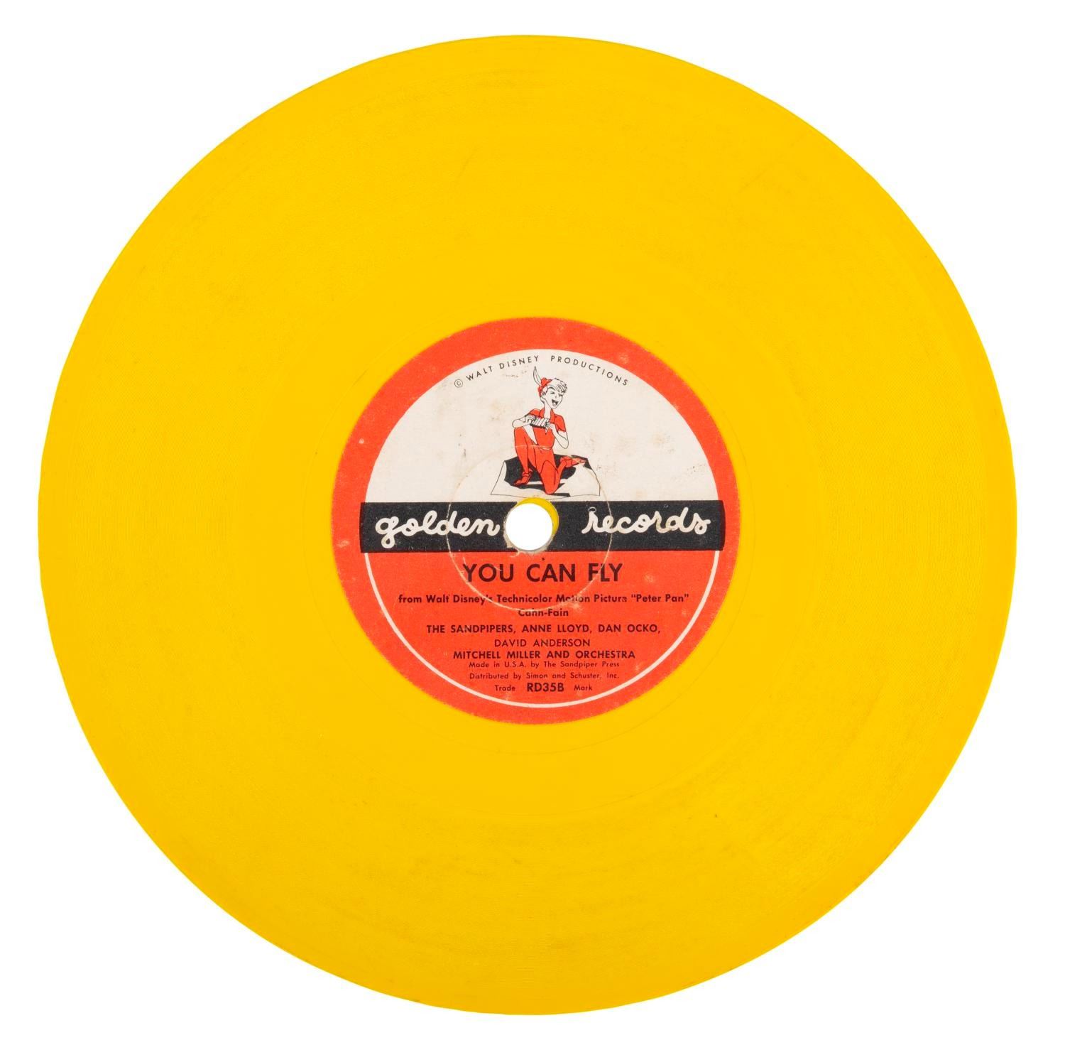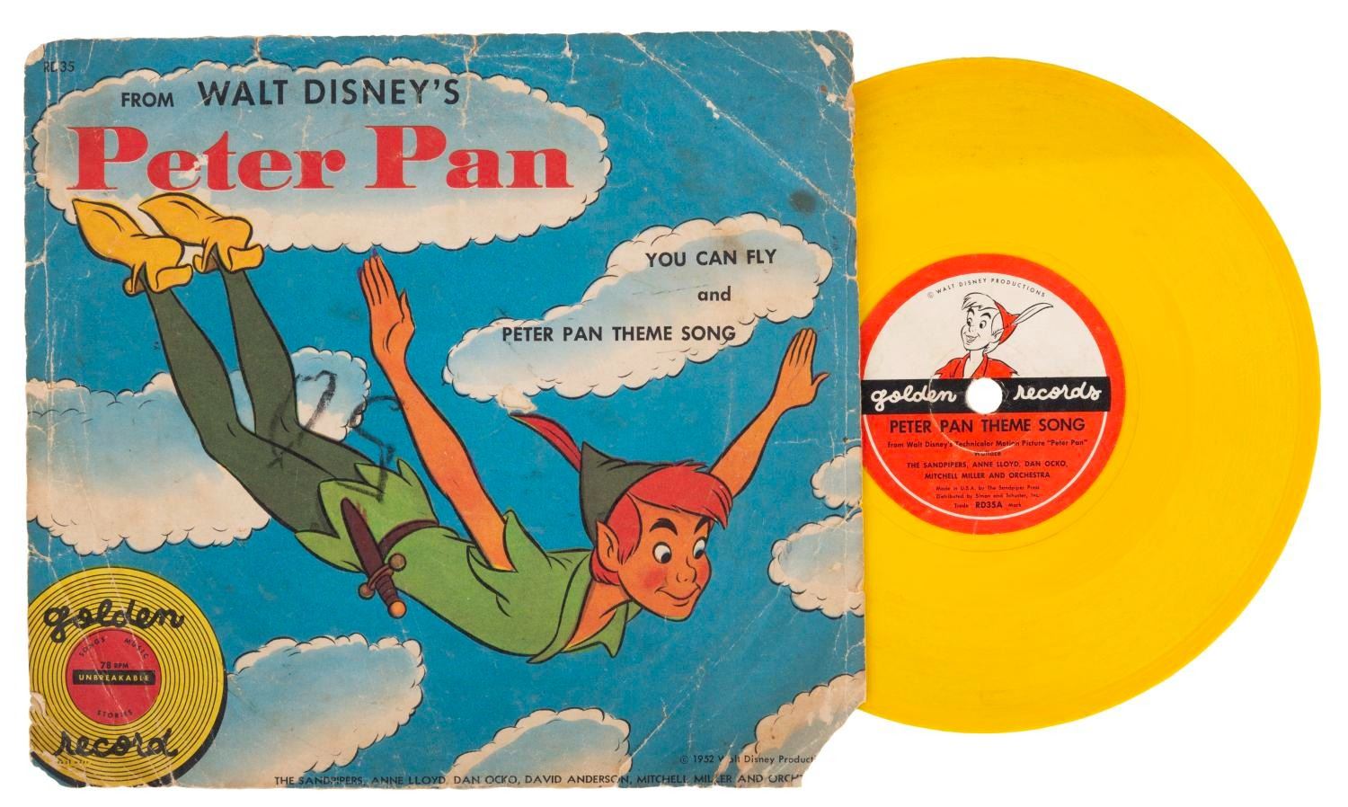 (Simon & Schuster, 1952) A Golden Records 78 RPM single of "You Can Fly" backed with "Peter Pan Theme Song." The 6" yellow vinyl single and 7.5" x 7" sleeve are in fair condition, with much wear, including split edges and a crayon mark on the front of the sleeve.