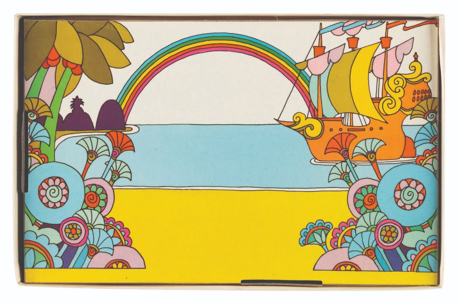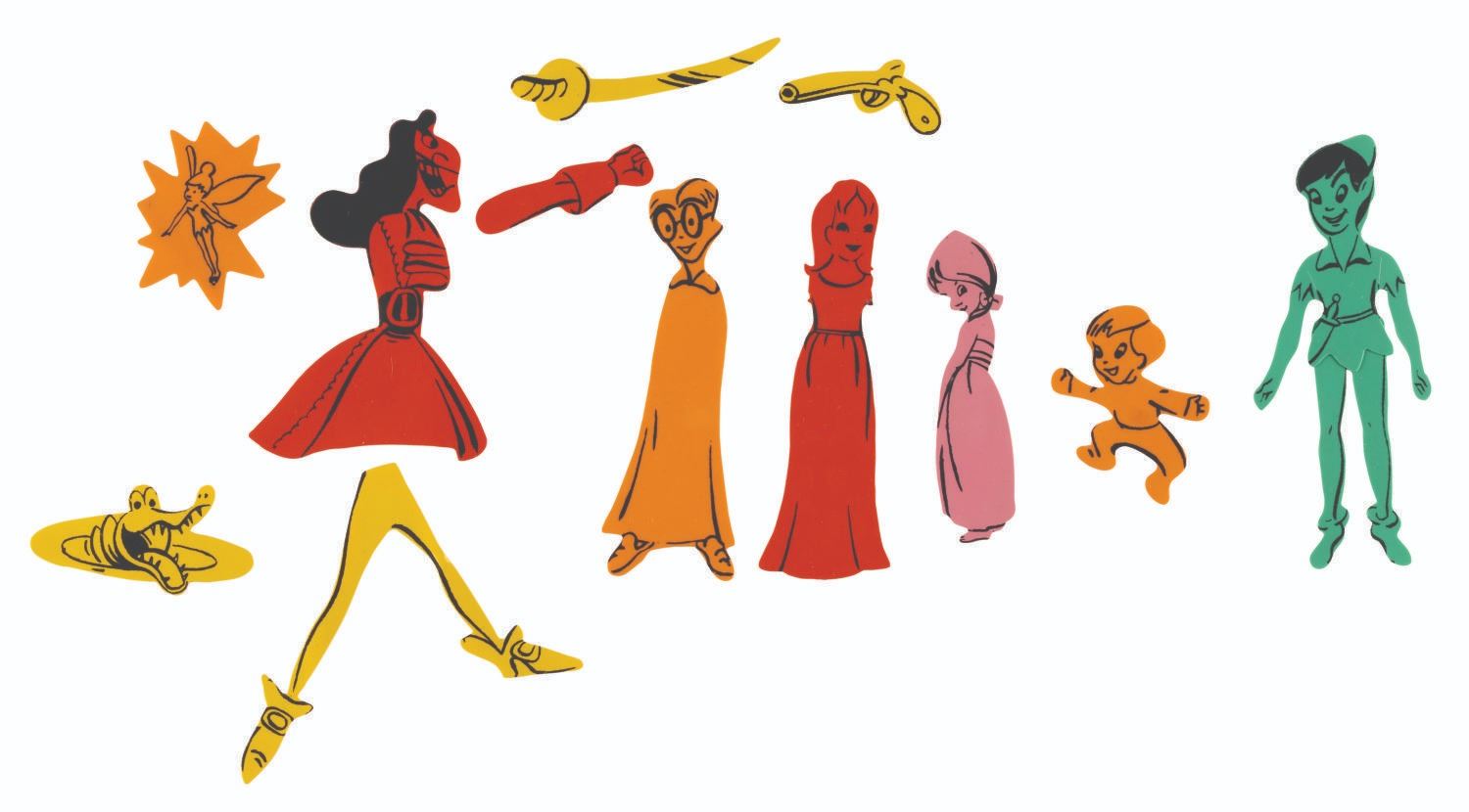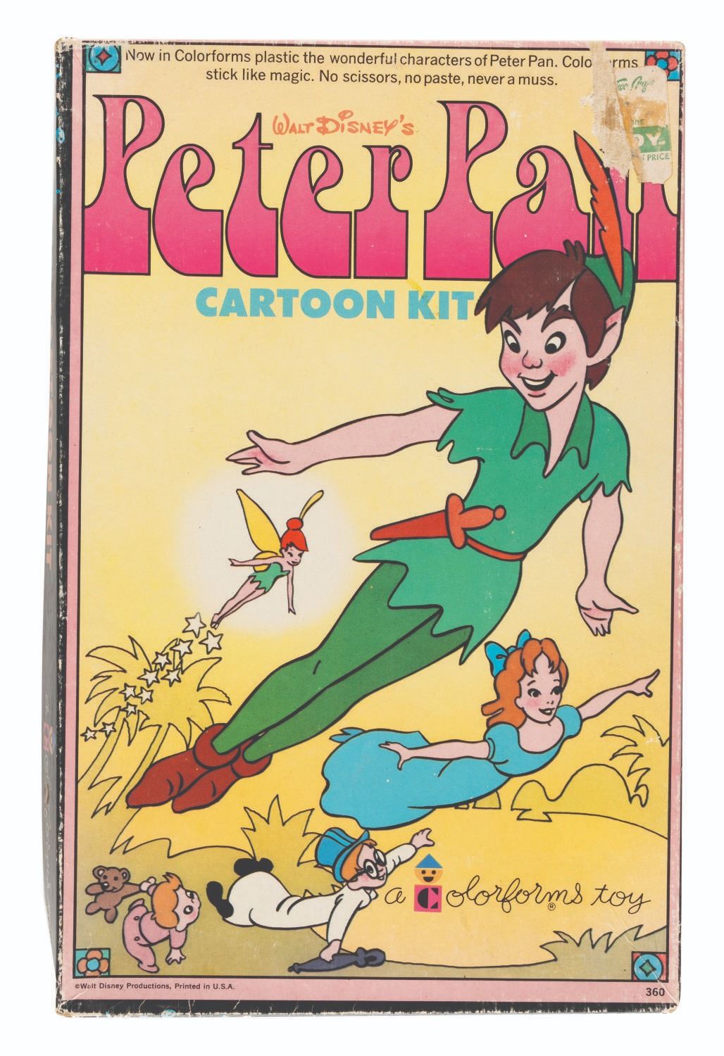 (Colorforms, 1970s) A Walt Disney's Peter Pan Cartoon kit by Colorform. The incomplete kit has 12 plastic pieces of characters and props and one Never Land workboard that was restyled from earlier versions of the toy. Measuring 8" x 12.5" x 1", the set displays in good condition with edge wear and fading to the box.