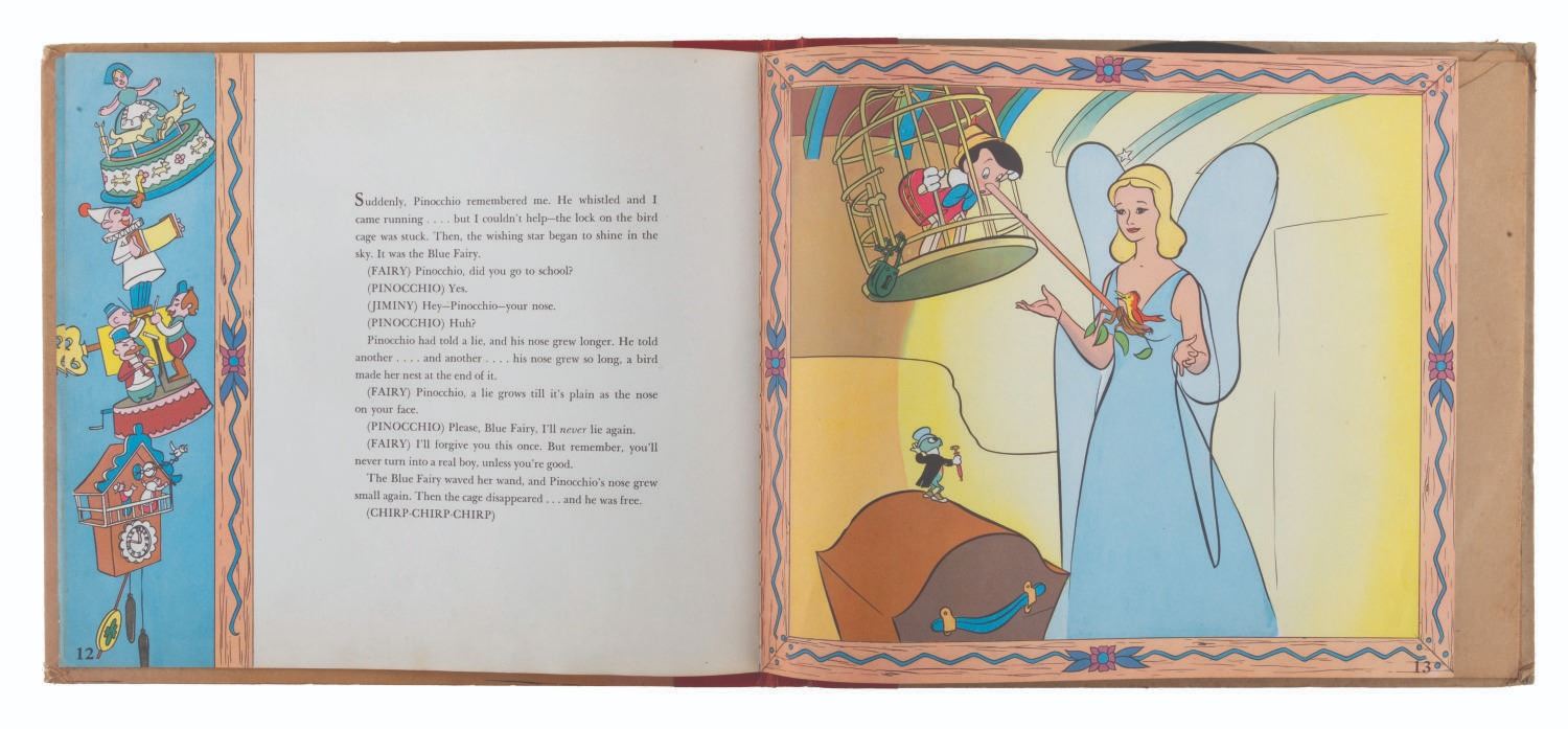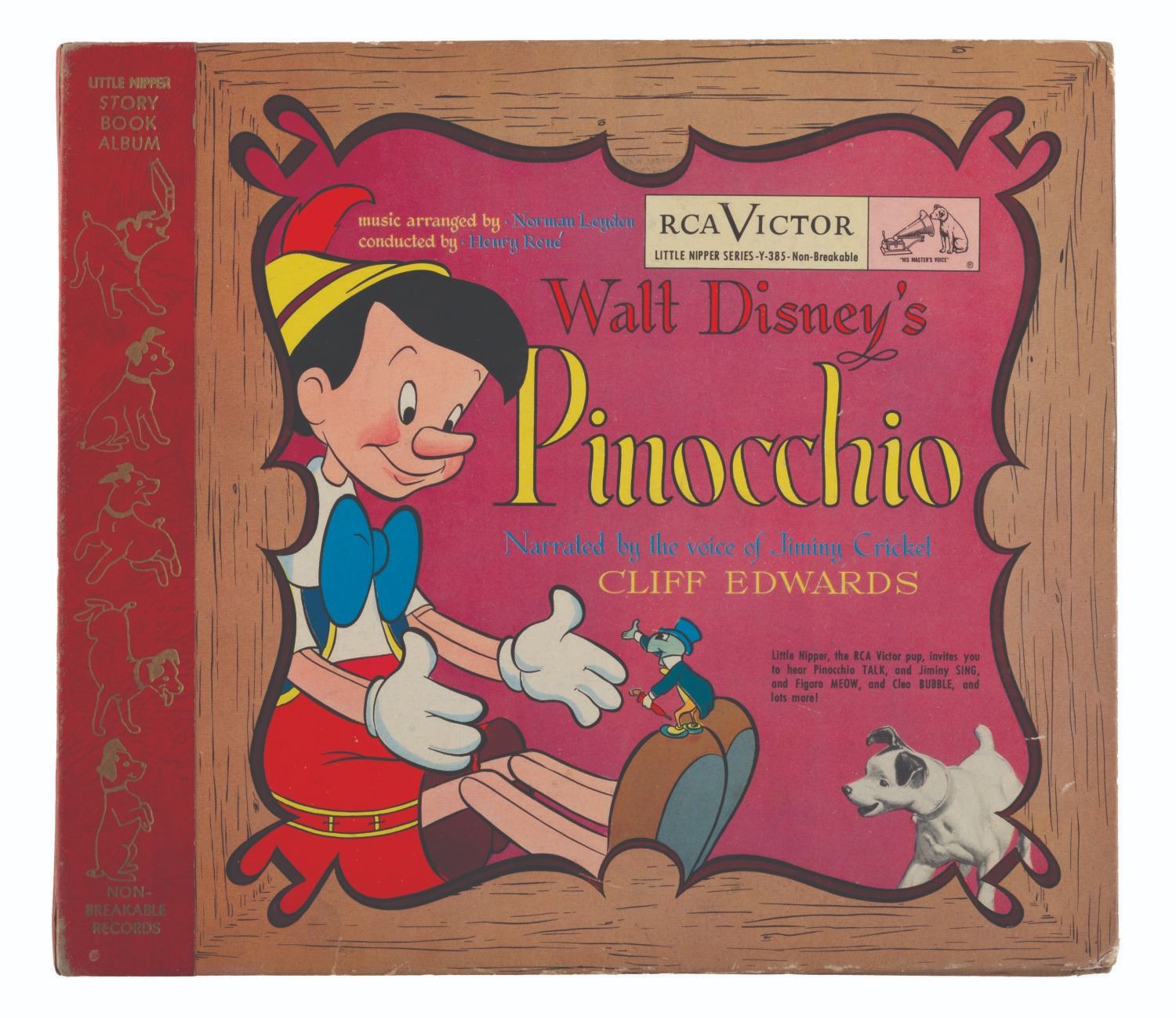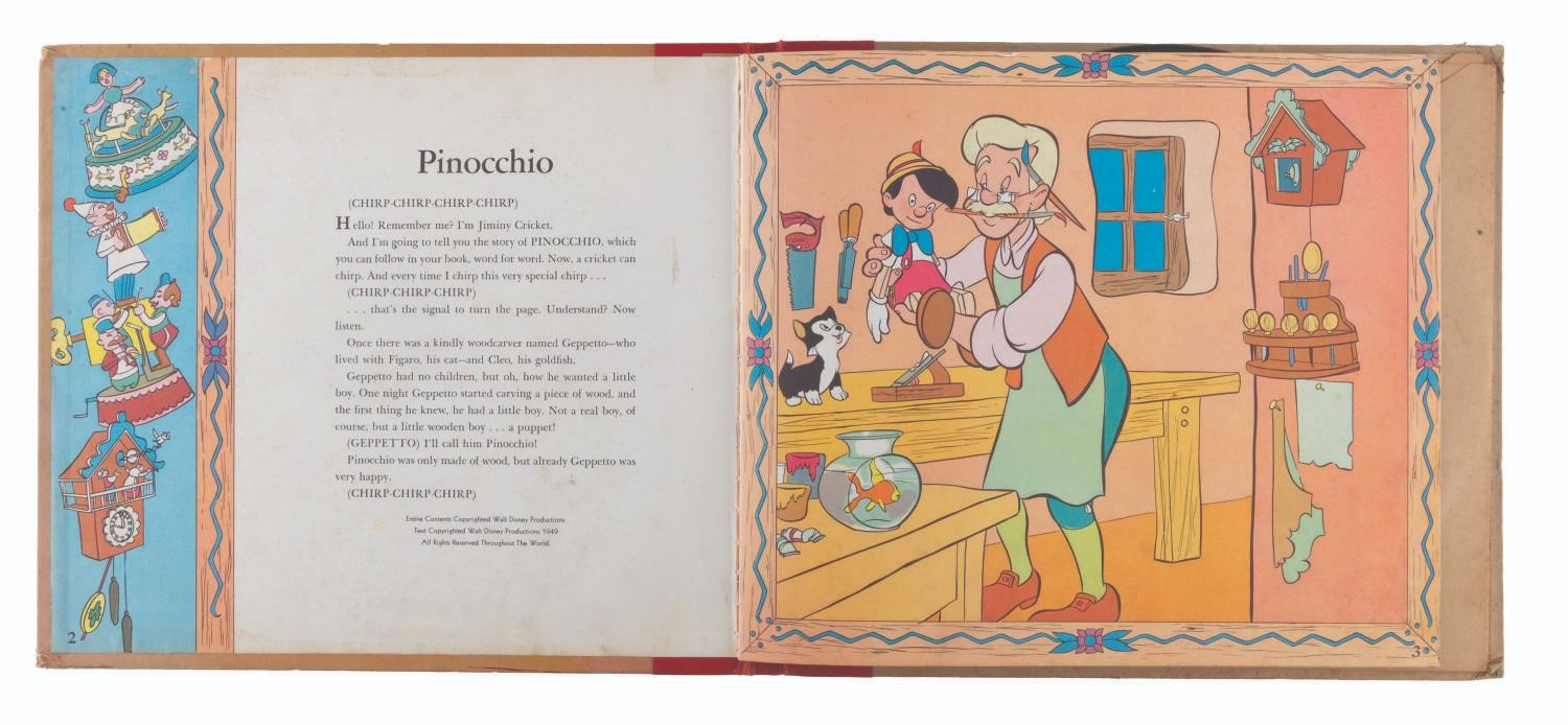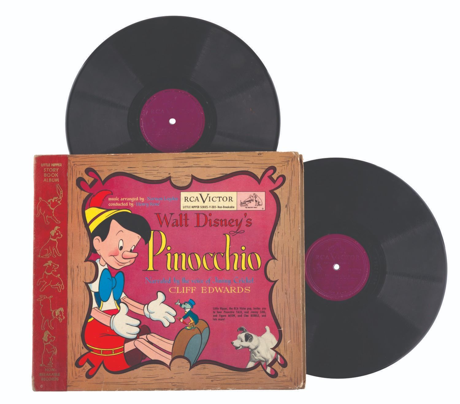 (RCA Victor, 1949) A Walt Disney’s "Pinocchio" illustrated storybook and album read by Cliff Edwards, the voice of Jiminy Cricket. Measuring 10" in diameter, the records are playable in fair condition with heavy scratches, stains, and crackling when side 1 is played. The 10.5" x 12" storybook album displays in very good condition with scratches, edge wear, and a 1.25" tear on the last page of the 24-page book.
