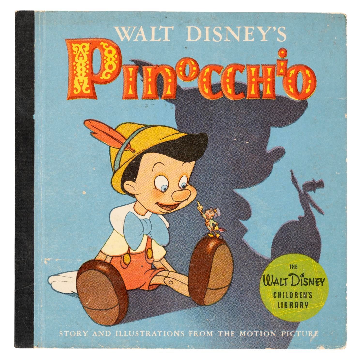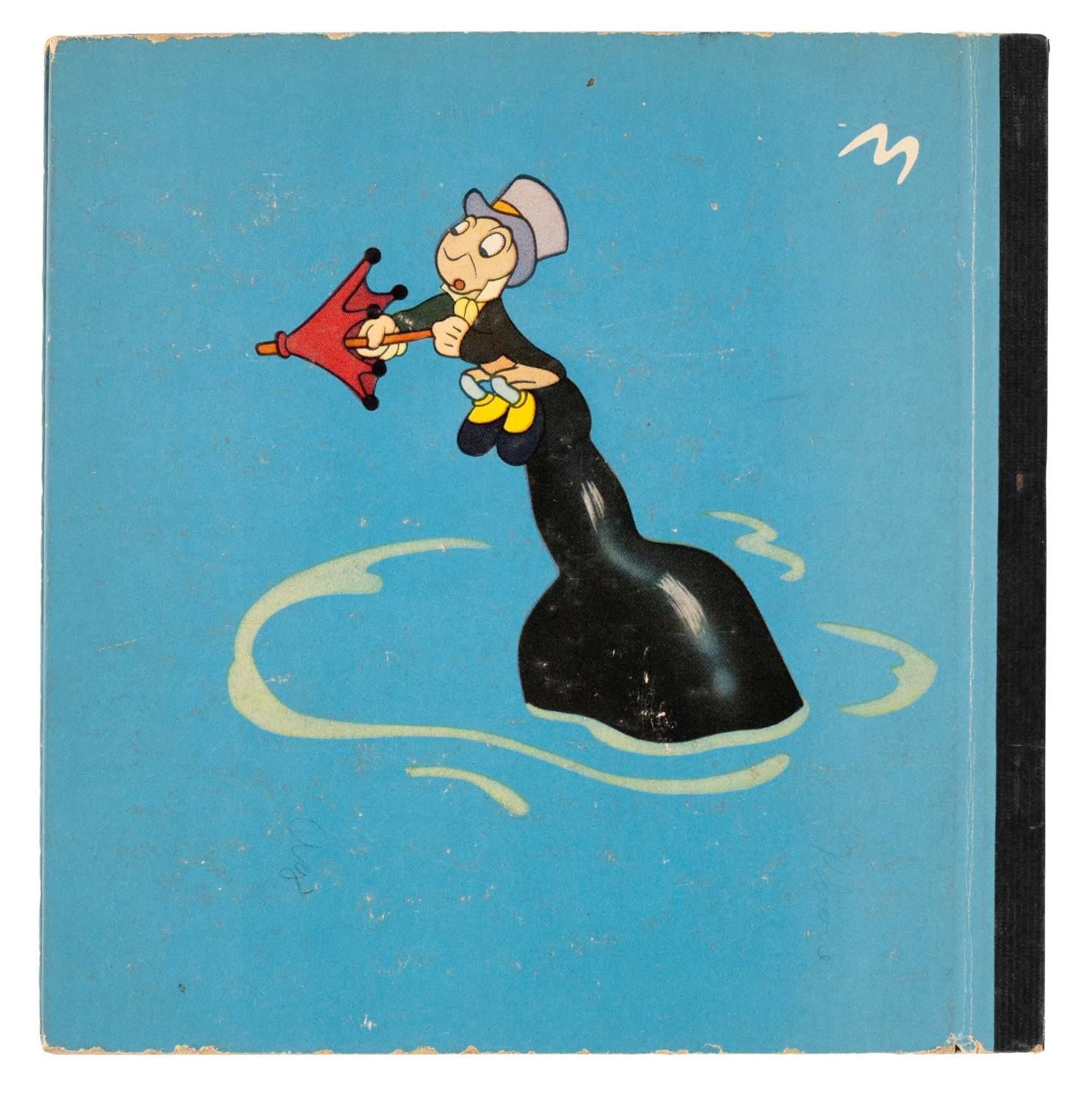 (Whitman, 1940) A Walt Disney’s “Pinocchio” storybook from The Walt Disney Children’s Library collection. Measuring 7.25” x 7.25”, the book is in good condition with pencil notations on the title page, scratches, wear, and discoloration from age.