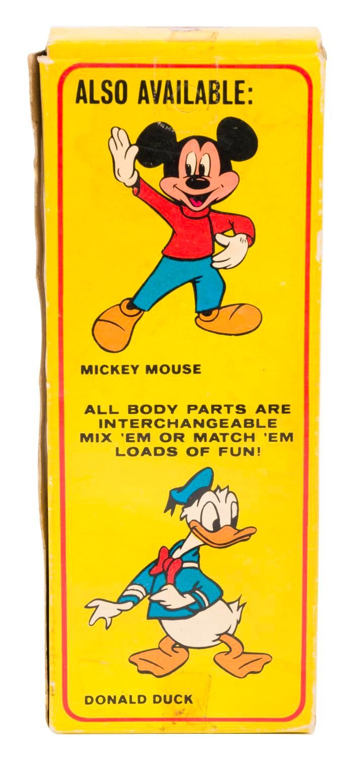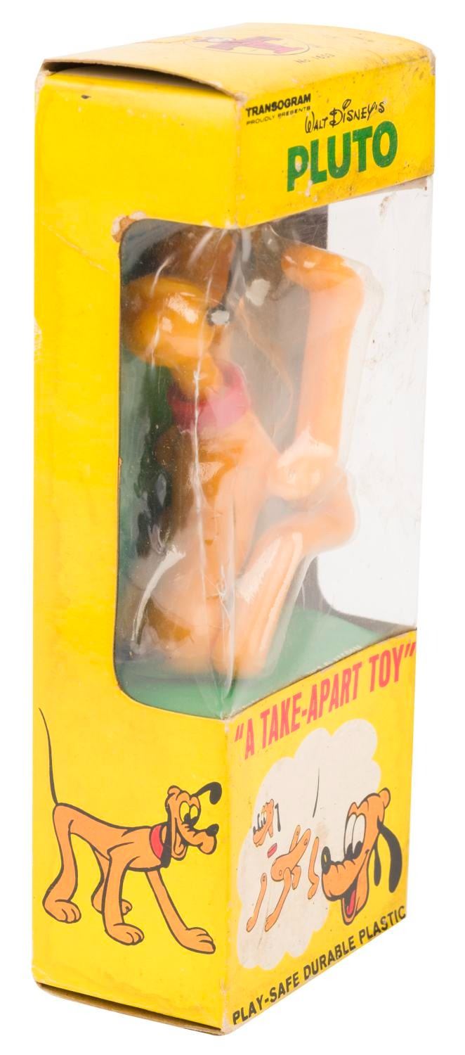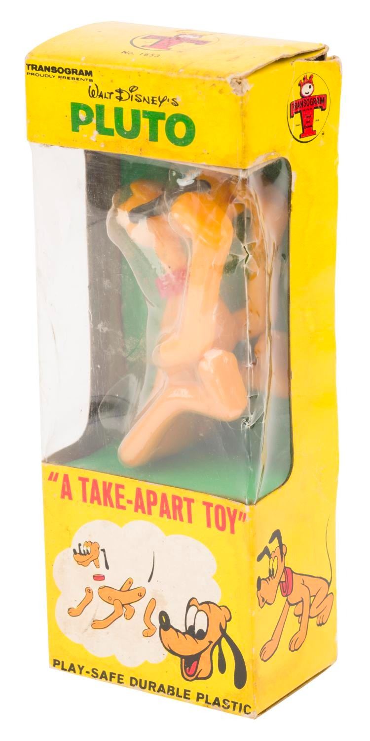 (Transogram, 1950s-60s) A Walt Disney's Pluto "A Take-Apart Toy" with interchangeable parts and the original box. The 2.75" tall, 4" long, and 2" wide figure is in presumed fine condition and comes packaged in the 8" x 3.5" and 2" deep box, which displays much wear, creases, and minor tears throughout.
