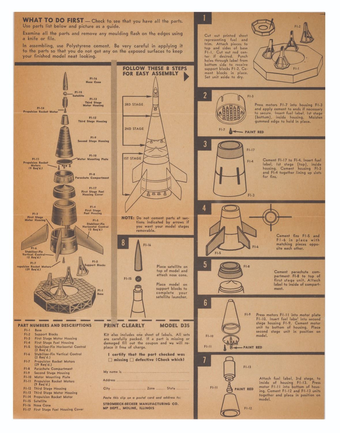 (Strombecker, 1956) An instruction sheet for Walt Disney's Satellite Launcher model kit, manufactured by Strombecker and inspired by the “Man in Space" series. Measuring 8.5" x 11", the double-sided sheet displays in very good condition with three very faint horizontal creases from the original factory folds and light discoloration from age.