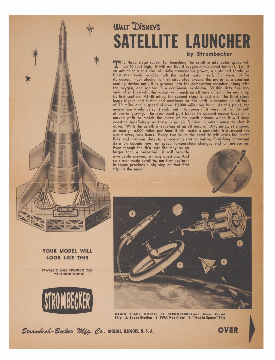 (Strombecker, 1956) An instruction sheet for Walt Disney's Satellite Launcher model kit, manufactured by Strombecker and inspired by the “Man in Space” series. Measuring 8.5” x 11”, the double-sided sheet displays in very good condition with three very faint horizontal creases from the original factory folds and light discoloration from age.