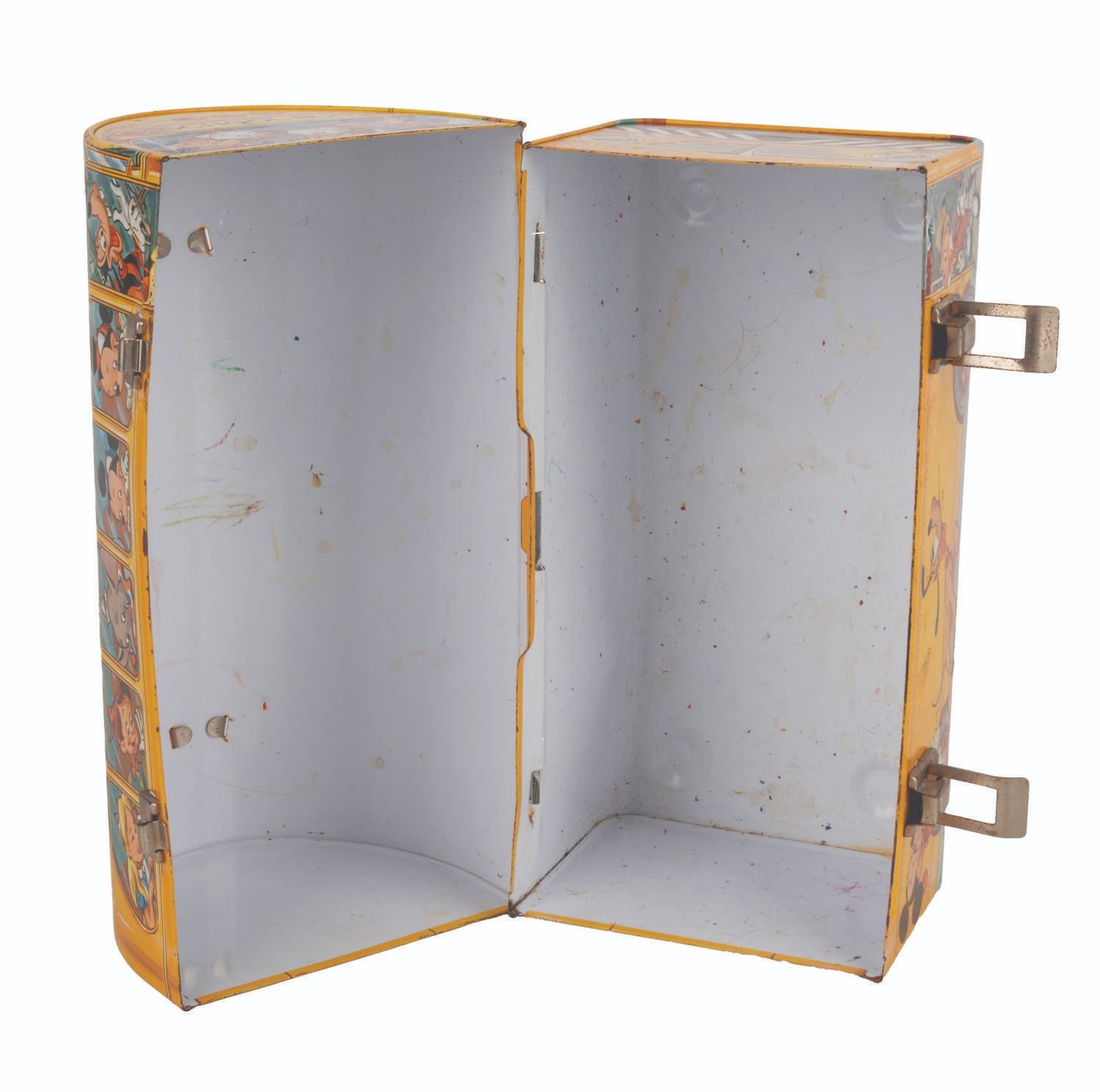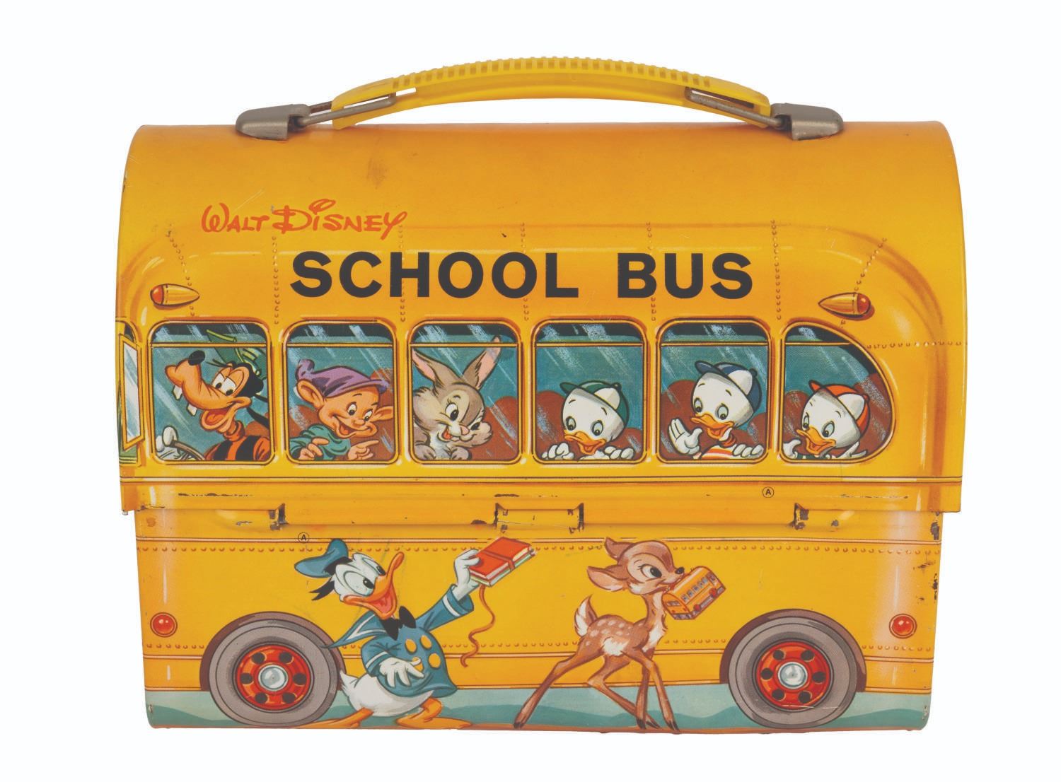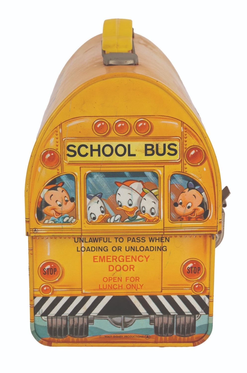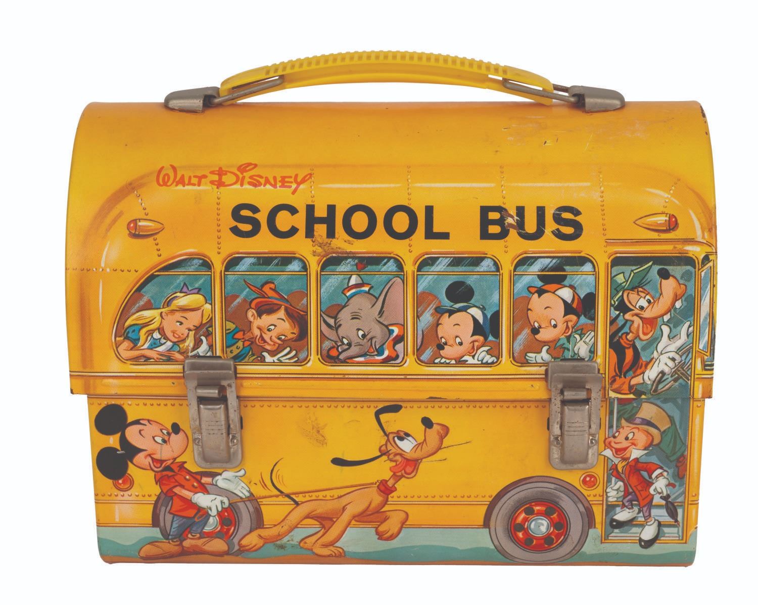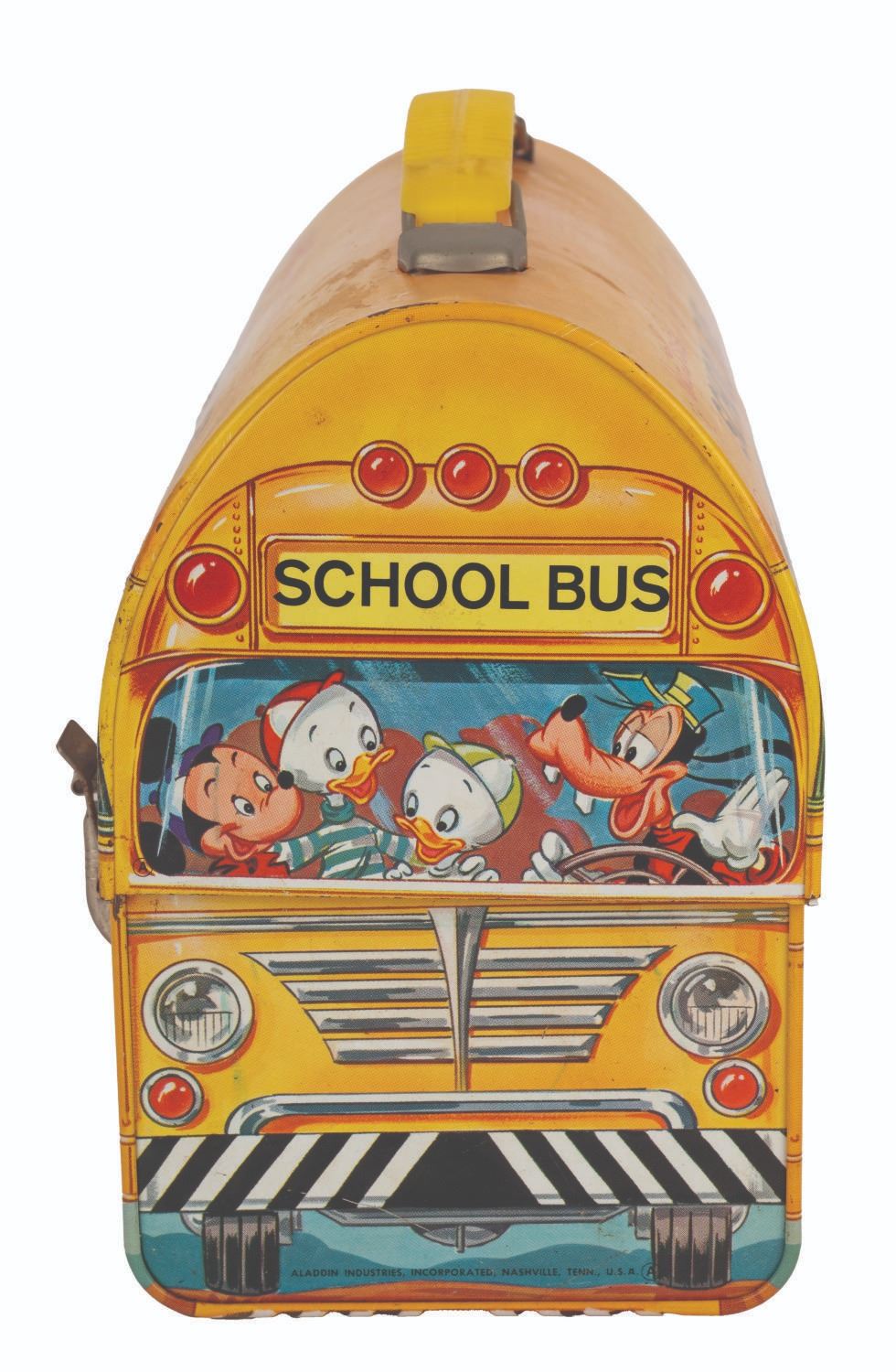 (Aladdin, 1961) An Aladdin Industries "Walt Disney’s School Bus" lunch box featuring 16 popular Disney characters. Measuring 9"x7.75"x4.5", the lunch box is in very good used condition exhibiting minor color fading, stains, light oxidation, scratches, and wear.