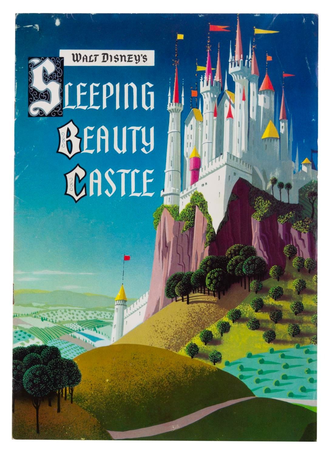 (Disneyland, 1957) A rare souvenir Walt Disney’s Sleeping Beauty Castle booklet featuring text and colorful stills from the animated film, first sold when the Sleeping Beauty Castle Walk-Through attraction opened in 1957. Measuring 7.75” x 11”, the booklet is in fair condition with heavy edge wear and creasing, color loss, and stains.