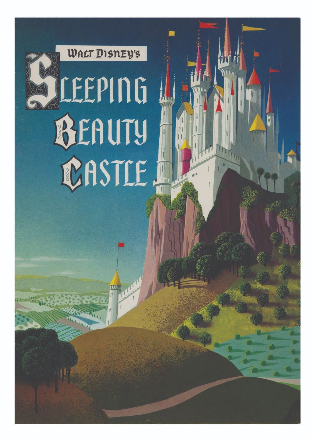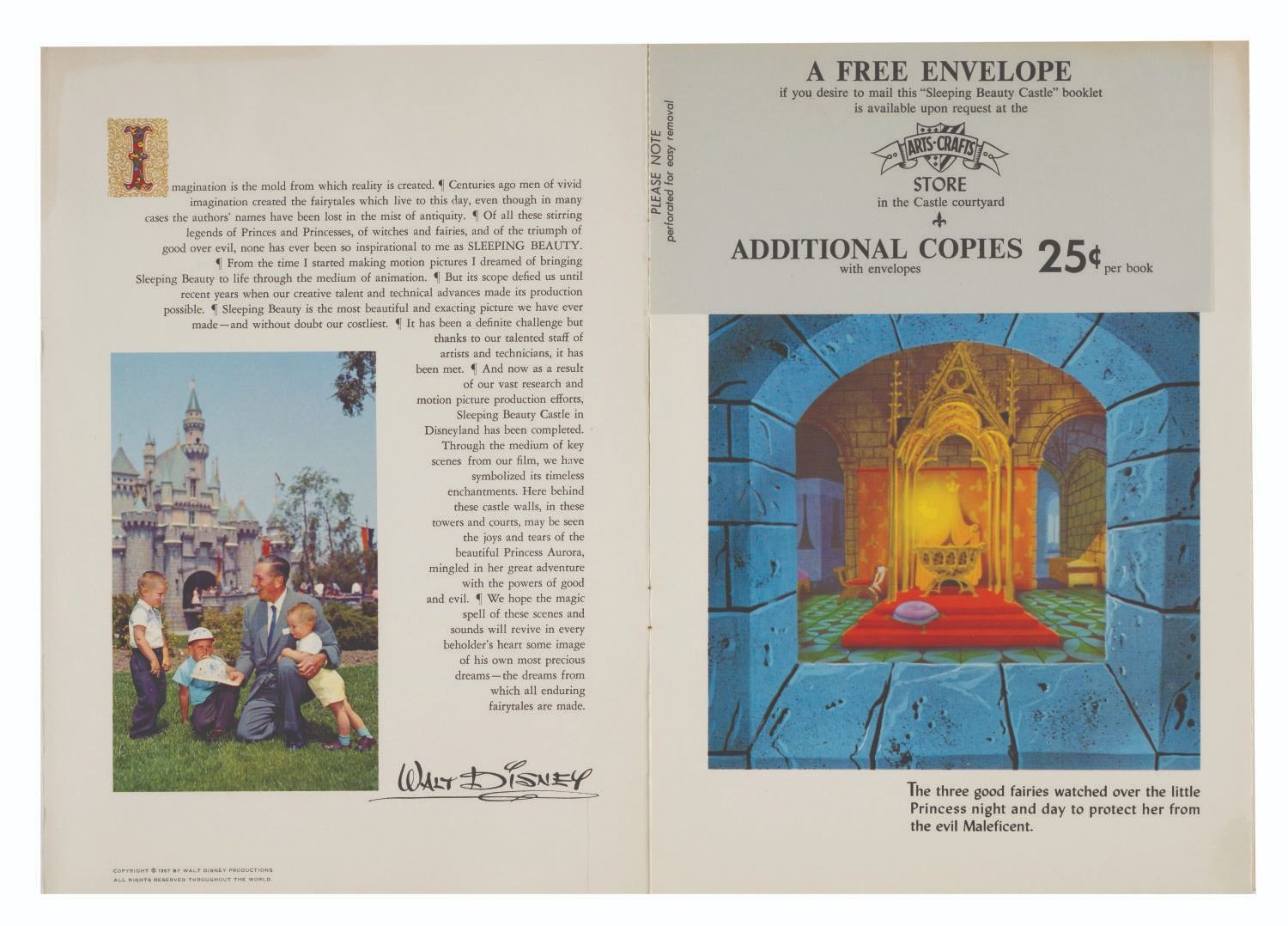 (Disneyland, 1957) A rare souvenir booklet featuring the story and artistry of Sleeping Beauty Castle. This souvenir of Disneyland was issued upon the opening of the Fantasyland attraction, contains text and colorful stills from the animated feature film Sleeping Beauty, on which the castle is based, and retains the very scarce "free envelope" coupon which is often torn out. Measuring 7.75”x11”, this 6-page guidebook is in very good condition with minor wear to edges and corners.