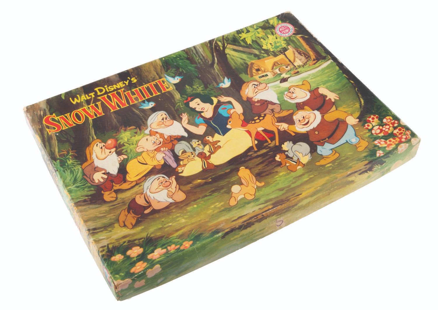 (Multi-Print, 1967) A Snow White stamp pad set made by Multi Print of Milan, Italy. The set contains seven character stamps from the film and accessories. Measuring 8.5" x 12.5" overall with stamps measuring 1.75" x 1.75", the set is in very good condition with typical wear from handling and use, and the ink pad dry from age.